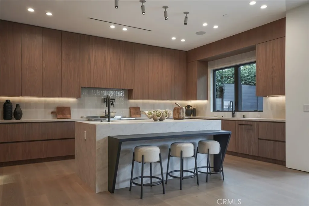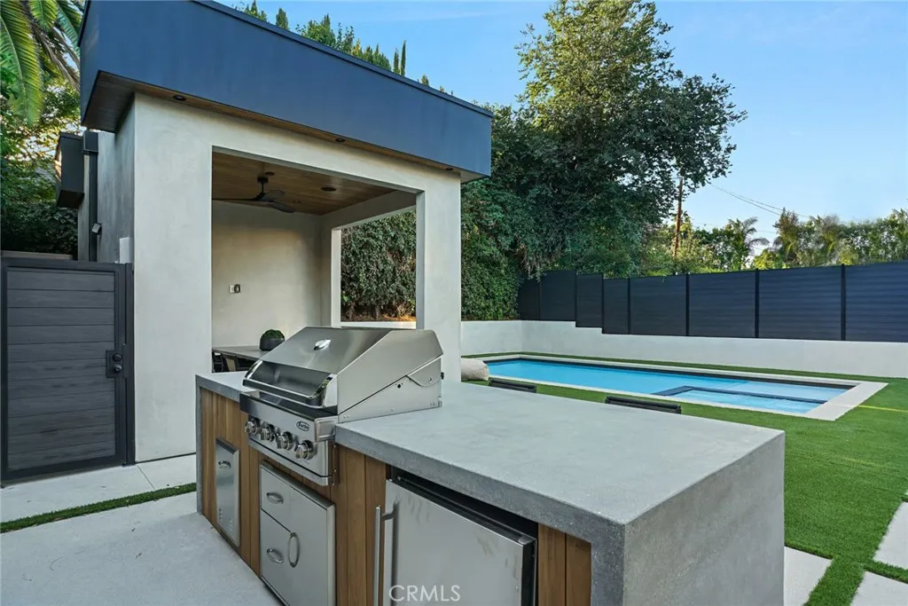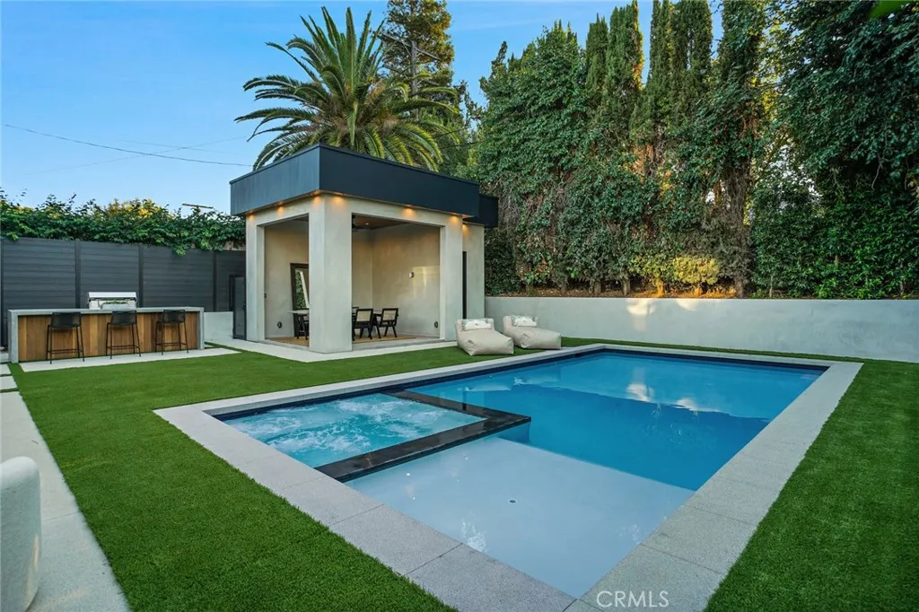 Welcome to this exceptional 5-bedroom, 6.5-bathroom modern masterpiece spanning 5,400 sq ft across three thoughtfully designed levels, complete with ELEVATOR ACCESS to all 3 floors . Perfectly situated just moments from Ventura Blvd, youll enjoy unparalleled walkability to some of the citys best restaurants, cafs, and boutique shopping. As you arrive, the striking architectural faade sets the tone for what lies insidesophisticated elegance with a contemporary edge. Step into an expansive open-concept floor plan featuring soaring ceilings, sleek finishes, and an abundance of natural light. The gourmet chefs kitchen seamlessly flows into spacious living and dining areas, creating the ultimate entertainers layout. Floor-to-ceiling glass doors open to a backyard oasis, where a sparkling pool, spa, and outdoor cabana offer the perfect setting for both relaxation and gatherings under the California sun. Five generously sized bedrooms include a luxurious primary suite with a spa-inspired bathroom, an expansive walk-in closet, and a private balcony showcasing stunning views of the surrounding greenery. From this vantage point, youll feel immersed in nature, with lush trees wrapping the property in beauty and privacy. Every secondary bedroom is en-suite, providing comfort and seclusion for family and guests. A private home theater delivers the ultimate cinematic experience, while the stylish bar in the basement makes entertaining effortless. The home also includes designer walk-in closets, custom cabinetry, a two-car garage with a sleek wood-paneled door, and outdoor dining and loun