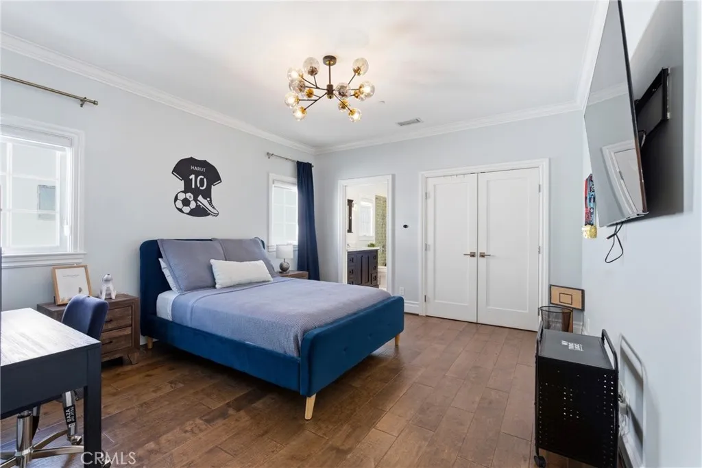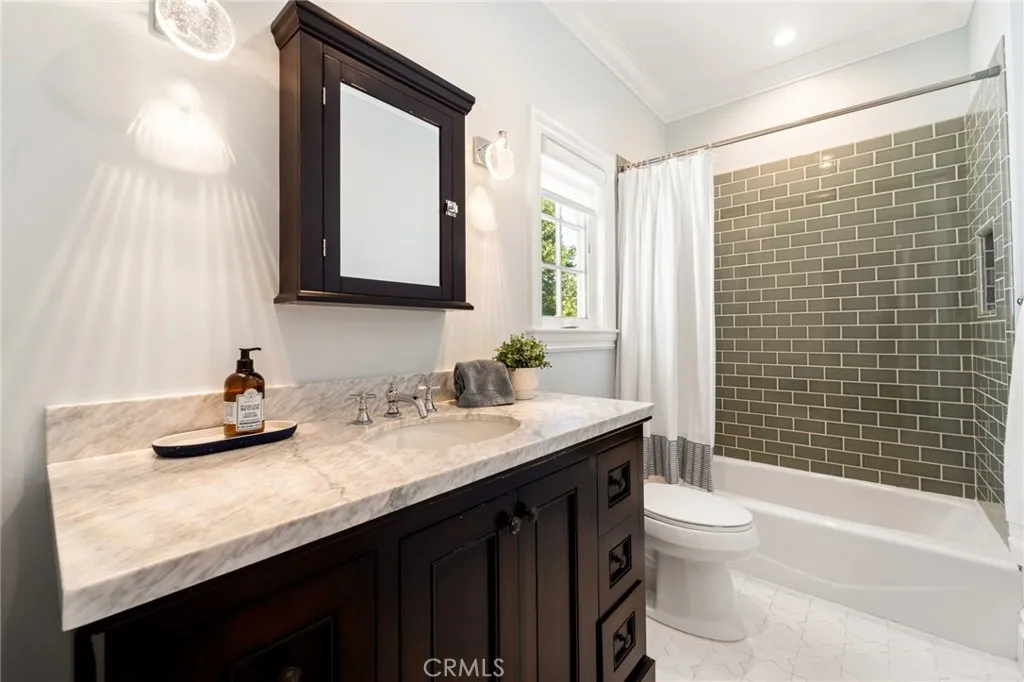 Situated in the heart of Sherman Oaks, this sophisticated Cape Cod home seamlessly blends modern design with timeless character. Enjoy a sprawling open concept floor plan that has been thoughtfully laid out and features high ceilings throughout. A culinary enthusiast's dream, the gorgeous chef's kitchen is equipped with high-end stainless steel appliances, marble countertops, a walk-in pantry, large island with seating and sun drenched breaktast nook. Double french doors in the adjoining family room allow you to enjoy indoor/outdoor living. Completing the main level is a spacious formal living and dining room, perfect for dinner parties and family gatherings, and an ensuite bedroom. On the upper level there are four generously sized bedrooms and a laundry room. All bedrooms in the home are significantly larger than those typically found in brand new construction homes. The primary suite offers dual walk-in closets, vaulted wood beamed ceiling and French doors that lead out to a private balcony. Unwind in the spa-like primary bathroom, complete with a soaking tub, rainfall shower, dual vanities and imported Italian marble. Enclosed by mature ficus trees, the private backyard retreat was designed with entertaining and relaxation in mind. There's a sparkling pool/spa, cabana with a fireplace, covered patio, sauna and outdoor wet bar with seating. Additional amenities include smart home features, built-in speakers, a security system, finished two car garage and gated driveway. This property is located within the highly regarded Dixie Canyon School District, and walking distance