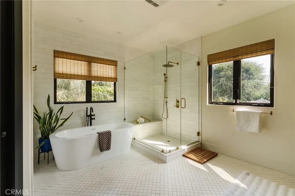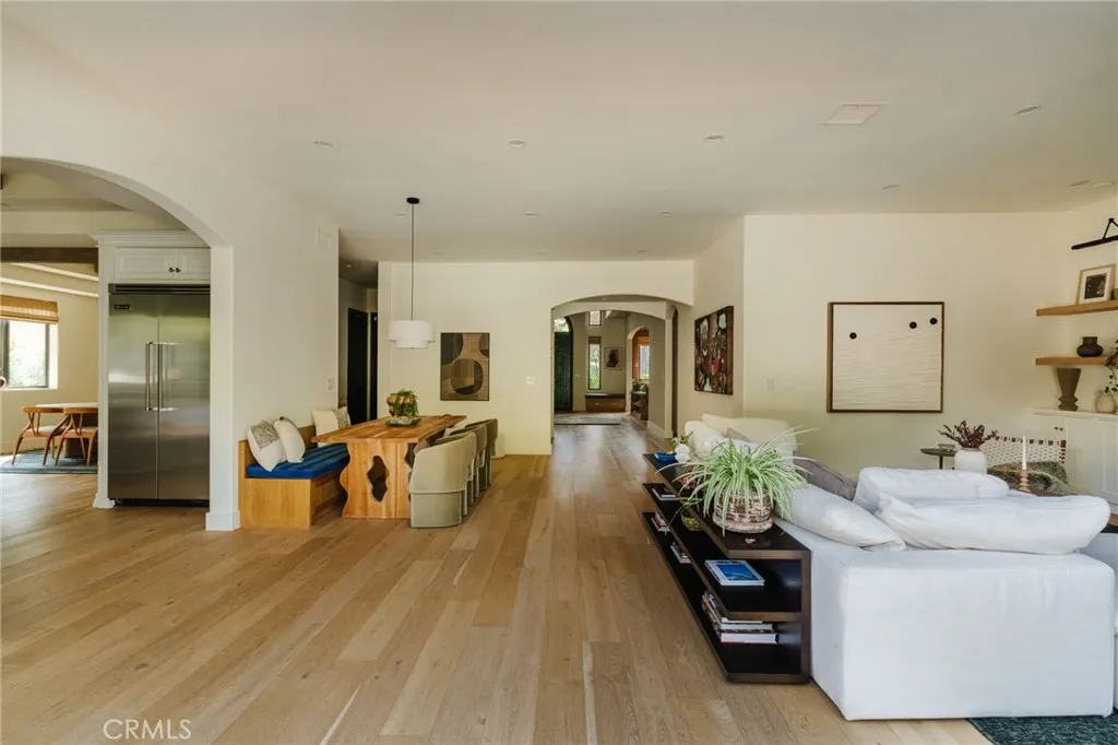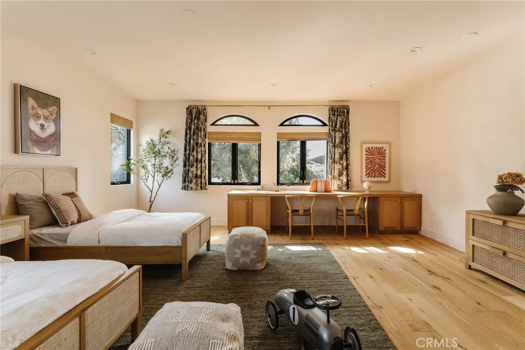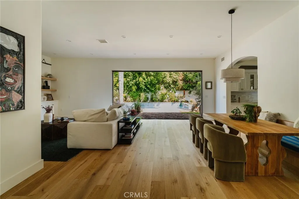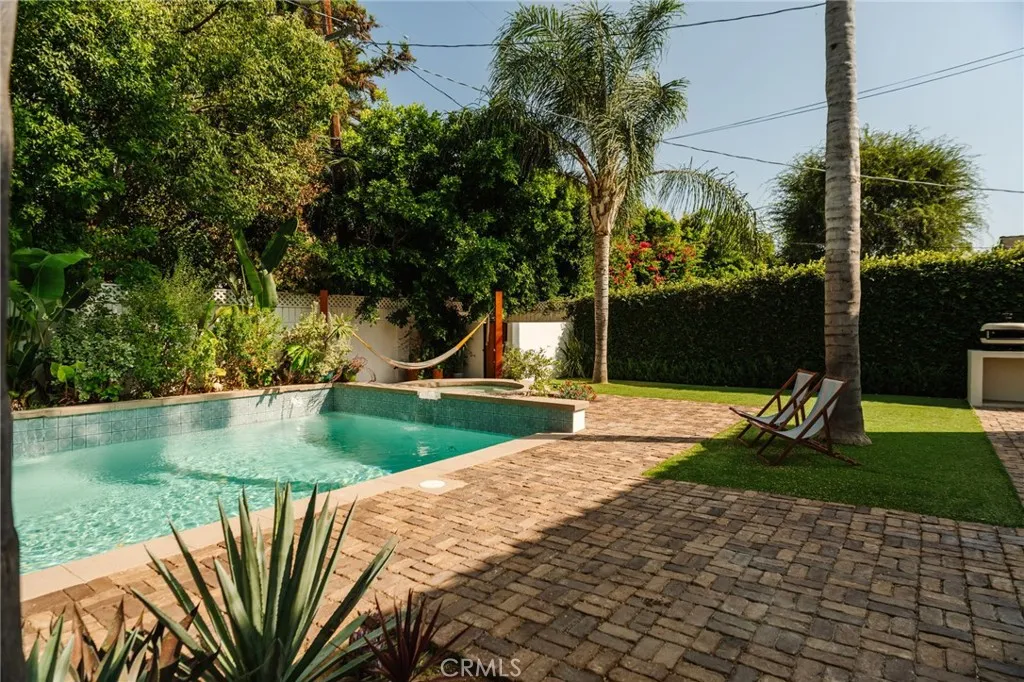 Tucked away in a prime Sherman Oaks neighborhood, this contemporary Mediterranean estate has been fully updated, blending sophisticated designer finishes with unique and personal touches. Designed by notable Architectural Digest Top 100 interior designer, Mandy Cheng, this property is a statement. Upon entering, youre greeted by double doors that lead into a grand foyer with soaring double-height ceilings, setting the tone for the homes spacious and inviting atmosphere. One of the homes standout features is the formal living space/library room, designed to offer a peaceful escape. It houses custom-built shelves and nooks for reading, making it the perfect space for relaxation and creativity. The open-concept main living space includes a family room with a sleek fireplace surrounded by custom built-ins, stunning warm colors, a beautiful chefs kitchen outfitted with top-of-the-line Viking appliances, and both formal and informal dining areas perfect for hosting family and friends. With floor-to-ceiling glass doors that pocket, this creates the perfect indoor-outdoor entertainment space, flowing into your nearly 8,000 square foot lush backyard. The first floor also includes a laundry room, a bedroom, a full bathroom, and a powder room. Upstairs, youll find two luxurious primary suites. The larger of the two features an intimate fireplace, private balcony, spacious walk-in closet, and a spa-like bathroom complete with a soaking tub, rainfall shower system, and double vanity. Additionally, two generously sized bedrooms with custom closets offer ample space for family or guests.