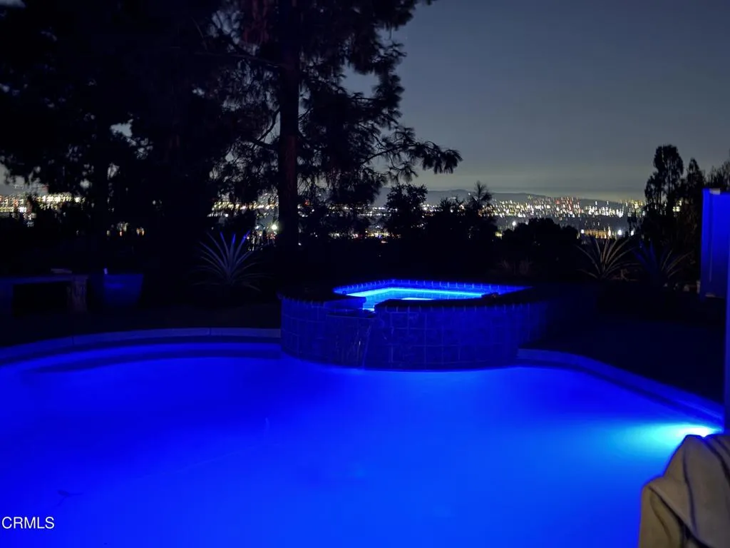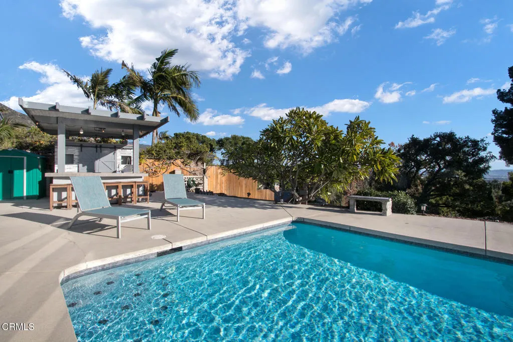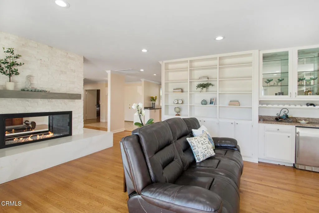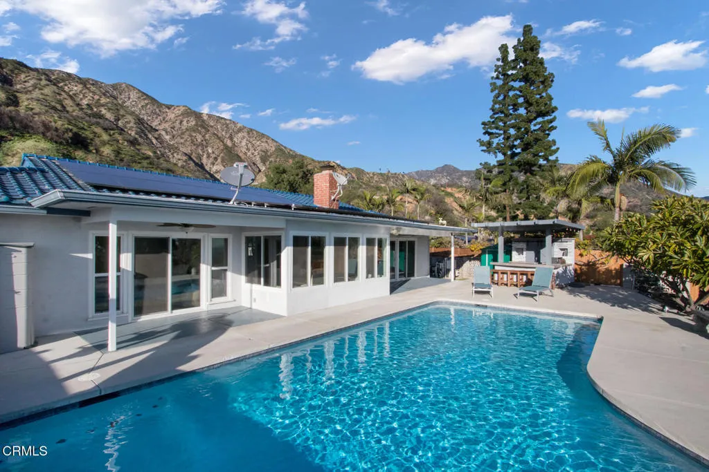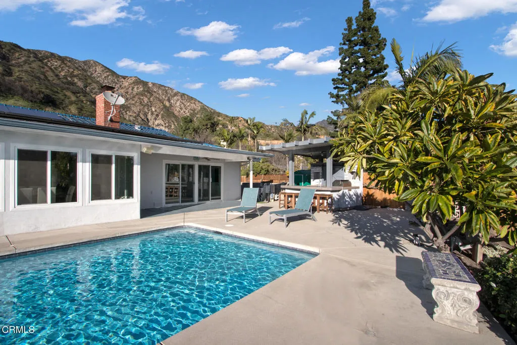 Spectacular panoramic views are captured in this sprawling single-level 3-bedroom, 3-bath home, ready to move in. Nestled on a tranquil hillside in the quaint community of Sierra Madre, this Modern Home, boasting its Open Floor Plan, is illuminated in natural sunlight and views! Enter through the double doors of this home, and you are instantly captivated by panoramic views overlooking the sparkling pool with spa. Cozy up to the custom wraparound quartz-and-stone fireplace that divides the large open living room and family room. The family room boasts custom-built-in bookshelves, cabinetry, and a beverage bar with an ice machine. There are glass sliders that open to the south-facing rear yard, which includes a pool with a spa, a barbecue island with a sink, refrigerator, and a large outdoor television, all set against gardens and framed by spectacular views of the San Gabriel Valley and mountain range. The remodeled, open, modern kitchen has been polished with custom glass tile and quartz countertops, and Thermador and Kitchenaid built-in appliances. Featuring an island with a double sink and an eat-in breakfast bar. The kitchen has large north-facing windows that capture beautiful mountain views. Off the kitchen, you will find the laundry room with a utility sink, large pantry cabinetry with pull-out shelves, and a guest bathroom.The grand hallway is lined with custom California Closet cabinetry, leading you to the three bedrooms. The first bedroom features a built-in desk and fireplace, ideal for a home office or a student. At the end of the hallway, you will find a secon