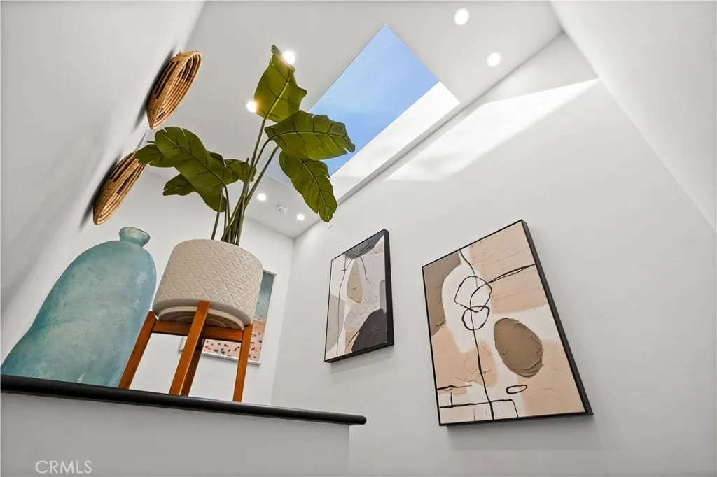 Experience contemporary living in this stylish and private corner unit in the heart of Silver Lake. The open-concept living and dining areas greet you with finished concrete floors, thoughtful custom touches, and sliding glass doors on both sides that extend the living space to two inviting outdoor patios. The remodeled kitchen is beautifully updated with quartz countertops, a soft sage-green backsplash, modern two-tone cabinetry, and stainless steel appliances. The cozy living room includes a fireplace and a generous closet, additionally the first floor also features a contemporary powder room with a floating vanity, wall to wall mirror, gunmetal fixtures and the convenience of an in-unit washer and dryer. As you head upstairs, natural light pours in through the skylight, brightening the stairwell and hallway. The primary suite feels like a serene retreat with high ceilings, motorized shades, a large closet, a sleek ceiling fan, and sliding doors that open to a private balcony. Its spa-like bathroom showcases a custom his-and-hers wooden vanity with bronze fixtures, backlit mirrors, a mirrored closet door, and a stunning open wet room with a contemporary walk-in shower, glass divider, and modern tilebeautifully enhanced by tall windows that fill the space with natural light. The secondary bedroom features a dramatic skylight, two generous closets, sliding doors to its own private patio, and an updated en-suite with modern tilework, a floating vanity, a glass-enclosed shower with bronze fixtures, and chic black accents such as a towel warmer and faucet. Throughout the home,