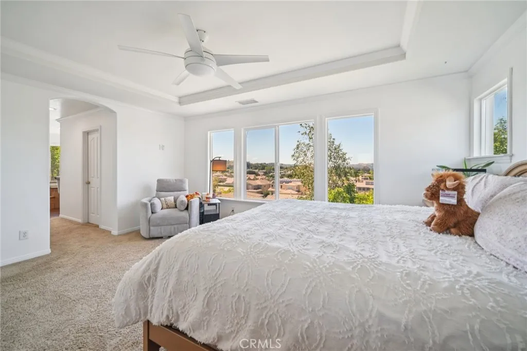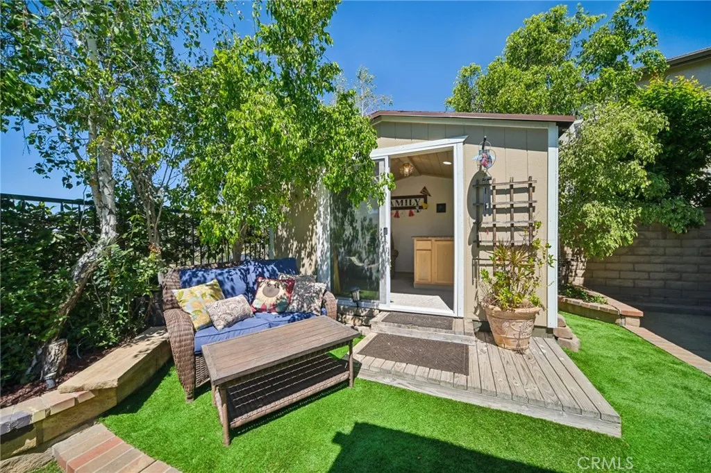 Tucked at the end of a cul-de-sac in Simi Valley, this beautifully maintained view home features 4 bedrooms plus an optional 5th bedroom and sweeping 180 city views. Built in 2001, the home welcomes you with a front porch seating area and a grand living room featuring soaring approximately 20 foot ceilings, abundant natural light, and a ceiling fan. The downstairs showcases tile flooring, plantation shutters, and a warm, inviting family room with a stacked stone fireplace and custom mantle. A barn door connects the living space to the kitchen, where youll find granite countertops, a center island, custom backsplash, stainless steel appliances, built in microwave, recessed lighting, a dining area, and a separate breakfast bar seating area for added function and everyday gathering. A standout feature of the home is its versatile floor plan, which includes a downstairs bedroom plus an additional downstairs bonus room currently used as a bedroom, ideal for guests, a home office, den, playroom, or flex space. A full downstairs bath offers a walk in shower, granite countertops, and custom tile work. Upstairs, custom wrought iron stair rails lead to spacious secondary bedrooms, a Jack and Jill bath with dual sinks, a separate laundry room with built in cabinetry, and a private primary suite with double door entry, ceiling fan, breathtaking sunset views, two large walk in closets, separate vanities, walk in shower, and a jetted soaking tub positioned to take in the scenery. The backyard is designed for both relaxation and utility, with stamped concrete, a covered patio with lightin