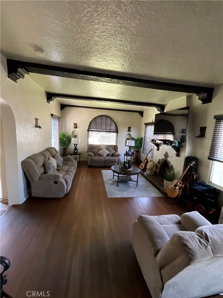 This is a Spanish-style home with Exceptional Charm in South Gate! This 3-bedroom, 2-bath blends authentic architectural details, situated in a prime location near shopping plazas, freeways, and top-rated schools. The home has a classic Spanish tile roof, known for both its insulation benefits and timeless curb appeal. A stylish, solid embossed spiral metal entry gate complements a beautifully landscaped garden, adorned with palm trees. The tile floor and arched entryway lead to a custom, dark brown-print door and a welcoming chandelier. Inside, youll find original hardwood floors, white walls, and exposed dark wood ceiling beams that showcase the home's rustic Spanish charm. The spacious living room features a classic chimney fireplacea perfect layout for both entertaining and everyday living. The dining area allows for a large family dinner table. The primary suite features vaulted ceilings, an en-suite bathroom, and a walk-in closet, while two additional bedrooms share a fully remodeled hallway bathroom. The kitchen and cozy breakfast nook are warm and inviting.
