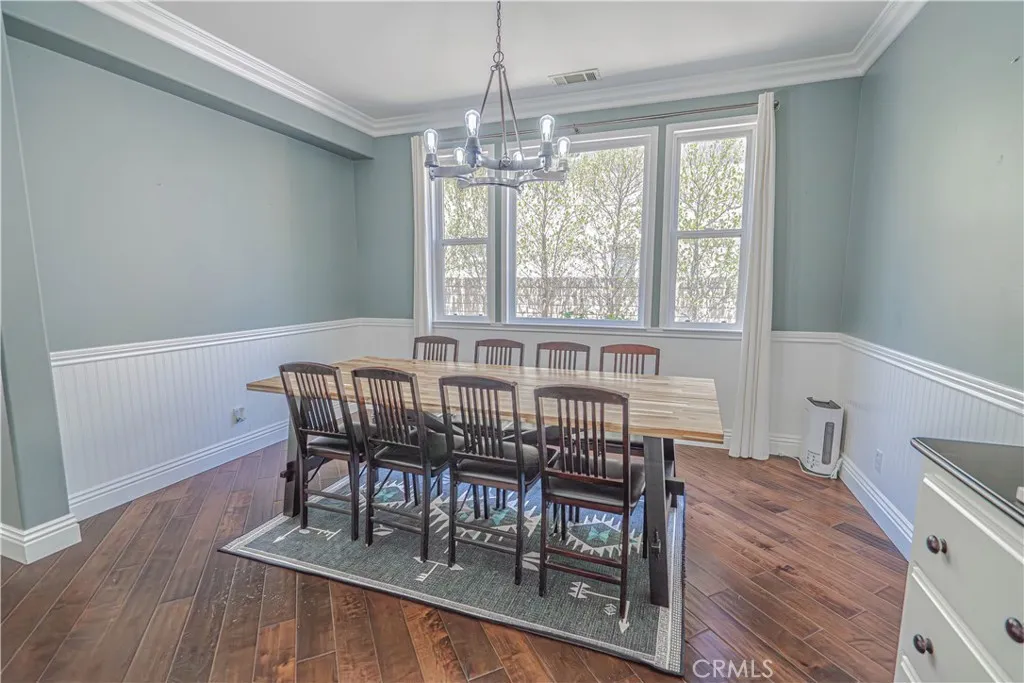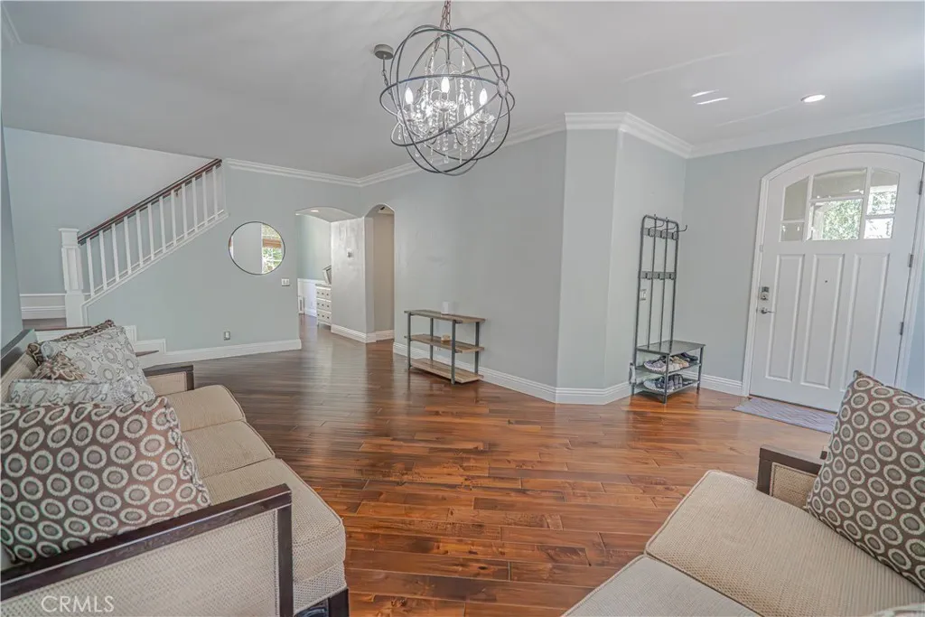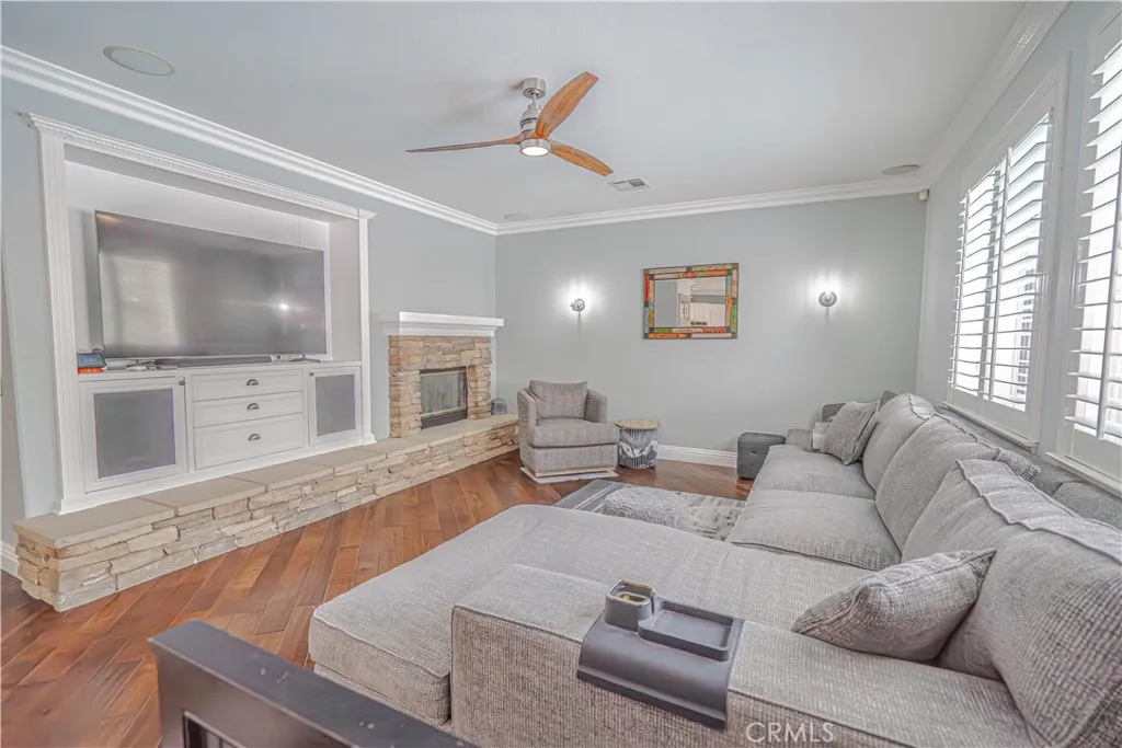 Situated at the peak of Stevenson Ranch on a quiet cul-de-sac, this stunning executive residence offers resort-style living with every modern convenience. Designed for both elegance and function, this spacious home features 5 bedrooms (including one on the main level), 3 bathrooms, formal living and dining areas, an expansive great room, and an oversized upstairs loft that adapts easily to your needswhether its a media room, home office, gym, or play space. Inside, rich dark walnut hardwood floors, designer paint tones, and custom lighting create a sophisticated yet inviting atmosphere. The gourmet kitchen is a showstopper with refaced cabinetry, quartz countertops, a custom oversized butcher block island, stainless steel appliances, subway tile backsplash, and built-in display shelving. The adjoining great room is warm and welcoming with a stone-accented fireplace and built-in media center. Upstairs, the luxurious primary suite is a true retreat with vaulted ceilings, a romantic fireplace, and views overlooking the beautifully landscaped backyard. The ensuite bathroom has been completely reimagined with double shaker-style vanities wrapped in marble, an elegant soaking tub with marble accent wall, and an oversized walk-in shower outfitted with multiple sprays and premium fixtures. A custom barn door leads to a professionally organized walk-in closet. The secondary bedrooms are generously sized, and two of them share access to a charming balcony with sweeping views of the neighborhood and nearby mountains. The hall bath includes updated cabinetry, dual sinks with quartz cou