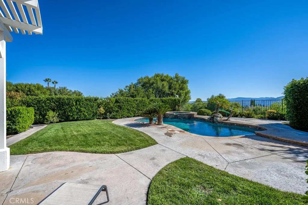 One-of-a-kind 5-bedroom home with dual staircases, ideally situated at the end of a quiet cul-de-sac in highly sought-after Stevenson Ranch. This exceptional property boasts the largest entertainers backyard on the street, featuring a sparkling pool and spa, outdoor kitchen with grill and sink, a stunning brick fireplace, expansive grassy area, and breathtaking 360-degree viewsperfect for hosting or unwinding in your private oasis. Step inside to discover new flooring and fresh neutral paint throughout. The entry opens to a light-filled formal living room with high ceilings and a cozy fireplace. French doors lead to a charming courtyard, ideal for morning coffee or evening relaxation. Through an arched doorway, the elegant formal dining room showcases hardwood floors and a recessed ceiling. Another arched entry welcomes you into the spacious family room with a second fireplace and a chefs kitchen complete with granite countertops, white cabinetry with brushed silver hardware, stainless steel appliances, center island, and breakfast nook. A glass door seamlessly connects the indoor living space to the expansive backyard. The main level also includes a bedroom with new carpet, ceiling fan, mirrored closet doors, and a full bathroom with a walk-in showerperfect for guests or multi-generational living. Upstairs, accessible via one of two staircases, the luxurious primary suite offers new carpet, ceiling fan, and beautiful valley views. The ensuite bath features new vinyl plank flooring, dual vanities, a soaking garden tub, walk-in shower with dual showerheads, and an oversized