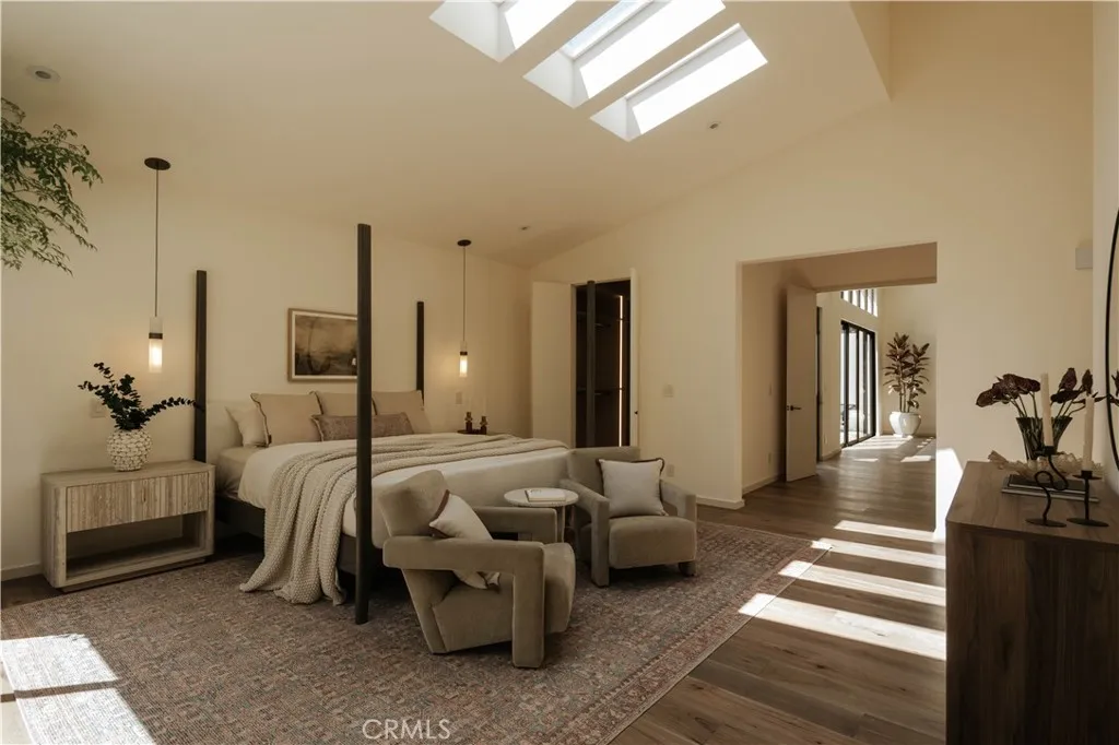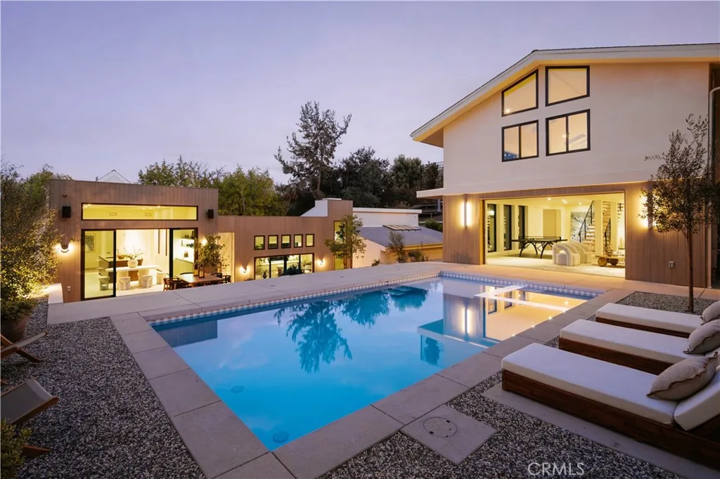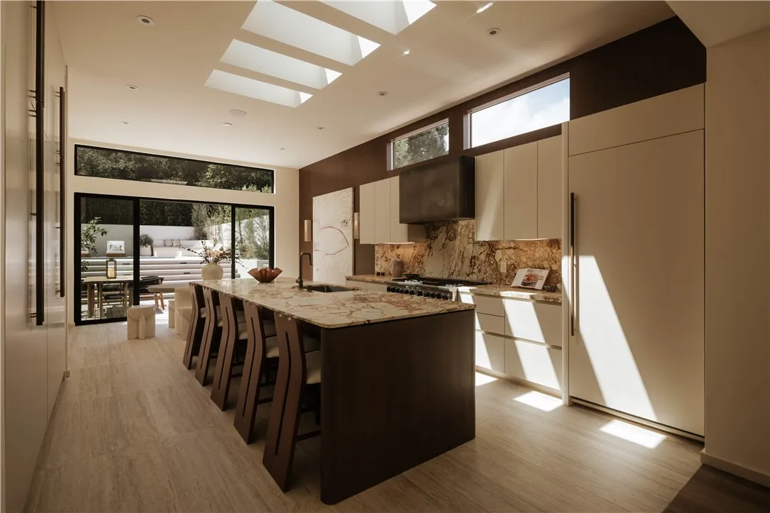 Set in the coveted Silver Triangle of Studio City and within the highly sought-after Carpenter School District, The Laurel Haven Residence has been completely reimagined undergoing a full-scale renovation defined by exceptional scale, design, and craftsmanship. Landscaping surrounds the home with ornamental grasses, sculptural plantings, and lavender gardens, creating a tranquil modern California setting. Designed with a refined contemporary aesthetic, the home blends clean architectural lines, curated natural materials, and interlocking indoor-outdoor living, embodying the essence of the Southern California lifestyle. Inside, the home features a curated palette of luxury materials and designer finishes, including premium hardwood flooring, Silver Travertine, Roman Imperiale quartzite, limestone accents, and Breccia marble surfaces. Custom architectural millwork and Dal Lusso cabinetry elevate the interiors with warmth and sophistication. At the heart of the home is a designer chefs kitchen featuring an oversized island with custom stained wood cabinetry and integrated high-end appliances. Thoughtful architectural lighting and refined stone surfaces create a space ideal for both everyday living and entertaining. Designed for California indoor-outdoor living, the property offers multiple outdoor spaces including a dining patio, kitchen deck, pool terrace, landscaped courtyard, and private entertaining areas. The primary suite serves as a private retreat with a spa-style bathroom, custom closet design, and an ensuite foyer for added comfort and convenience. A fully independen