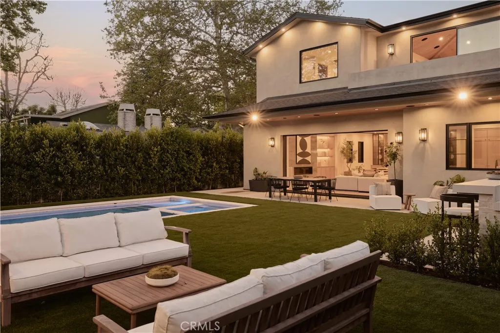 Set behind private gates on an expansive 9,000+ sq. ft. lot, this newly constructed architectural estate features a detached two-bed, one-bath ADU. Designed for modern living, the open-concept main level flows effortlessly from the spacious living and dining area into the designer chefs kitchen, equipped with top-of-the-line appliances, sleek custom cabinetry and a stunning waterfall island. An oversized sliding glass door disappears into the wall, seamlessly extending the living space to the entertainers backyard retreat, where an outdoor kitchen with bar seating invites al fresco dining, and a sparkling pool and spa create a private resort-like escape. Completing the main level is a state-of-the-art home theater, ensuite bedroom and chic powder bathroom. Upstairs, four generously proportioned ensuite bedrooms are complemented by a dedicated laundry room. The primary suite is a true retreat, boasting a private balcony, custom walk-in closet and spa-inspired bathroom with a soaking tub, rainfall shower, double vanity and smart toilet. Additional features include high ceilings throughout, a two-car garage and fully integrated Control4 smart home system that manages lighting, climate, audio and security. The detached ADU offers incredible flexibility, with its own living room, full kitchen, two bedrooms and a bathroom, perfect for guests, extended family or as additional living space. Situated on a quiet tree-lined street, this property is ideally located within the coveted Dixie Canyon School District and just moments away from Ventura Boulevard, Westfield Fashion Square, th
