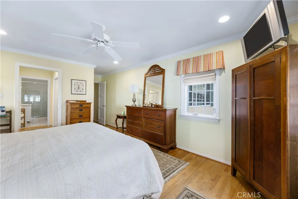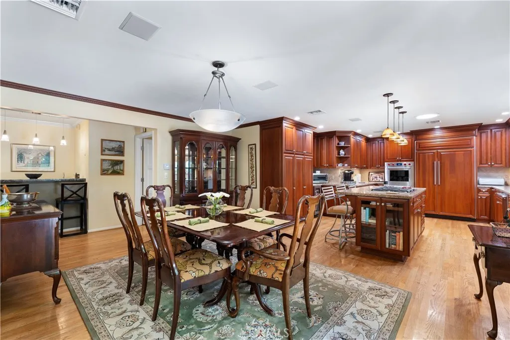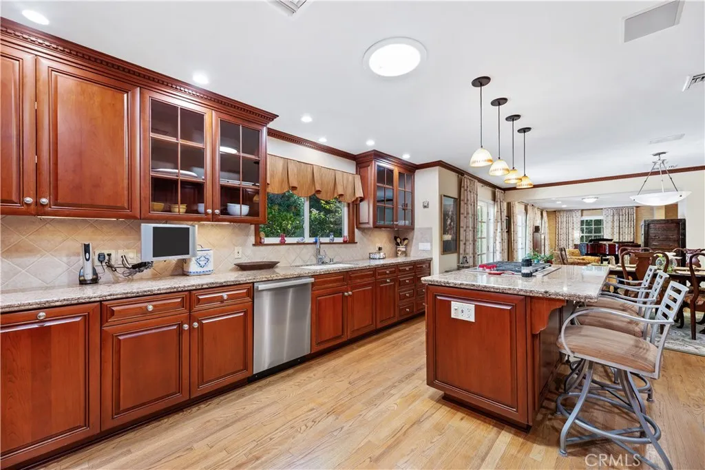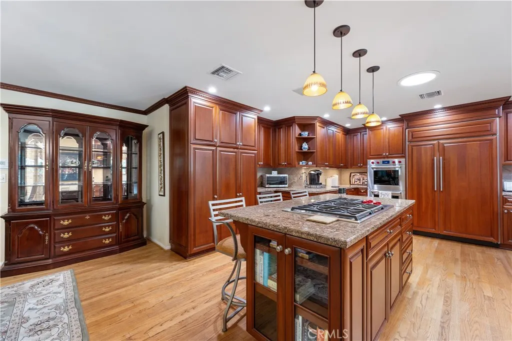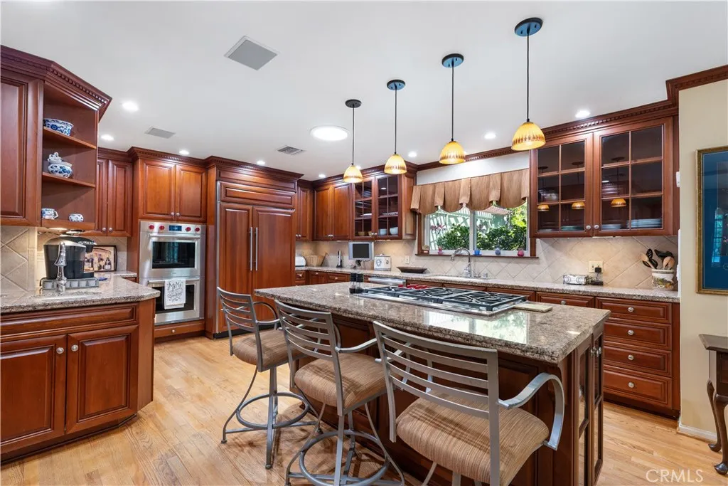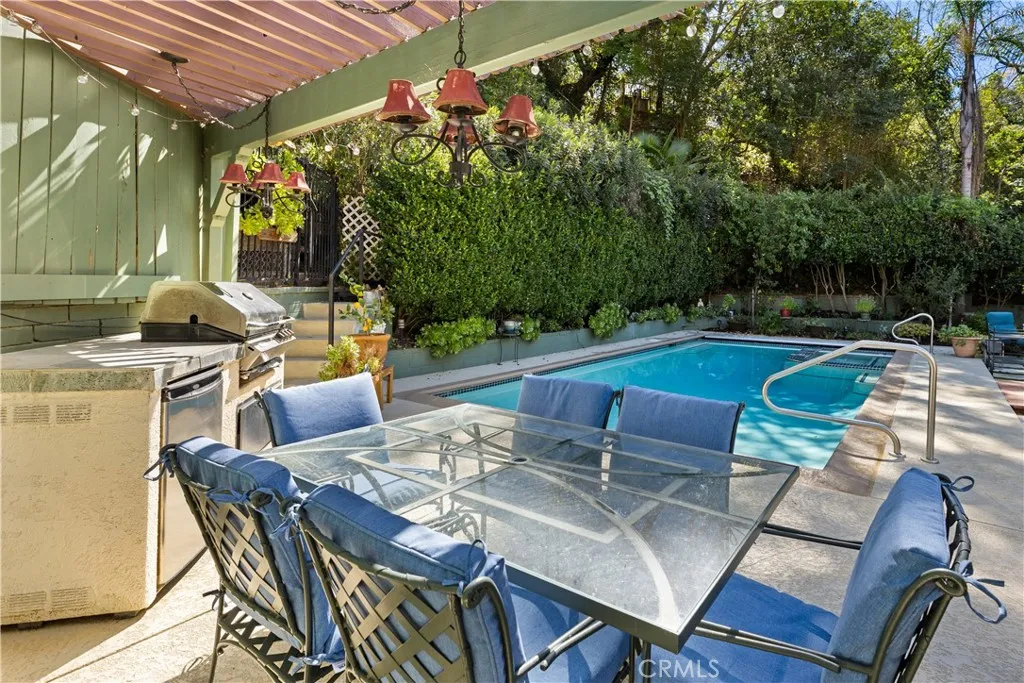 Nestled in the serene hills of Studio City, this pool home offers a perfect blend of traditional elegance and modern California living. Situated in the desirable Carpenter Avenue Charter School boundaries, this 2,305-square-foot residence features three spacious bedrooms and three bathrooms, all meticulously maintained and designed for both comfort and style. The homes prime location on a dead-end street ensures minimal traffic and enhanced privacy, while its elevated position and lush landscaping provide immediate curb appeal, anchored by a charming brick staircase and a spacious attached garage. The heart of the home is an expansive living area characterized by warm wood floors, elegant crown molding, and an abundance of natural light streaming through large windows and skylights. A handsome stone fireplace serves as a focal point in the family room, creating a cozy atmosphere for gatherings, while multiple sets of French doors invite you to enjoy the seamless indoor-outdoor flow that defines the Southern California lifestyle. The gourmet kitchen is a chef's dream, boasting rich wood cabinetry, granite countertops, a large center island with integrated seating, and professional-grade stainless steel appliances including a built-in double oven and wine refrigeration. The private quarters are thoughtfully arranged, featuring a primary suite that acts as a true sanctuary with its own walk-in closet corridor and a spa-like ensuite bathroom. Outside, the backyard serves as a multi-leveled private oasis centered around a sparkling swimming pool and surrounded by mature foliage