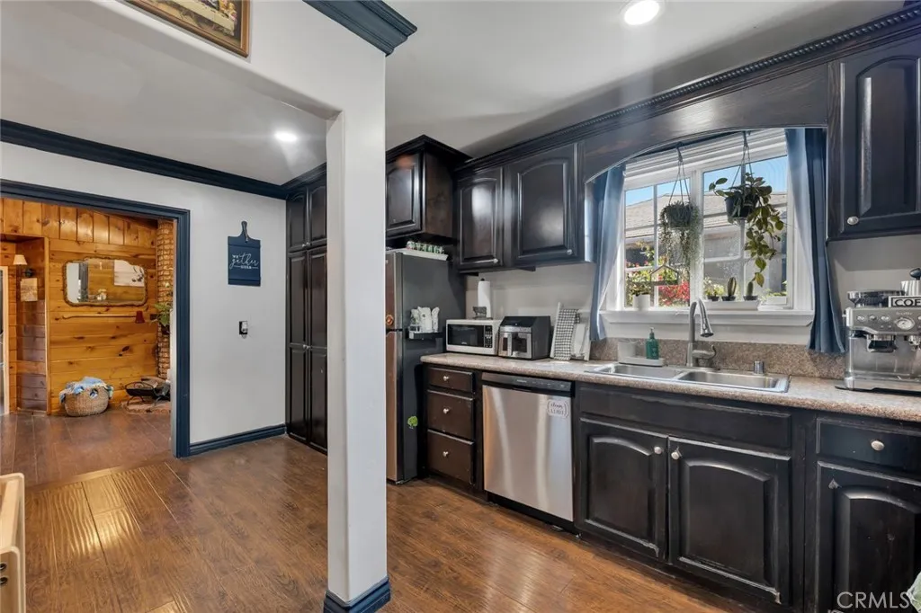 Discover this Sun Valley gem offering space, style, and versatility with 4 bedrooms and 3 baths. The open-concept living, dining, and kitchen areas feature plank flooring, granite counters, and stainless steel appliances, creating a welcoming flow ideal for entertaining. The expansive primary suite includes a walk-in closet and a remodeled spa-style shower built for two. Step down into a stunning family room with solid wood paneling, high ceilings, and a cozy fireplaceperfect for relaxing evenings. Another step leads to a den with a laundry area, an additional bathroom, and the fourth bedroom, ideal for guests or extended family. The huge backyard offers endless possibilitiesroom for a pool, entertaining, or even an ADU. Energy-efficient solar panels help keep utility costs low, while a large storage room, extra shed, and ample gated parking for multiple vehicles complete this exceptional home that blends charm, comfort, and practicality.