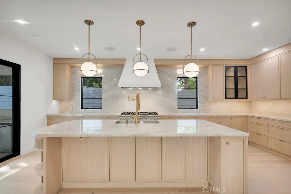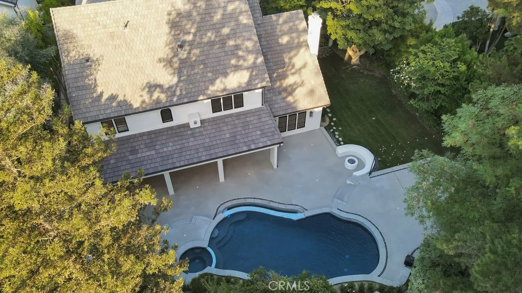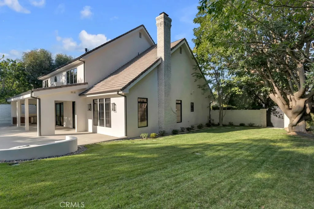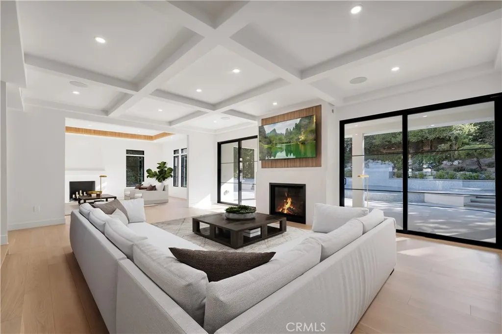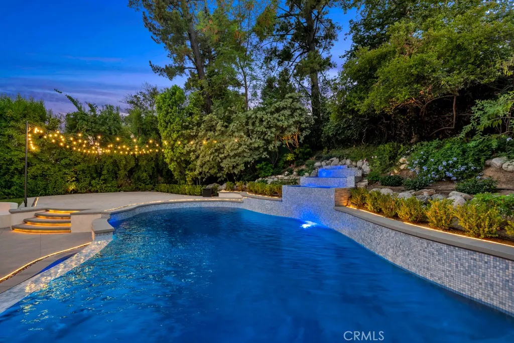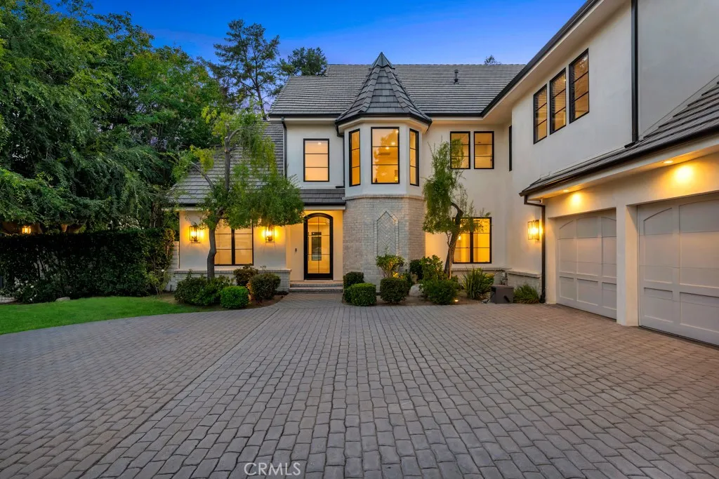 Set within a private gated community, this Modern Tudor estate on a cul-de-sac, has been completely reimagined, blending timeless architecture with modern luxury. Spanning 4,720 square feetincluding a 400 sq. ft. enclosed patio on an 18,317 sq. ft. flat lot, the home offers 5 bedrooms, 5 bathrooms, and a separate office, thoughtfully designed for both elegant entertaining and comfortable everyday living. A grand two-story foyer makes a striking first impression, leading to expansive light-filled interiors. At the heart of the home, the gourmet kitchen showcases Taj Mahal quartzite countertops, custom cabinetry, and professional-grade appliances. The kitchen flows seamlessly into a family room with coffered ceilings, creating a warm and sophisticated gathering space. A separate formal living room and dining room with designer-detailed ceilings add to the homes refined character and provide ideal settings for entertaining. Three fireplaces throughout the homelocated in the family room, living room, and primary suiteadd timeless charm and comfort. The primary suite serves as a private retreat with a spa-like bathroom featuring designer finishes and a very spacious walk-in closet. Additional bedrooms are spaciously sized and versatile, ideal for family or guests. The dedicated office provides a quiet, professional space for todays lifestyle needs. The private entertainers yard offers resort-style living with a sparkling pool and spa featuring waterfalls, a fully equipped BBQ island with ample seating, an outdoor kitchenette, and multiple lounging areas. Elaborate landscape ligh