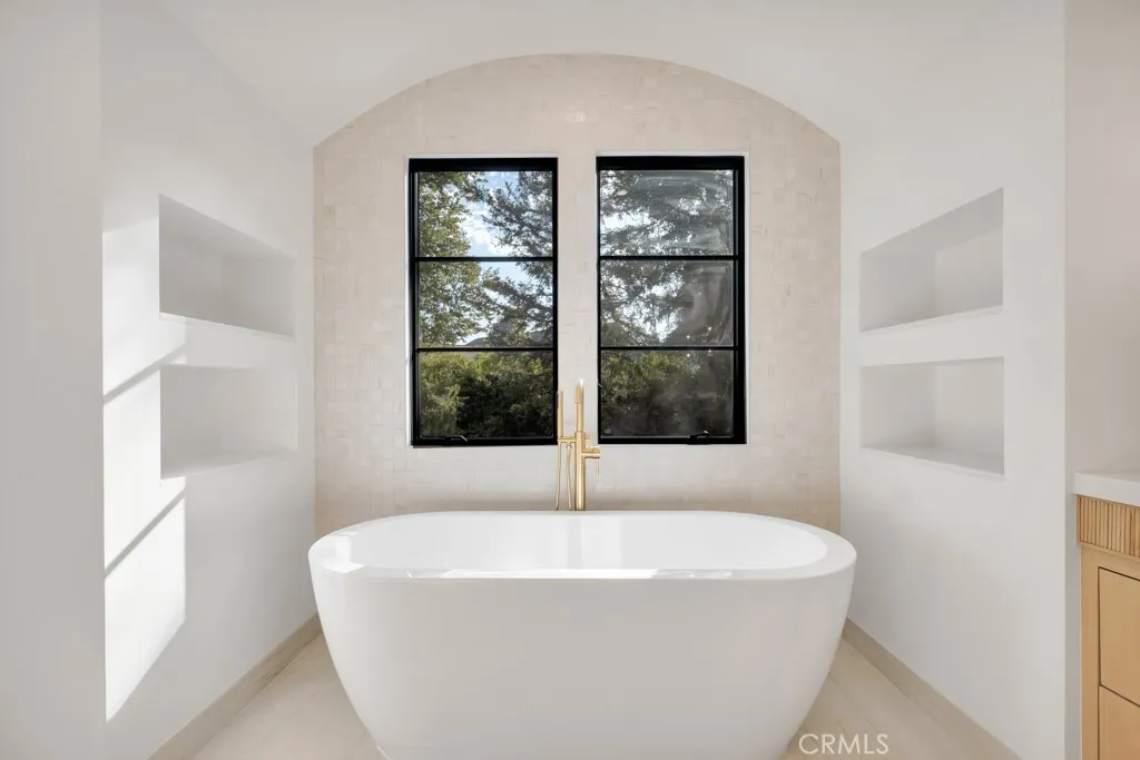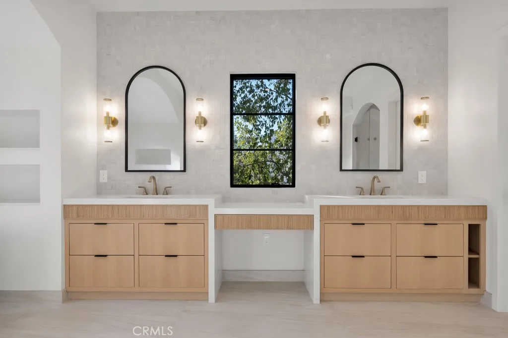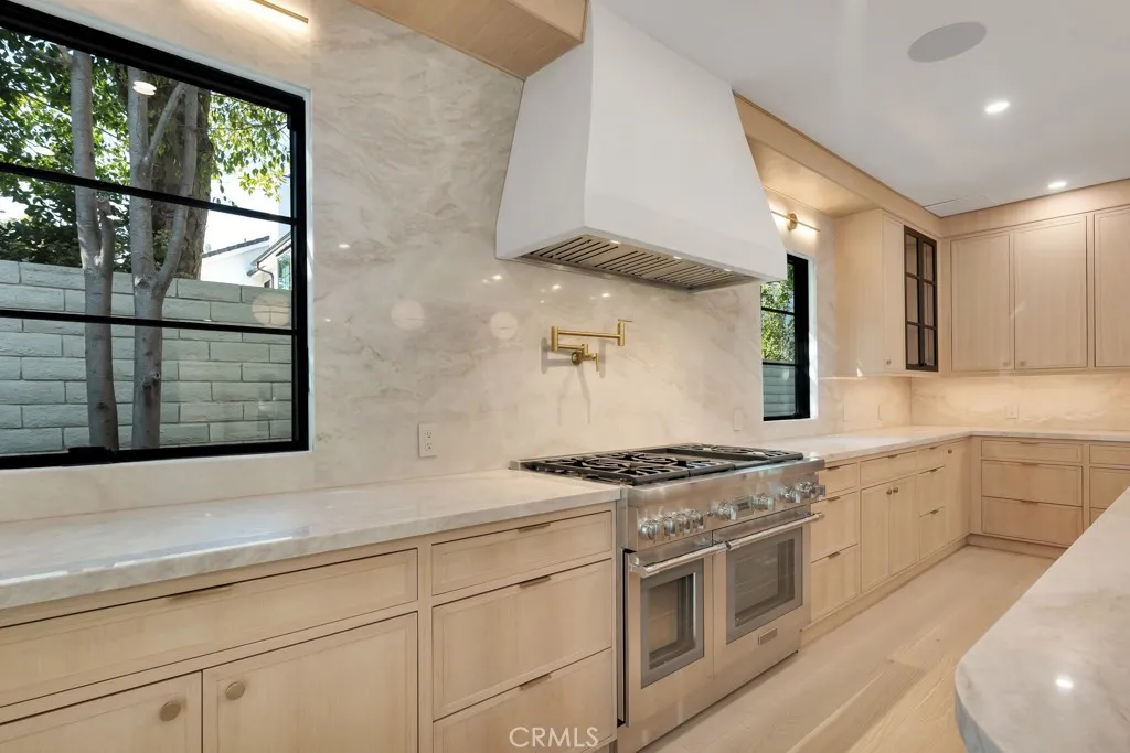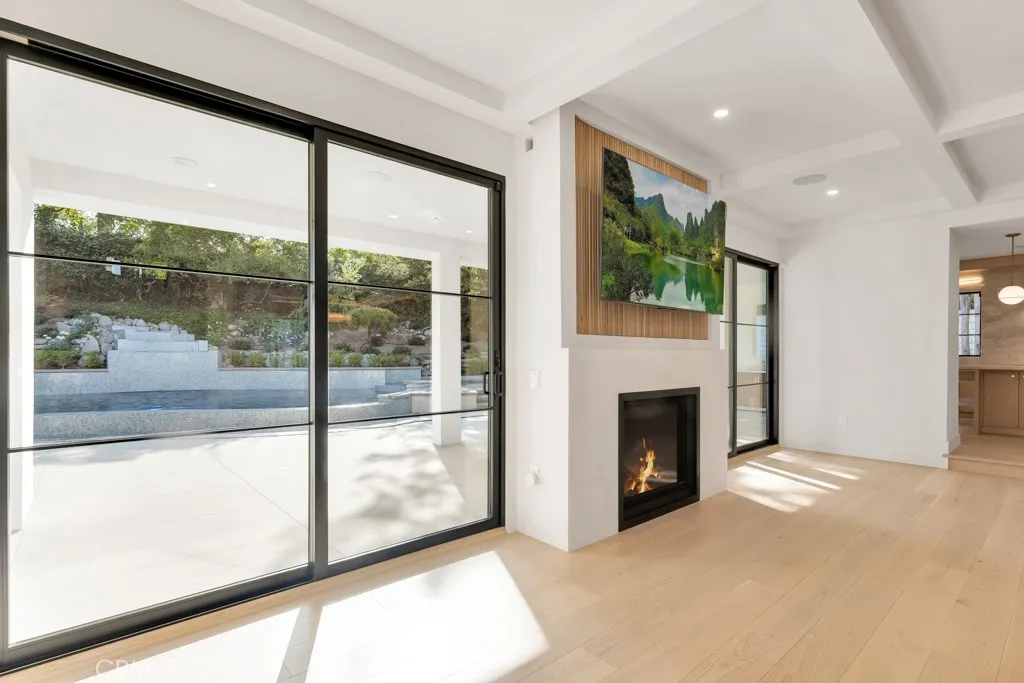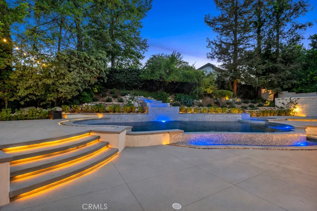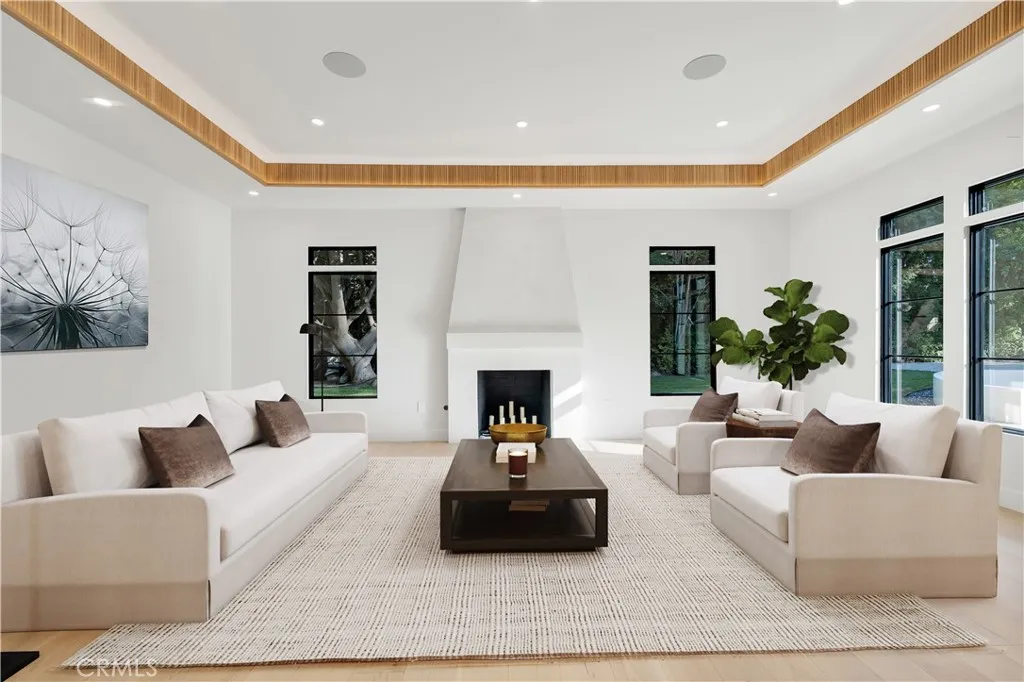 Set within a private gated community, this Modern Tudor estate on a cul-de-sac, has been completely reimagined, blending timeless architecture with modern luxury. Spanning 4,720 square feetincluding a 400 sq. ft. enclosed patio on an 18,317 sq. ft. flat lot, the home offers 5 bedrooms, 5 bathrooms, and a separate office, thoughtfully designed for both elegant entertaining and comfortable everyday living. A grand two-story foyer makes a striking first impression, leading to expansive light-filled interiors. At the heart of the home, the gourmet kitchen showcases Taj Mahal quartzite countertops, custom cabinetry, and professional-grade appliances. The kitchen flows seamlessly into a family room with coffered ceilings, creating a warm and sophisticated gathering space. A separate formal living room and dining room with designer-detailed ceilings add to the homes refined character and provide ideal settings for entertaining. Three fireplaces throughout the homelocated in the family room, living room, and primary suiteadd timeless charm and comfort. The primary suite serves as a private retreat with a spa-like bathroom featuring designer finishes and a very spacious walk-in closet. Additional bedrooms are spaciously sized and versatile, ideal for family or guests. The dedicated office provides a quiet, professional space for todays lifestyle needs. The private entertainers yard offers resort-style living with a sparkling pool and spa featuring waterfalls, a fully equipped BBQ island with ample seating, an outdoor kitchenette, and multiple lounging areas. Elaborate landscape ligh