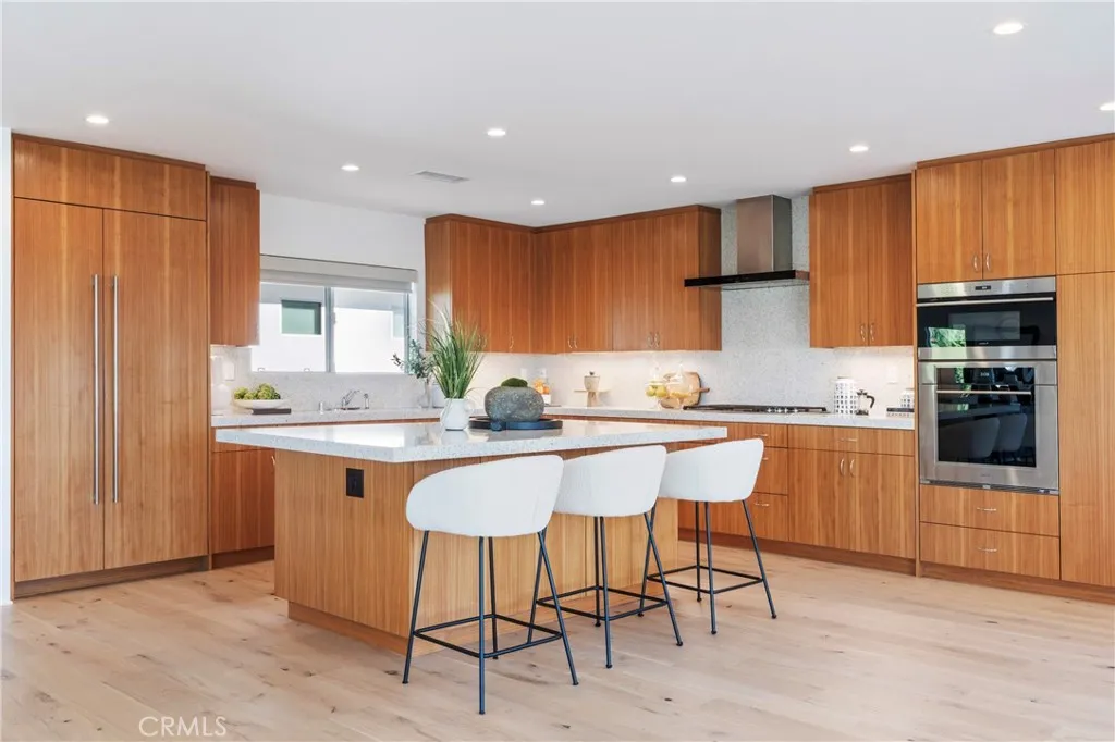 Set behind a 6-foot motorized privacy gate and approached by a long driveway, this single-level mid-century modern retreat offers sweeping views across the San Fernando Valley and a rare sense of seclusion. Thoughtfully taken down to the studs approximately ten years ago, the home was comprehensively reimagined with all major systems upgraded alongside refined, timeless finishes throughout. Upon entry, a dramatic sunken living room with fireplace sets the tone, seamlessly flowing into an open-concept layout designed for both everyday living and entertaining. Engineered white oak flooring runs throughout the home, complemented by aluminum-framed windows and sliding doors that frame the valley views and flood the interiors with natural light. The dining area is a true focal point, showcasing views of the northern valley and ideal for hosting memorable gatherings. A second sunken living space offers a cozy, elevated loungeperfect for media, relaxing, or taking in the view from a different perspective. The chefs kitchen features custom teak cabinetry, a Sub-Zero refrigerator, Wolf cooktop, oven, and microwave, generous storage, and bar seatingdesigned to function beautifully while anchoring the heart of the home. The residence offers four bedrooms and three-and-a-half bathrooms across a thoughtfully separated floor plan. One wing includes three bedrooms, highlighted by a spacious primary suite with walk-in closet and en-suite bath featuring a sunken soaking tub. The second-largest bedroom offers near-primary proportions with its own walk-in closet and shares a Jack-and-Jill bat