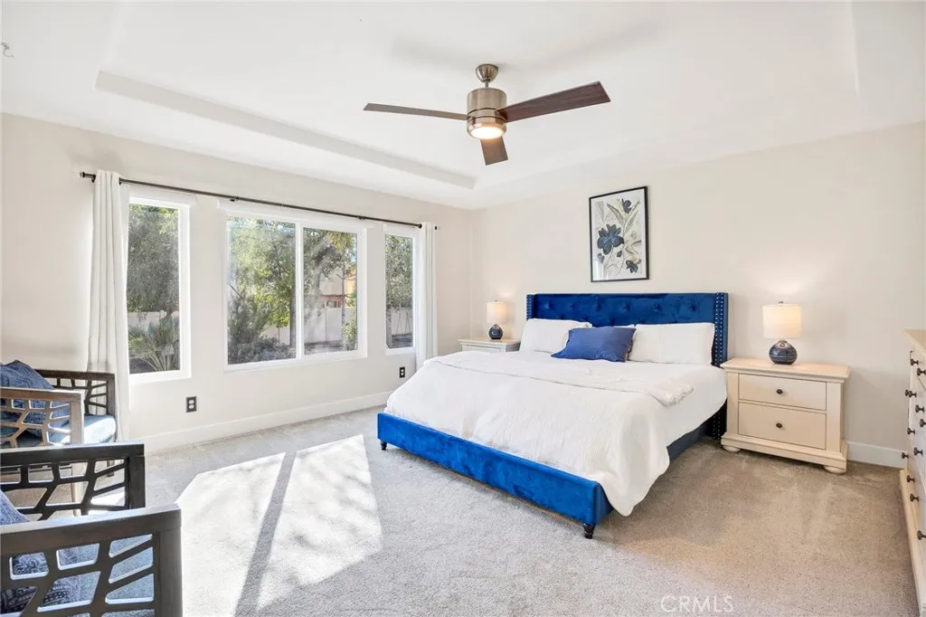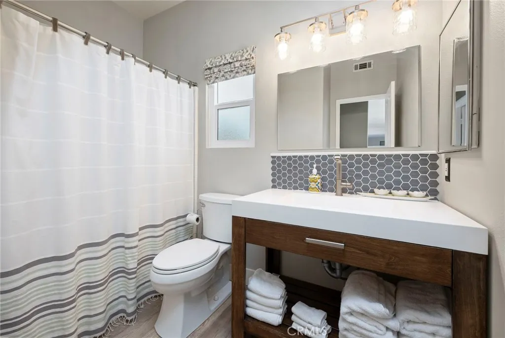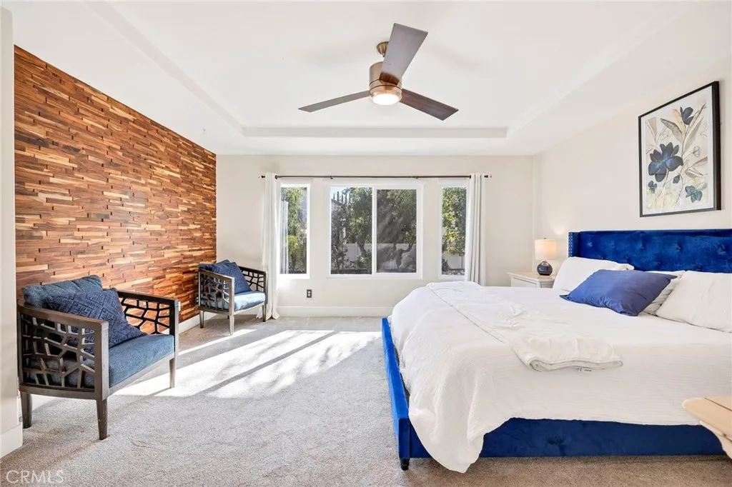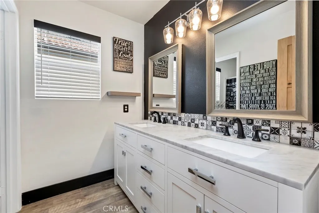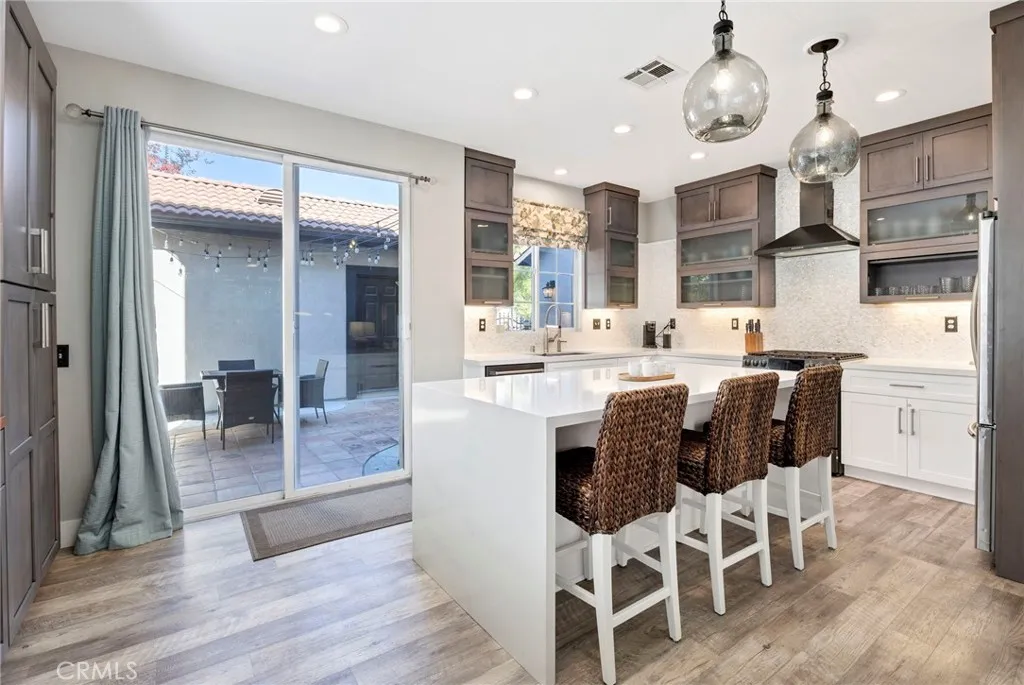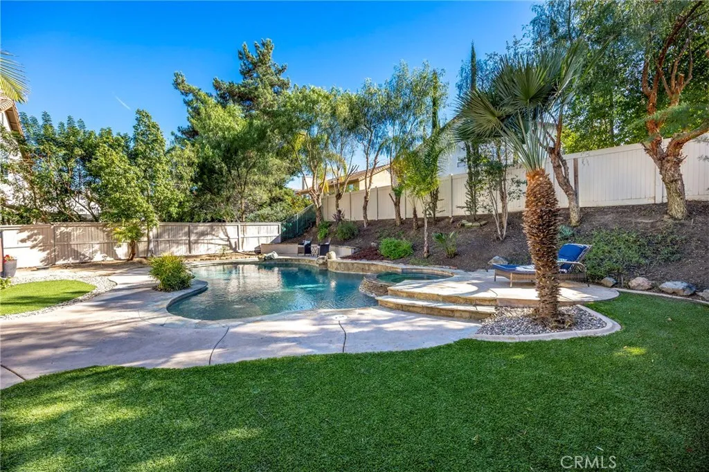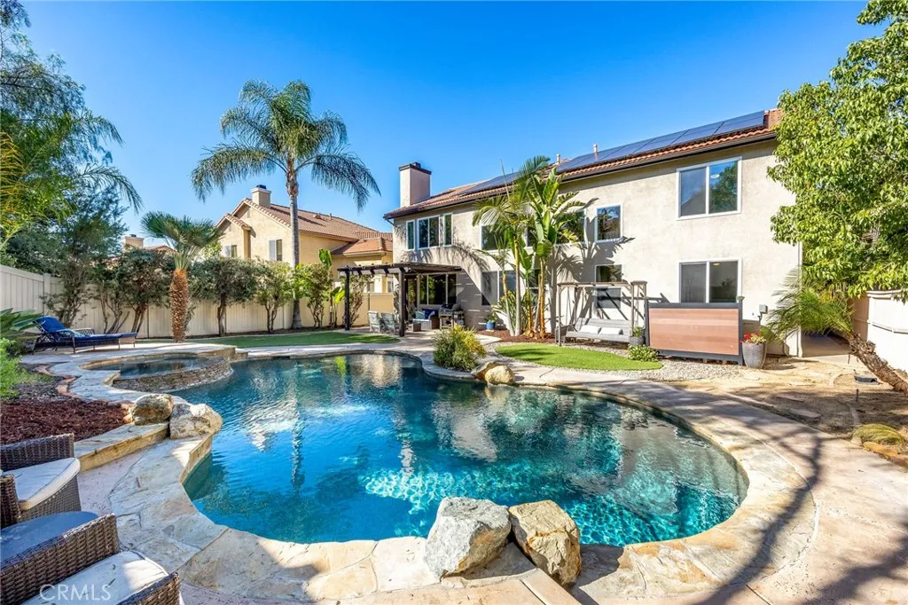 Welcome home to your fully remodeled and upgraded pool/spa home in the highly sought-after Paseo Del Sol community. This bright, spacious, 5-bedroom, 3-bathroom home offers luxurious well-designed living space in one of Temeculas most desirable neighborhoods complete with 2 resort-like community pools plus tennis, parks, and walking distance to Abby Reinke Elementary. Beyond the gorgeous street presence awaits a secluded front courtyard complete with cafe lights and Saltillo tile. Inside, the functional and open layout with vaulted ceilings in the living and dining areas creates an airy and inviting feel in this unique floor plan - one main floor office/bedroom with no closet adjacent to a full bath. The reimagined kitchen features a large waterfall quartz island, quartz countertops, a custom backsplash with mother of pearl mini subway tile, solid wood Shaker cabinets, contemporary glass euro-hinged upper cabinets, and a walnut countertop between the pantry cabinets, along with upgraded appliances. The primary suite is a contemporary show-stopper with a stand-alone soaking tub, huge tiled and glass shower with two powerful showerheads, plus a freestanding double sink vanity with vessel sinks and recessed medicine cabinets. The primary bedroom has a custom acacia wood accent wall along with a cavernous walk-in closet. Upstairs, the interior doors are solid alder. The large and private backyard is perfect for relaxing and entertaining, boasting a pebbletec pool and spa, newer pool equipment, artificial turf plus a pergola and swing. A rare bonus is the detached 3rd car garage
