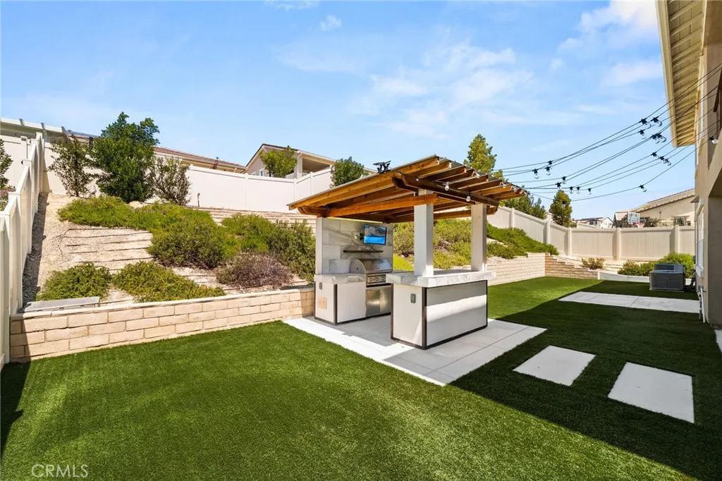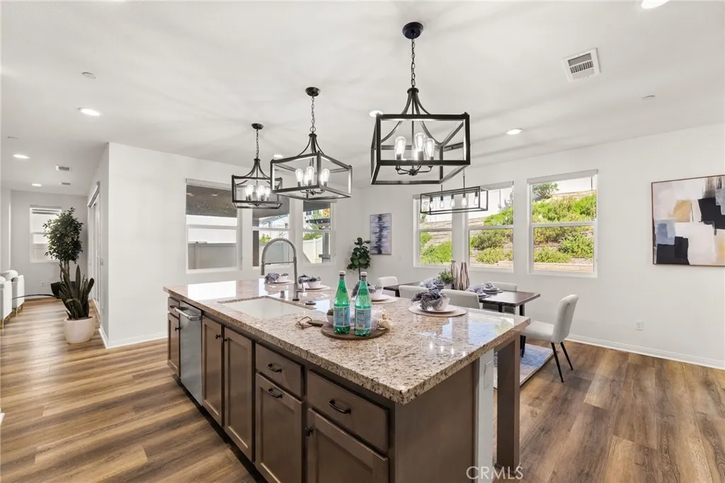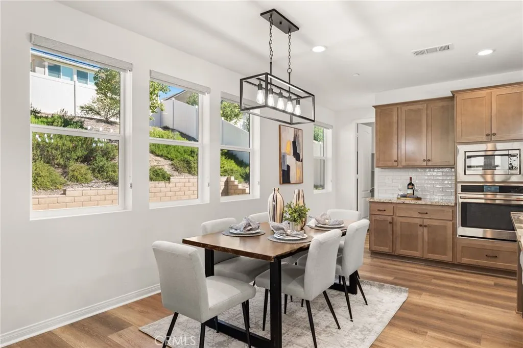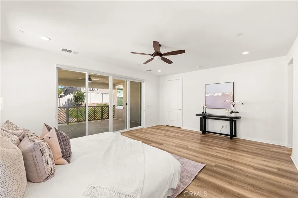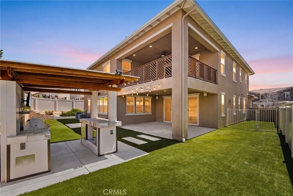 Discover this nearly new Plan 3XD home in the Upton development of Sommers Bend built by Woodside Homes. Sommers Bend sits adjacent to wine country and often has views of hot air balloons meandering through the countryside of beautiful Temecula. This five bedroom, 4.5 bathroom home was upgraded throughout when new with over $52,000 spent in upgrades. As you step inside just off to your left is a spacious bedroom and ensuite bathroom; perfect for visiting guests or those who prefer to be downstairs. Just outside this bedroom is a half bathroom for guests. A large family room is just around the corner with dual sliding glass doors that take you outside to your California room and fully landscaped backyard. Adjacent to the family room is your designer kitchen with stainless steel appliances, modern shaker cabinets, a large kitchen island complete with sink and barstool area. Additionally, just off the kitchen is your own coffee nook area which could also be used as a drop zone for taking off shoes and purses after entering from the garage. Head upstairs to find four more bedrooms and a bonus room area with built in desk that can be used as another television space, kids play area or home office. Two of the bedrooms share a hall bathroom and the third has an ensuite bathroom. The primary bedroom features a gorgeous primary en suite with large walk in closet, dual sinks, soaking tub and large walk in shower plus private water closet. The home has upgraded flooring and modern bathrooms. Your backyard is an oasis that awaits for entertaining. The backyard has a BBQ structure compl