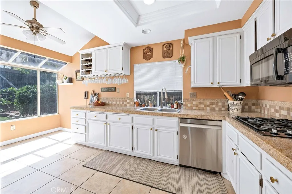 Perfectly situated across from a small cul-de-sac, you'll find this charming three bedroom, single level home with a backyard for the gardening enthusiast and those seeking peaceful and quiet outdoor enjoyment! As you enter the home through the front door you will notice the high ceilings throughout offering a sense of space and openness. The dining room and living room offer a "great room" layout feeling while still providing separation for traditional styling. The living room has vaulted ceilings and a cozy wood or gas burning fireplace with shelving for decor. The kitchen is airy and bright with a beautiful bay window and a potential banquette style dining area. Plenty of storage space, inviting natural light, and functionality with stainless steel appliances make this updated kitchen a lovely place to create memories over delicious meals and drinks. Two darling bedrooms and their shared full bath are situated in the front of the home opposite from the primary bedroom offering a split style bedroom layout. Your primary bedroom is your retreat with access to your peaceful and parklike backyard! The primary en-suite offers a walk-in closet and ample storage in the vanity. A custom, built-in tech desk/command center just outside the primary bedroom provides a great place for organizing day to day tasks or working from home. Don't forget the garage - the storage system in the ceiling of the garage is next to none and gives you easy access to storing whatever your hobby/holiday decor heart desires, and a newly installed water heater keeps the home running efficiently! Out in