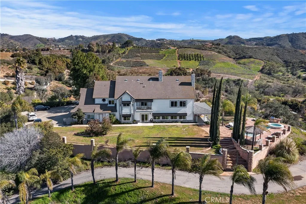 Luxury at its finest with this stunning De Luz Estate pool home. This gorgeous property also includes a 1200+ Sq. Ft. guest house with 2 bedrooms 2 bathrooms and a 2 car garage and pool of it own, all just minutes from Old Town Temecula, schools, shopping, dinning, freeway and entertainment. You will be in awe at the spectacular 360 degree views from every room throughout this stunning 4,861 sq. ft. estate home, positioned on a over 5+ acres of impressive land. As you drive up the private driveway, enjoying the breathtaking views, you'll come upon an orchard that consists of 14 mango and 19 grapefruit trees, you'll then pass by a lovely guest home, excellent potential rental opportunity or for guests, friends or family to live in. When entering the main home through the double front doors, you'll immediately appreciate it's grand scale, with the beautiful scrolling iron banister, coffered ceilings, exquisite woodwork, hardwood flooring, and open floor plan with every bedroom consisting of their own bathrooms. Enjoy a cozy evening by the fire, reading a book, or chatting with friends in the lounge/den with beautifully crafted full wall, wood, built-in wine racks and cabinets, granite counters, and wainscot throughout. This room is a must see! Looking to entertain, then you'll enjoy the huge family room, formal dining room and beautiful kitchen with eating area with never ending views. Need room for guests, no problem, down the hallway you'll find a bedroom with walk-in closet and a full bathroom. There is also a separate powder room conveniently located off of the family roo
