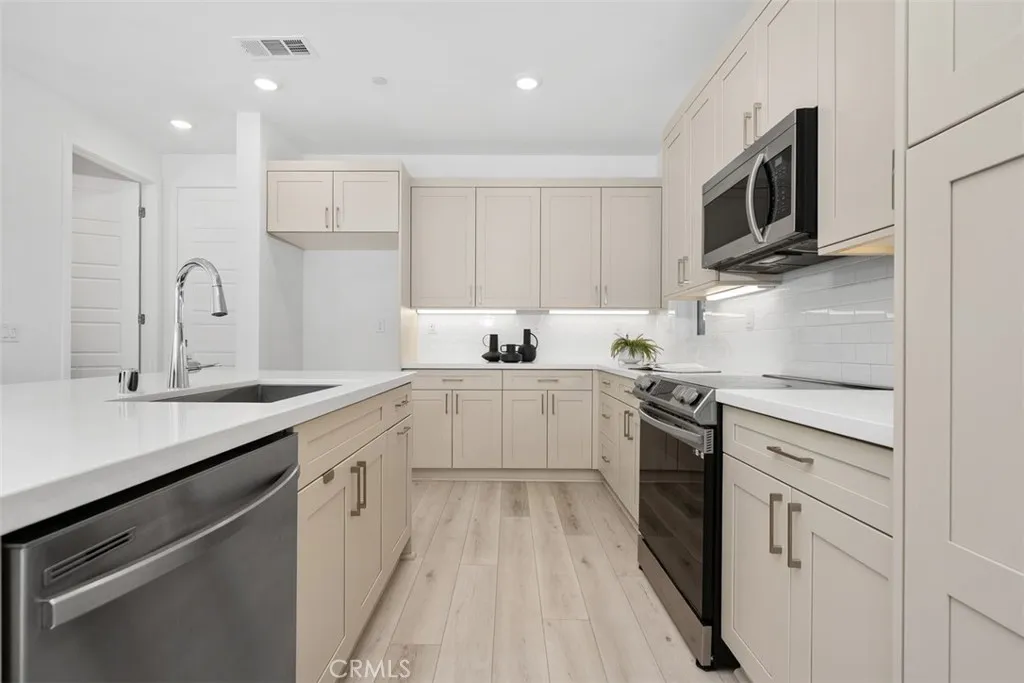 Welcome to the stunning, all-electric modern home with paid off solar panels. As you enter this home you will notice the high ceilings with all the natural light pouring in throughout the home. It has an open-concept floor plan with 4 bedrooms and 2.5 bathrooms, perfect for both entertaining and everyday living. This home has upgraded laminate floors throughout and features an open concept plan with a large kitchen, dining room and living room. The chef-inspired kitchen boasts soft-close shaker cabinets, white quartz countertops, a large kitchen island, a subway tile backsplash, featuring Samsung stainless steel appliances. The family and dining areas open up to your large private patio with concrete brick flooring, providing a perfect spot for outdoor relaxation and BBQs. A convenient powder room is located off next to the kitchen, alongside direct access to the large two-car garage, which features an electric port ready for an EV charger. Upstairs, the primary suite boasts high ceilings, abundant natural lighting, and a luxurious bathroom with his and hers sinks, an oversized shower, and a walk-in closet with plenty of clothing storage. Youll also find three additional spacious bedrooms with large closets, a full bathroom, and a sizable laundry room equipped with an energy-efficient Samsung washer and dryer. This all-electric home is designed with energy efficiency in mind, featuring energy-efficient appliances, windows, and a water heater, as well as a rainwater collection system and automatic sprinklers for the yard. With additional guest parking, this home is in a prim