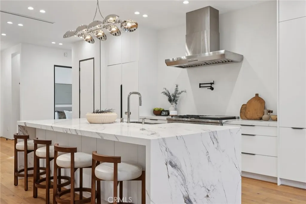 High in the Upper Hollywood Riviera, The Light House, a Riviosa Signature Home, isnt just another new build, its a vibe, a wink, and a wildly refreshing reminder that homes can still surprise you when every detail actually matters. Step through the custom iron-and-glass front door and it hits immediately: this place was designed for someone who wants different, who notices the little things, who appreciates intention over imitation. With more than 250 recessed LEDs giving it an unmistakable glow, the home leans into its name... light as clarity, creativity, and that moment when an idea becomes something real. The great room stretches wide and bright, grounded by warm teak wide-plank floors and opened completely to the backyard through wall-to-wall bi-fold doors that let in sunshine, breezes, and a whole lot of possibility. Just beyond, the chefs kitchen shows off with Sub-Zero refrigeration, a full wine fridge, a Fisher & Paykel dual-oven range with griddle, pot filler, apron-front stainless sink, polished nickel Kohler faucet, and a 10-foot island with pop-up wireless chargers that feel like tiny party tricks. Flowing naturally into a full-size dining area, the whole space becomes an invitation to linger... holiday feasts, Tuesday takeout, and everything in between. In the living area, a 150-inch retractable screen drops from above like its making an entrance, aligned so you can watch from the sofa or out on the patio, turning Sundays and movie nights into full-blown indooroutdoor events. The backyard keeps the energy going with three intentional zones: a dining area for l