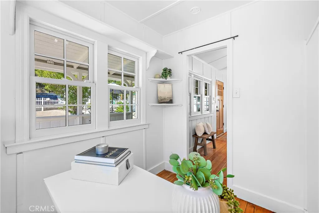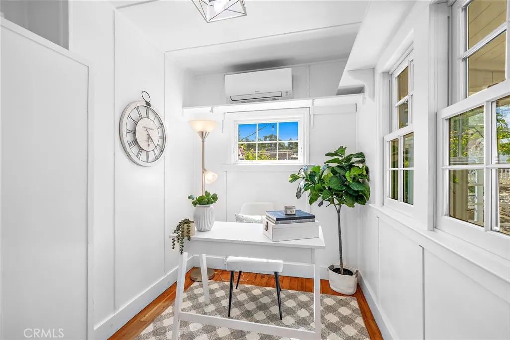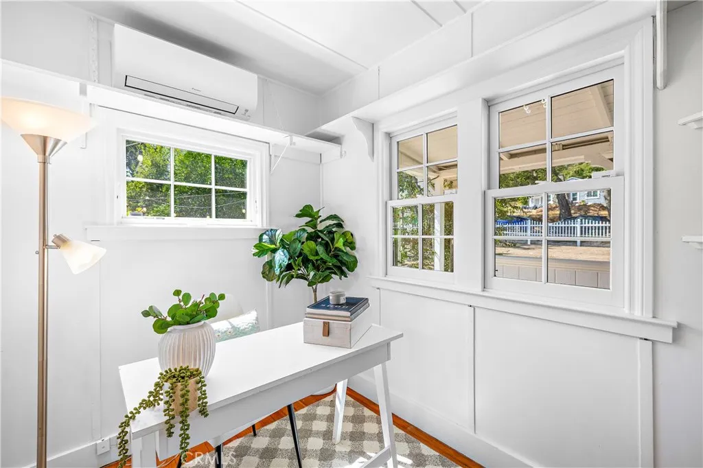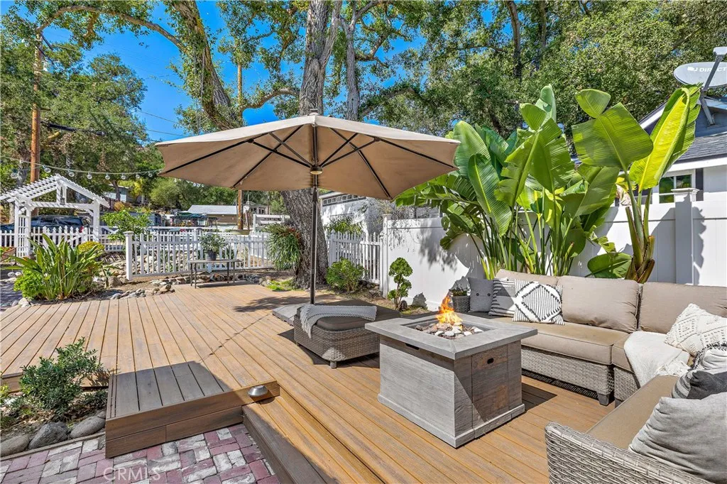 Situated on a spacious, level, double lot, this enchanting country retreat invites you to relax and enjoy lifes simple pleasures. With plenty of room for gardening, pets, and even RV parking, this turnkey home has it all. Inside, the living room features a vaulted ceiling, multiple skylights, wood flooring, a dining area, and a cozy river rock fireplace with a wood-burning stove for maximum heat efficiency. The main bedroom offers tumbled marble flooring, and an attached full bathroom with a large tub and tiled surround. The smaller second bedroom or office showcases a beautiful farmhouse-style barn door and enjoys views of the front yard. The upgraded kitchen includes a garden window overlooking the scenic grounds, granite counters, a stainless refrigerator, an electric stove, and a microwave. Additional amenities include: three new mini-split heat and air units (located in both bedrooms as well as the kitchen), a separate storage garage with washer and dryer, two extra storage rooms ideal for work or hobbies, a relaxing spa, and an expansive custom Trex deck for stargazing evenings. The fully fenced grounds feature a private garden with raised planter beds, ten mature fruit trees ranging from pomegranates to tangerines, meandering brick paths covered in trellises and grapes vines, a stone patio with fire pit seating, and a concrete parking area with an electric gate for added convenience and security. Recent upgrades include dual-pane windows, fire-resistant siding, a tankless water heater, updated electrical, and wired security. Residents of this sought-after community a