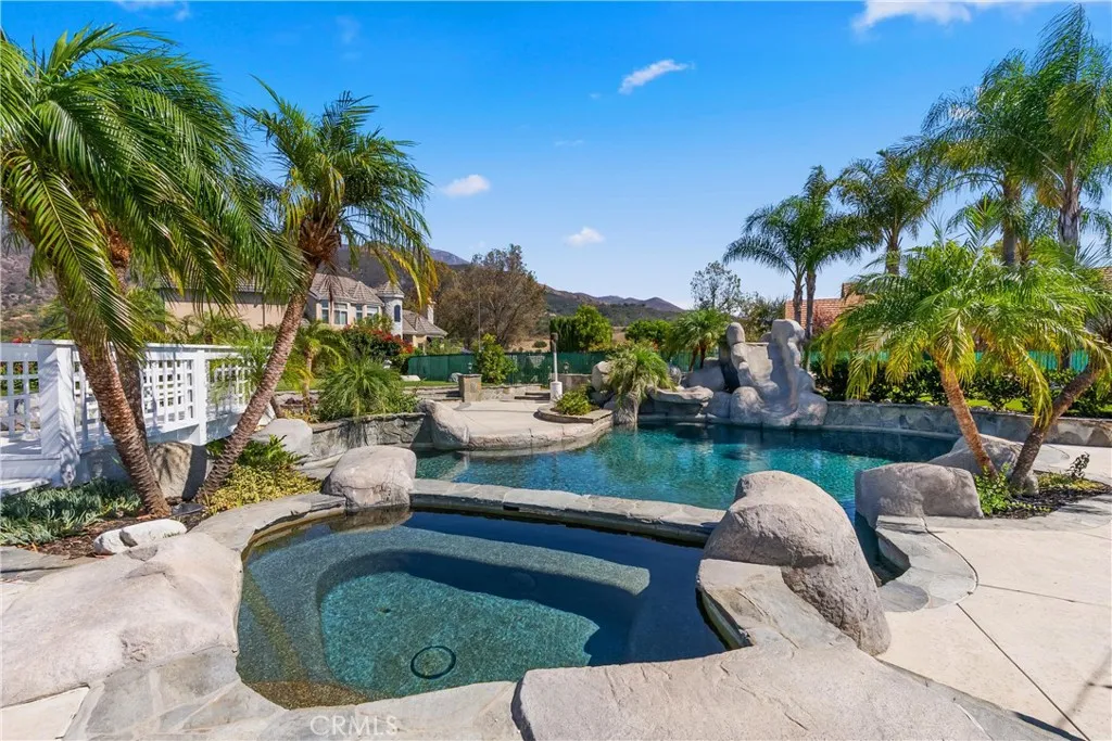 Recent Price Improvement!! Introducing a remarkable horse property, just 2.5 miles from shopping, dining, and schools in Rancho Santa Margarita. This stunning residence boasts panoramic 360-degree views and includes private stables featuring 9 stalls and a horse arena. The horse facility has installed professional footing, barn facility, and extra parking, The open floor plan is flooded with natural light, complemented by a kitchen equipped with granite countertops, stainless appliances, and a walk-in pantry, seamlessly connecting to the dining and living areas with a custom fireplace and built-in shelving. The main floor also features a separate guest suite and bath plus and an office with built-in cabinetry. In addition, a specially designed media room enhances entertainment options. Upstairs, the luxurious master suite showcases a remodeled bath with a soaking tub and two walk-in closets plus 3 Aditional bedrooms and a spacious laundry room. Enjoy breathtaking views from the master and secondary bedroom balconies. The expansive resort-style backyard, ideal for relaxation and recreation, includes a meandering pool, spa, tropical landscaping, 12 fruit trees, putting green, and synthetic grass. A large fenced grass area is also available on the property for gated RV access. Notable features include seller-owned solar panels, Generac whole house generator, new HVAC and a Quick Tesla Charger. Spanning approximately 2.5 acres, the lower area is dedicated to equestrian activities with a professionally designed horse arena and additional stable facilities, including ample parkin