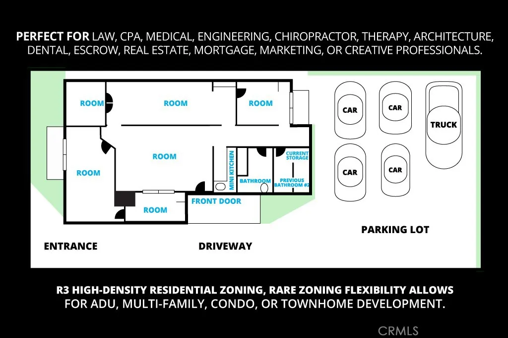 Attention Multi-Family Developers, Business Owners, and 1031 Exchange Buyers off the 5 Fwy - Red Hill Ave. Currently configured as a permitted professional office space and zoned R3 High-Density Residential, allowing exceptional flexibility. This versatile zoning supports a range of possibilities: build a spacious single-family residence with an ADU + garage, pursue a multi-family redevelopment, or create a custom live/work setup. Plumbing and utilities are already stubbed for two bathrooms and a full kitchen, saving significant time, hassle, and cost during any conversion or new build. Whether you're an owner-user, investor, or developer, this property delivers built-in value, redevelopment potential, and a strategic head start toward your next profitable project.