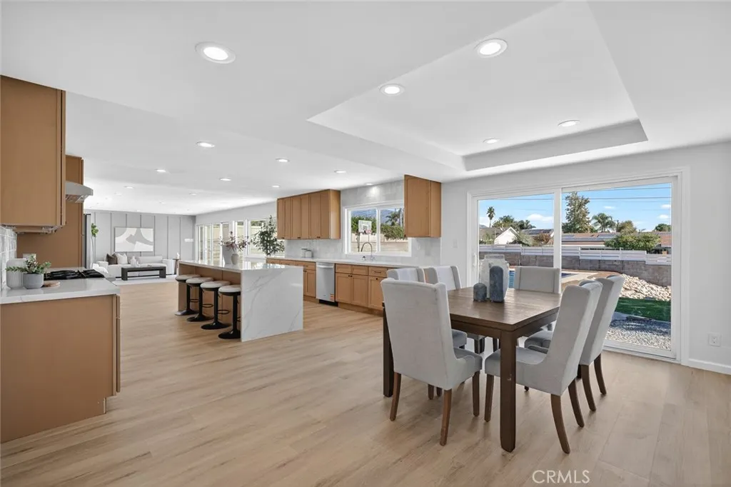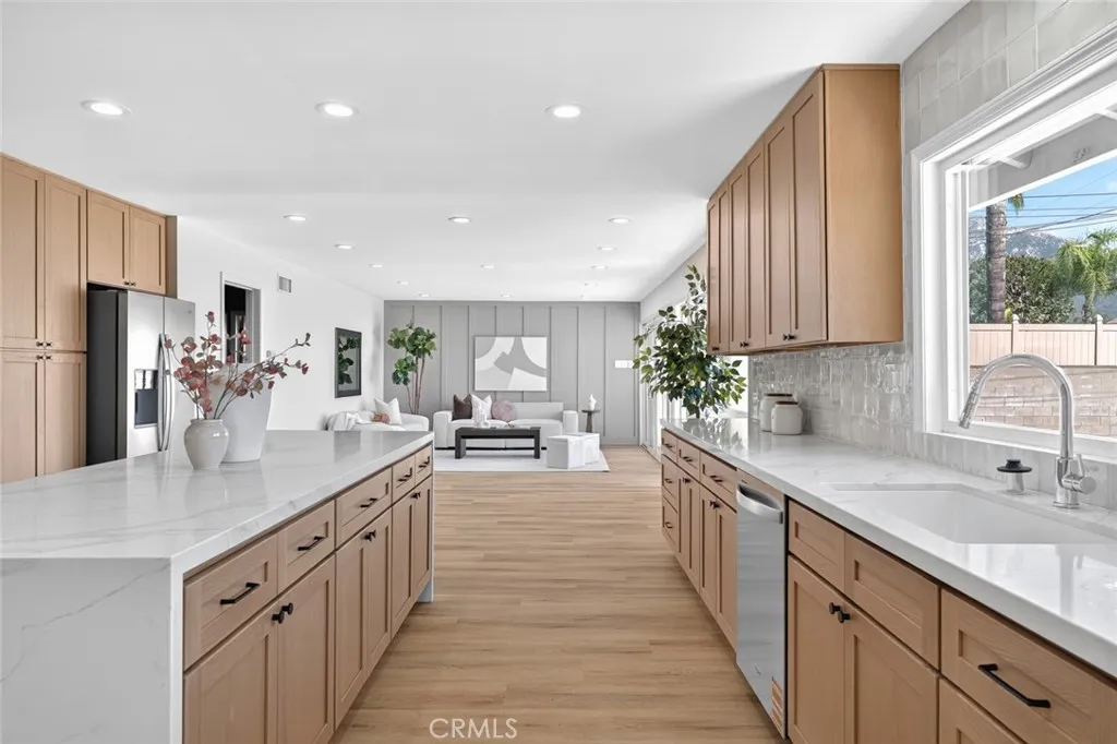 Nestled on a sprawling 15,000+ sq ft lot with breathtaking views of Mount San Antonio, this beautifully designed ranch offers indoor-outdoor living at its finest. The expansive yard features a sparkling pool, a court for recreation, alley access with a double-wide gate for possible RV parking, and plenty of room for entertaining. Inside, earth-toned finishes and warm tans create a nature-inspired palette throughout. The oversized kitchen is a chefs delight with white oak shaker cabinets, elegant quartz countertops with subtle color veining, and a perfectly sized island ideal for gathering. New LVP flooring and recessed lighting flow through the home, enhancing brightness and a modern feel. Four spacious bedrooms are thoughtfully placed off the main living areas for added privacy. The primary suite includes a dual-sink vanity and a walk-in shower. Practical conveniences include an interior laundry room. A rare combination of generous outdoor space, thoughtful design, and panoramic mountain views perfect for families, entertainers, and anyone seeking comfortable, single-level living in North Upland.