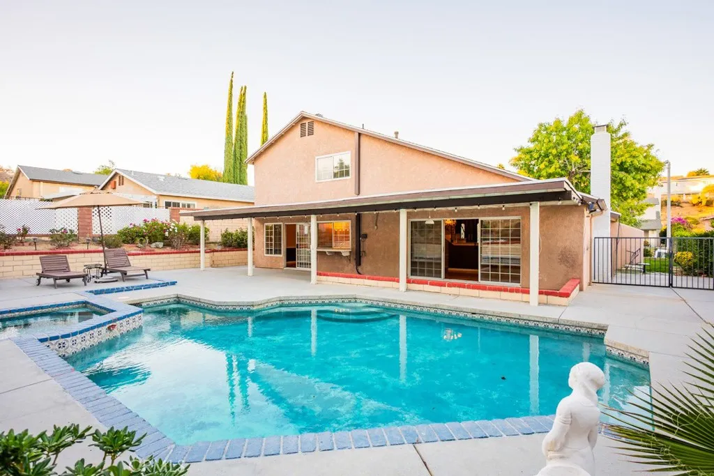 NEW HVAC SYSTEM!! Downstairs Bedroom and bathroom two story home in the highly desired Monteverde tract of Valencia, a rare gem in prime location! This beautifully upgraded residence sits on a private elevated lot surrounded by mature cypress trees, offering full backyard privacy and a peaceful atmosphere. Inside, you'll find a spacious living room with a classic brick fireplace and large diamond-paned windows that fill the space with natural light. The upgraded kitchen features granite countertops, stainless-steel appliances, rich cabinetry, and a charming dining area overlooking your sparkling backyard oasis. Upstairs, the primary suite offers dual French door to a private balcony, a walk-in closet, and a dual-sink vanity with a standing shower. Additional bedrooms are spacious and bright, with plenty of flexibility for family or guests. The entertainer's backyard is a true escape featuring a sparkling pool and spa. The front garden, elevated above street level, creates a sense of tranquility and total privacy from the moment you arrive. With a new HVAC system, no HOA or Mello Roos, and proximity to top schools, parks, and restaurants, this home offers the best of Valencia living. Make this your new home before it's gone!
