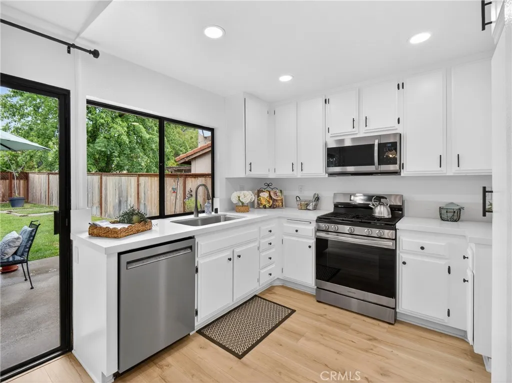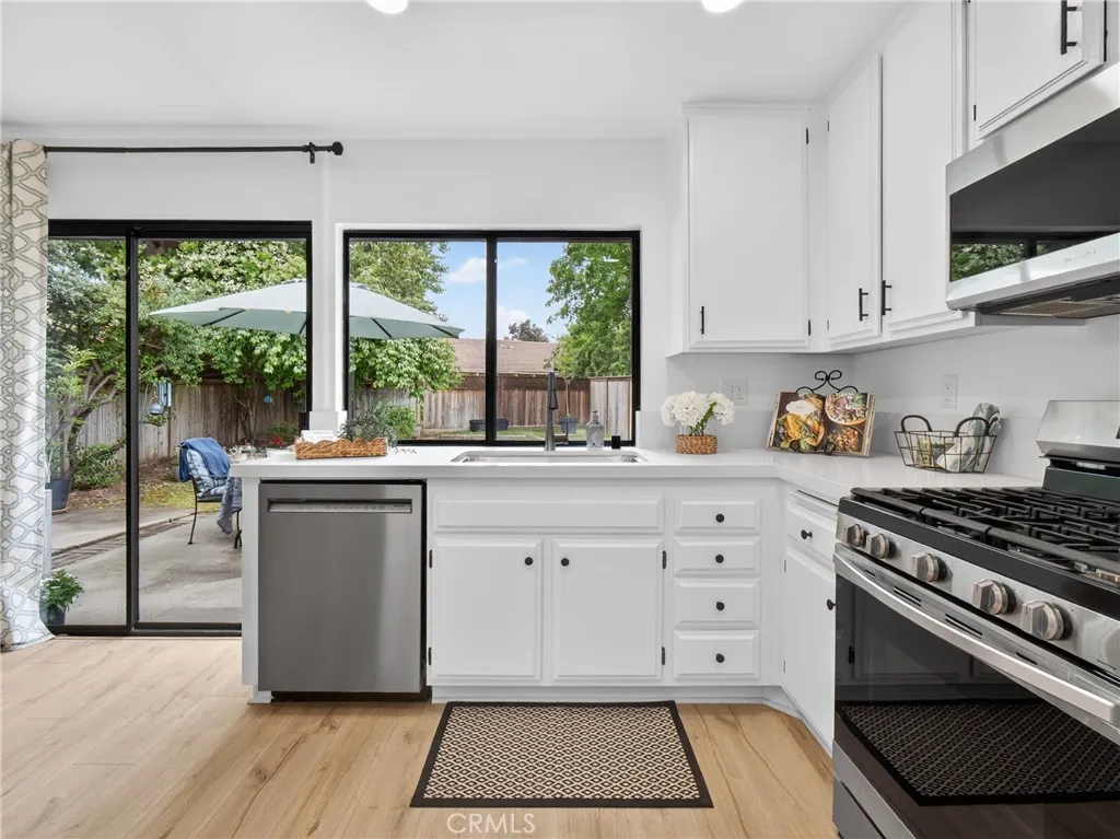 Stunning, turn key, remodeled two bedroom two bath Sunrise, that blends modern comfort with timeless style. Enhanced curb appeal, with well maintained landscaping and gated entry into the private. tranquil courtyard. The property has new Luxury Vinyl Plank neutral flooring with 4 inch baseboards, throughout the interior of this beautiful home. The living area includes vaulted ceilings with a cozy fireplace, looking out to the courtyard. The kitchen has been upgraded with white cabinetry, farmer's sink, stainless steel appliances with newly installed Quartz counter tops, new hardware, and a high end, five burner gas stove including microwave and convection oven, and recessed lighting. The oversized Primary bedroom has a large wall to wall closet, included a renovated en suite Primary Bathroom offers newer cabinetry ,sinks, and hardware, walk in spa like shower. There is a secondary bathroom also remodeled with a tub/ shower combination. Secondary bedroom is very spacious with large closet spaces. Copper Plumbing. Private pool sized lot, and enjoy a backyard retreat with natural shade from the trees. A great gardening area on the right hand side of the property for your enjoyment. Great open floor plan. The property's interior has been freshly painted with scraped ceilings. Spacious garage with a new garage door installed. Work bench included. HOA is $70 dollars per month which includes walking and biking paths with parks adjoining, the wonderful Paseo systems, and playgrounds surrounding this neighborhood. Multiple gated pool and spa areas with dog parks . Walking distance t