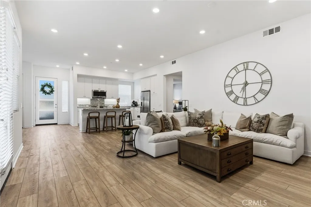 Discover this stunning single-level home at 27410 N. Merlin Pl #101, where modern design meets everyday comfort. Premium upgrades throughout, this spacious residence showcases sleek flooring, recessed lighting with smart home capability. Fully owned solar for lower energy bills! Enjoy wide hallways and an open-concept layout that create effortless flow and accessibility. Private front entrance and attached two-car side-by-side garage offer everyday convenience. Step outside to a large shaded patio- perfect for relaxed mornings or entertaining guests in style. Resort-style community, residents enjoy access to three sparkling pools, a clubhouse, community center, and lush park areas all just minutes from shopping, dining, and top-rated schools.Modern luxury, effortless living, and a vibrant community! This isn't just a place to live; it's the Valencia lifestyle you've been waiting for