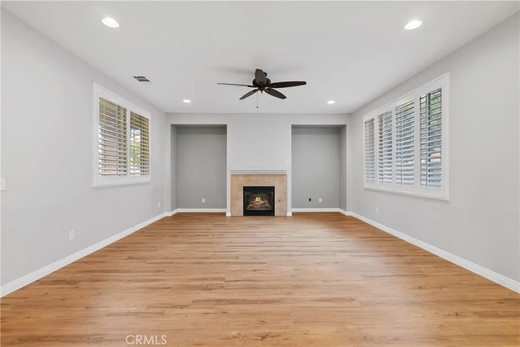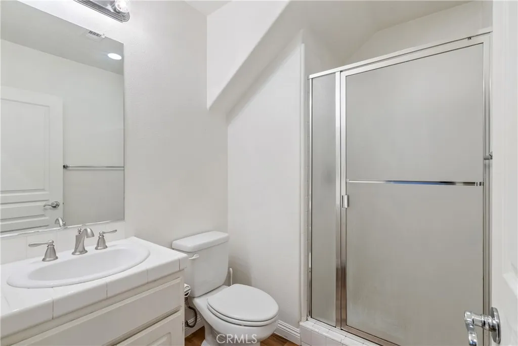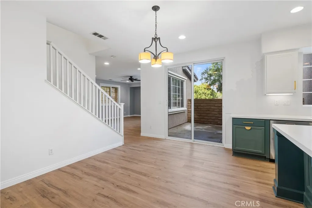 Beautifully maintained and updated Valencia Creekside townhomefeaturing the largest floor plan in the community and one of the few with a downstairs 4th bedroom and bathroom! Offering 4 bedrooms, 3 bathrooms, a 2-car garage, and a spacious private patio, this home has been freshly updated with new interior paint throughout the living space. A lush front yard and welcoming covered porch into a bright, open living room complete with a ceiling fan, cozy fireplace and plantation shutters. The thoughtful layout includes a downstairs bedroom and bathperfect for guests, multigenerational living, or a private home office. The living space flows seamlessly into the dining area and open kitchen. A newly updated kitchen is a true showpiece, blending modern design with everyday functionality. Bright and airy with recessed lighting, it features a large center island with crisp white quartz countertops, perfect for meal prep or casual dining. The two-tone cabinetry offers a stylish contrastdeep green lower cabinets accented with sleek gold hardware, paired with clean white upper cabinets for a timeless look. A farmhouse-style apron sink sits beneath a sunlit window, complemented by a designer hexagon tile backsplash that adds a subtle touch of elegance. The kitchen is complete with stainless steel appliances, including a gas range and dishwasher, as well as ample cabinet and drawer storage. A sliding glass door off the kitchen opens to a large private patio with a natural gas BBQ hookup and planter areaideal for entertaining or relaxing outdoors. Upstairs, youll find three more generous
