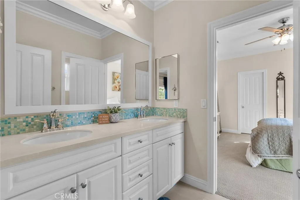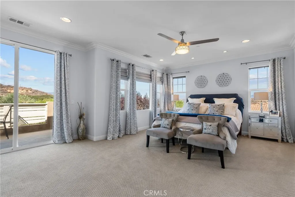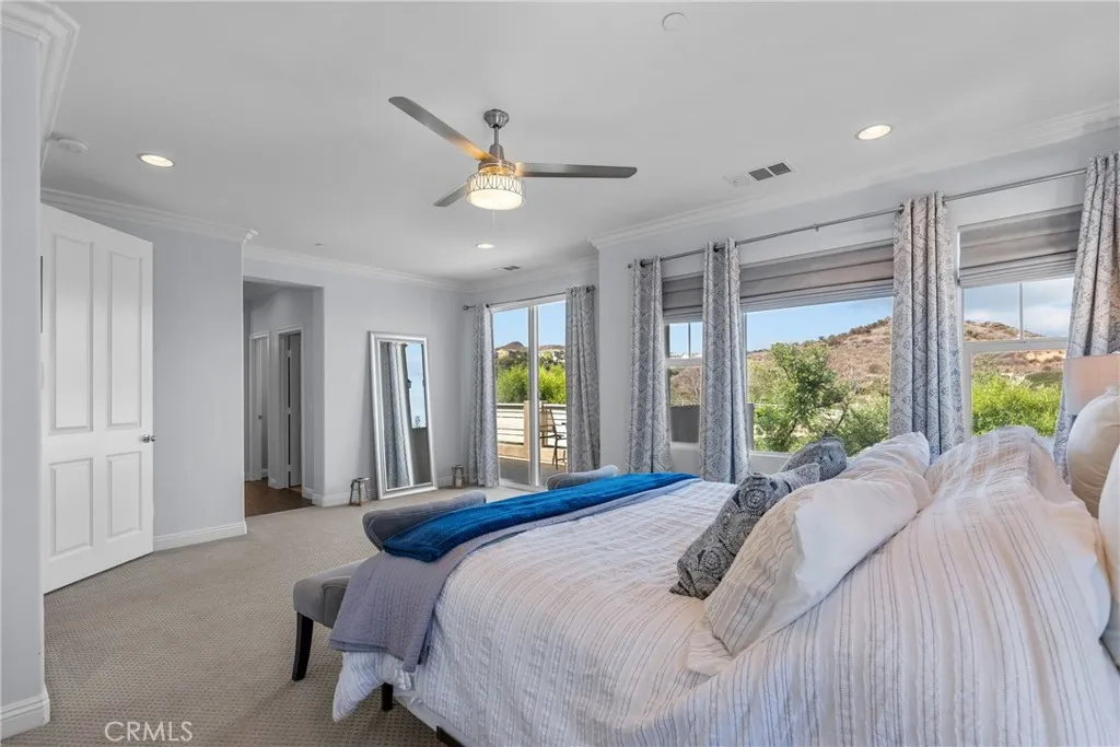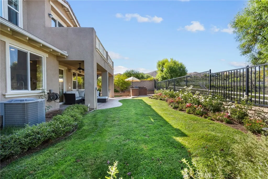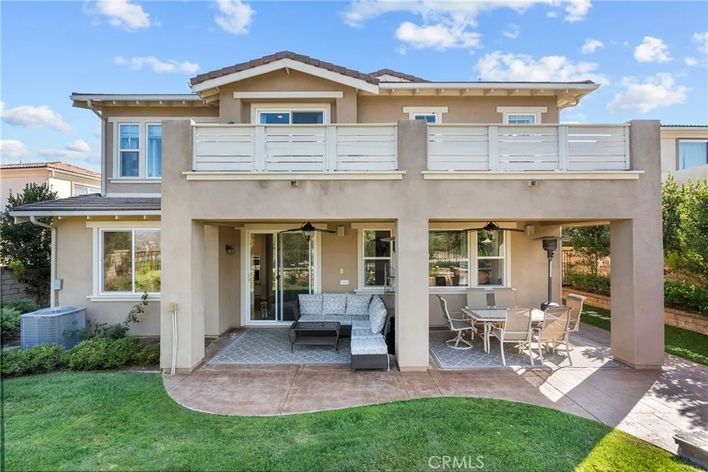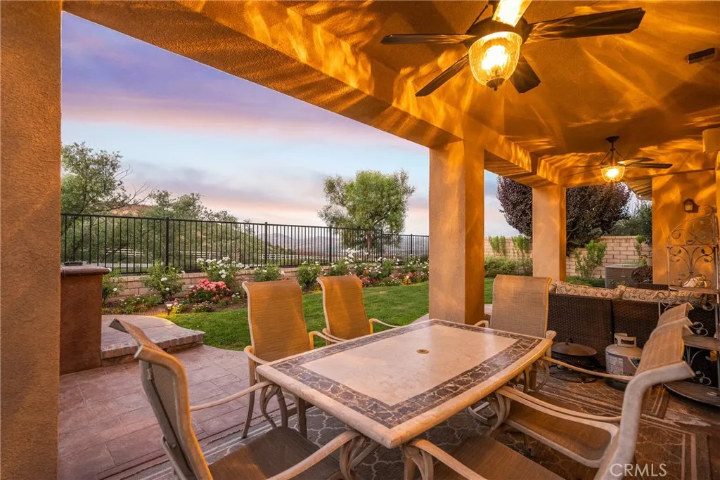 Spectacular View Home in the Gated Valencia West Hills Community! Nestled on a quiet cul-de-sac in the highly sought-after Iron Village enclave of Valencia West Hills, this stunning residence offers luxury living with a designers touch and breathtaking views of the valley. Featuring 4 bedrooms (including one full bedroom with en-suite bathroom downstairs with private exterior access), 4.5 bathrooms, and a spacious upstairs loft, this home seamlessly blends function and elegance. Step inside to discover wood-like tile flooring, custom lighting, and crown molding throughout the main level. The heart of the home is a chefs dream kitchen with an oversized island, butlers pantry with wine fridge, and reverse osmosis water system plumbed to both the kitchen sink and refrigerator. The open-concept design flows effortlessly into the living room, where built-in surround sound creates the perfect space for movie nights or entertaining. Upstairs, the luxurious primary suite boasts dual walk-in closets with custom built-ins, dual vanities, a walk-in shower, soaking tub, and a private balcony offering panoramic views of the valley. Two additional bedrooms, two full bathrooms, a versatile loft, and an upstairs laundry room complete the second floor. Step outside to enjoy true Southern California living with a beautifully landscaped yard featuring low-voltage lighting, underground drip irrigation, stamped concrete, courtyard and backyard fountains, a built-in BBQ with fire feature and seating, and a covered patio with ceiling fansall designed for year-round enjoyment. Community amenities
