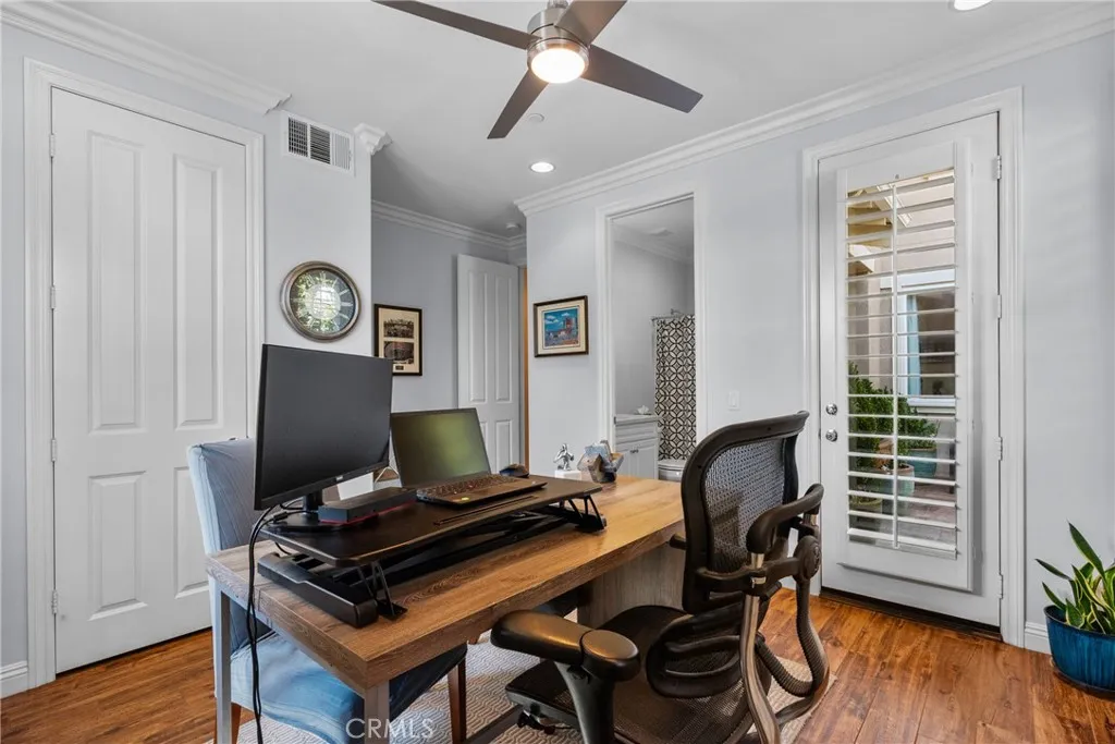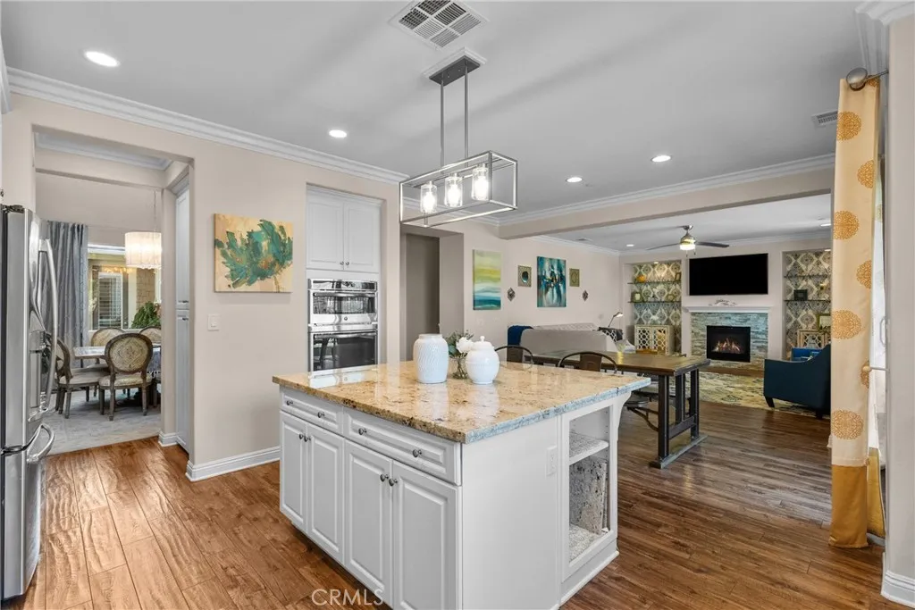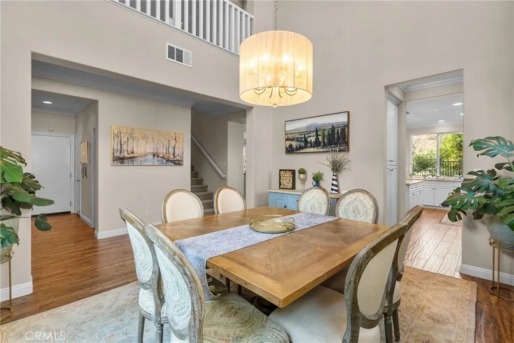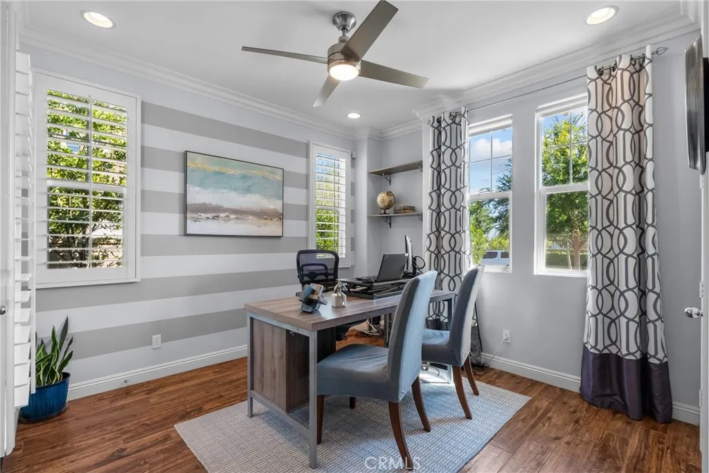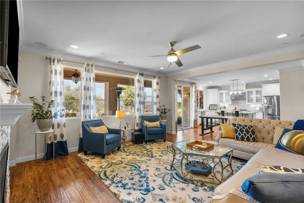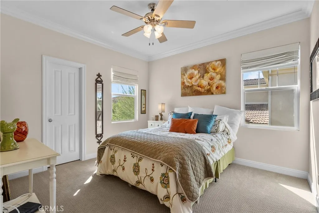 Spectacular View Home in the Gated Valencia West Hills Community! Nestled on a quiet cul-de-sac in the highly sought-after Iron Village enclave of Valencia West Hills, this stunning residence offers luxury living with a designers touch and breathtaking views of the valley. Featuring 4 bedrooms (including one full bedroom with en-suite bathroom downstairs with private exterior access), 4.5 bathrooms, and a spacious upstairs loft, this home seamlessly blends function and elegance. Step inside to discover wood-like tile flooring, custom lighting, and crown molding throughout the main level. The heart of the home is a chefs dream kitchen with an oversized island, butlers pantry with wine fridge, and reverse osmosis water system plumbed to both the kitchen sink and refrigerator. The open-concept design flows effortlessly into the living room, where built-in surround sound creates the perfect space for movie nights or entertaining. Upstairs, the luxurious primary suite boasts dual walk-in closets with custom built-ins, dual vanities, a walk-in shower, soaking tub, and a private balcony offering panoramic views of the valley. Two additional bedrooms, two full bathrooms, a versatile loft, and an upstairs laundry room complete the second floor. Step outside to enjoy true Southern California living with a beautifully landscaped yard featuring low-voltage lighting, underground drip irrigation, stamped concrete, courtyard and backyard fountains, a built-in BBQ with fire feature and seating, and a covered patio with ceiling fansall designed for year-round enjoyment. Community amenities