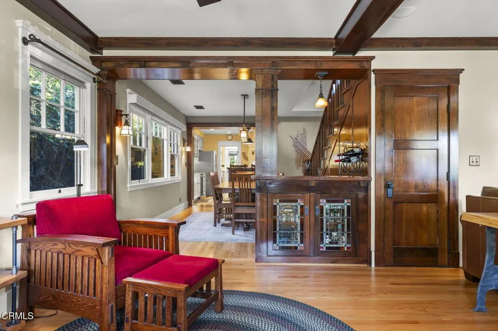 Set on a desirable street in Valley Glen, this beautifully preserved and enhanced 1920s Craftsman bungalow offers a seamless blend of character and convenience. Ideal for a history enthusiast who appreciates the timeless character and functionality of a Craftsman, it is rumored to have been moved from its original location to accommodate the development of the Hollywood Freeway in the 1940s! The craftsmanship from the 1920s era is meticulously showcased throughout the home. The front door is framed with sidelight windows, allowing natural light to fill the space. Rich wood beams accent the ceiling. The beautiful fireplace with hand-made Batchelder-style tiles is a centerpiece of the living room, tucked perfectly between classic built-ins and charming stained-glass windows. Detailed fixtures and wood flooring complement the 1920s design. The first floor features three bedrooms and two bathrooms, while the loft above provides extra space ideal for a home office, guest room, or creative retreat. The updated kitchen has granite counter-tops, ample storage, a large walk-in pantry, and top-of-the-line appliances, which create an ideal space for cooking and entertaining. There is a large laundry room off the kitchen with even more storage and a door leading to the backyard. The secluded outdoor space with lovely landscaping is ideal for a Southern California lifestyle. With an enclosed front yard, gated driveway, carport, and one-car garage, there is plenty of parking and privacy. The spacious front porch is a charming accent from which to welcome guests or decorate for a host of