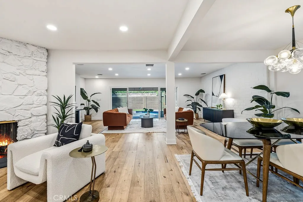 Nestled on one of Valley Villages most sought-after blocks, this residence blends updated modern style with just the right hint of mid-century charm. This beautiful 3-bedroom, 2-bath home offers over 2,300 square feet of well-appointed living space with a fresh new look! From the moment you walk in, you're greeted by free-flowing space where modern design meets everyday comfort. The open floor plan effortlessly blends the living, dining, and family room extension, offering an ideal setting for hosting friends or sharing family moments. Whether youre entertaining in the spacious indoor-outdoor living areas or enjoying a quiet evening by the fireplace, this home offers a perfect balance of style, function, and sophistication. The galley-style kitchen caters to those who love to cook, featuring plenty of counter and cabinet space, range, microwave, dishwasher, trash compactor, newer refrigerator, and a greenhouse window. Off the kitchen, you'll find an updated bath and a mudroom, perfect for reducing clutter in the home. The primary suite boasts a spacious lounging area, walk-in closet, and access to the backyard. Two additional rooms and a full bath are located off the hallway. One bedroom includes the bonus of a custom professional-grade sound studio designed by Evolve Acoustics, ideal for podcasters, music producers, VO artists, or anyone seeking a quiet, creative retreat. Outdoors, experience true Southern California living with a sparkling heated swimming pool, eco-friendly grass, pergola with retractable canopy and TV closet, complete with a retractable shading system th
