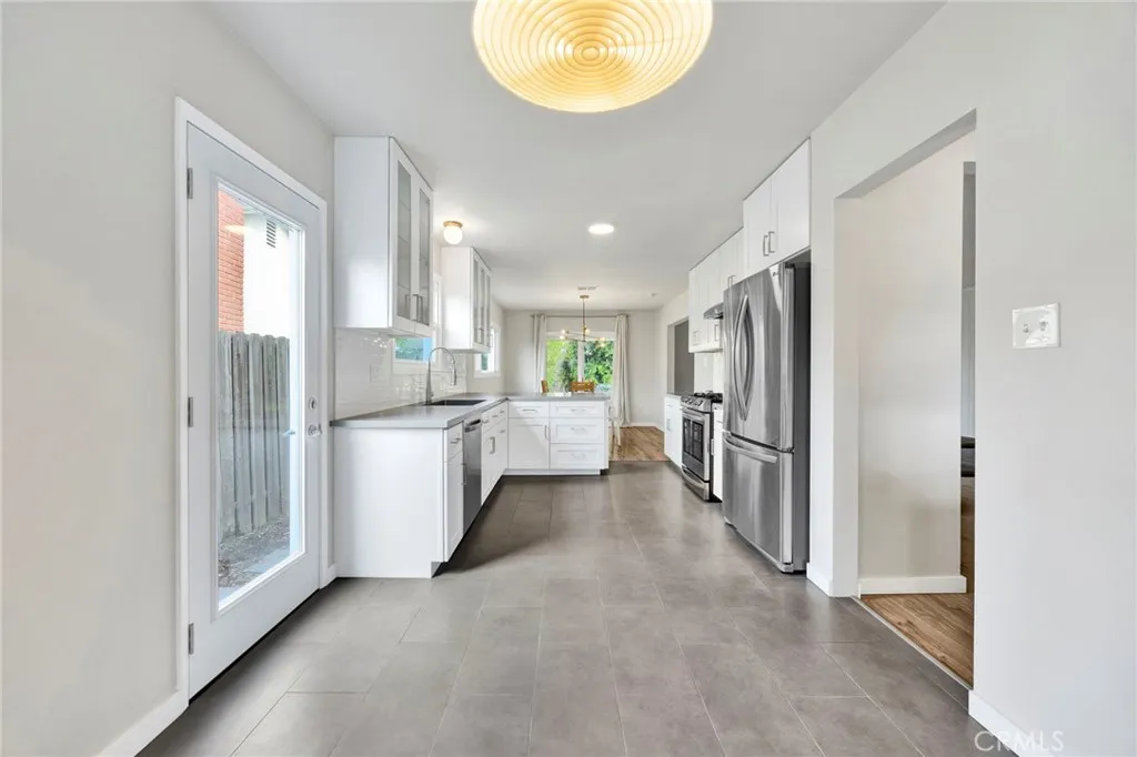 Located in a quiet pocket of Van Nuys is a beautifully updated 4-bedroom, 2-bath home offering over 1,800 square feet of living space on a generous 6,700 SF lot. Blending modern upgrades with preserved mid-century character, this home delivers comfort, charm, and an incredibly functional floor plan. From the moment you arrive, the curb appeal stands out, an expansive concrete driveway, lush landscaping, stone-accented front porch, and an inviting classic blue front door that sets the tone for the warmth inside. Step inside to a thoughtfully designed layout featuring warm laminate wood flooring with new baseboards, smooth ceilings, new double-pane windows and sliding doors, and a spacious living room anchored by a charming wood-burning stone fireplace. The fully remodeled kitchen is a true highlight, complete with tile floors, quartz countertops, white shaker cabinetry with glass inserts, subway tile backsplash, and LG stainless-steel appliances. Just off the kitchen is a cozy breakfast nook framed by large windows overlooking the front yard, a perfect daily dining space. For larger gatherings and holidays, the formal dining area sits adjacent to both the kitchen and living room, keeping everyone connected. All four bedrooms are generously sized, offering ample closet space and flexible layouts for family, guests, or work-from-home needs. The home showcases two original retro-tiled bathrooms, beautifully maintained and increasingly rare to find in such pristine condition. One includes a tub/shower combo, while the second offers a dedicated walk-in shower. Additional improvem
