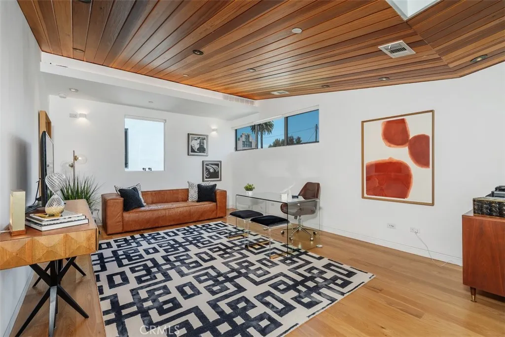 Step into the essence of Venice living in this stunning residence designed by renowned architect William Adams, AIA. Dramatic wood-beamed ceilings, sophisticated finishes, and open-concept design come together in perfect harmony, all bathed in an abundance of natural light. Ideal for entertaining or relaxing, the spacious first floor flows effortlessly from one inviting space to the next. The south-facing living room is drenched in sunlight, with retractable sliding glass doors that seamlessly connect the indoors to a private outdoor retreatperfect for al fresco dining or peaceful mornings. At the heart of the home is a chefs kitchen that blends form and function with a generous island (seating for four), premium Bosch appliances, artisan Heath Ceramics tile, and a refined, modern palette that feels both luxurious and livable. A private guest suite and convenient garage access complete the downstairs layout. Upstairs, discover a serene guest bedroom, full bath, a secondary living area, and the showstopping bi-level primary suiteyour personal sanctuary in the city. The top level offers flexibility as a home office, gym, creative studio, or fourth bedroom. With a spacious balcony and rooftop deck offering panoramic views, this home captures the best of California living in the heart of Venice. A rare blend of architectural sophistication and everyday comfortdon't miss this opportunity.