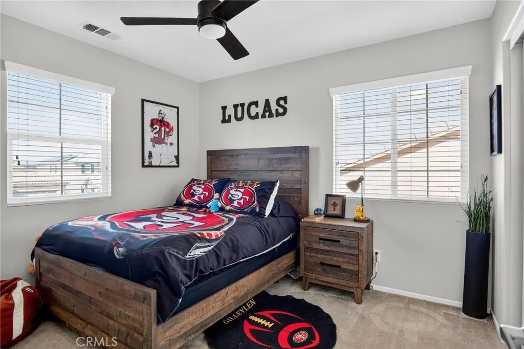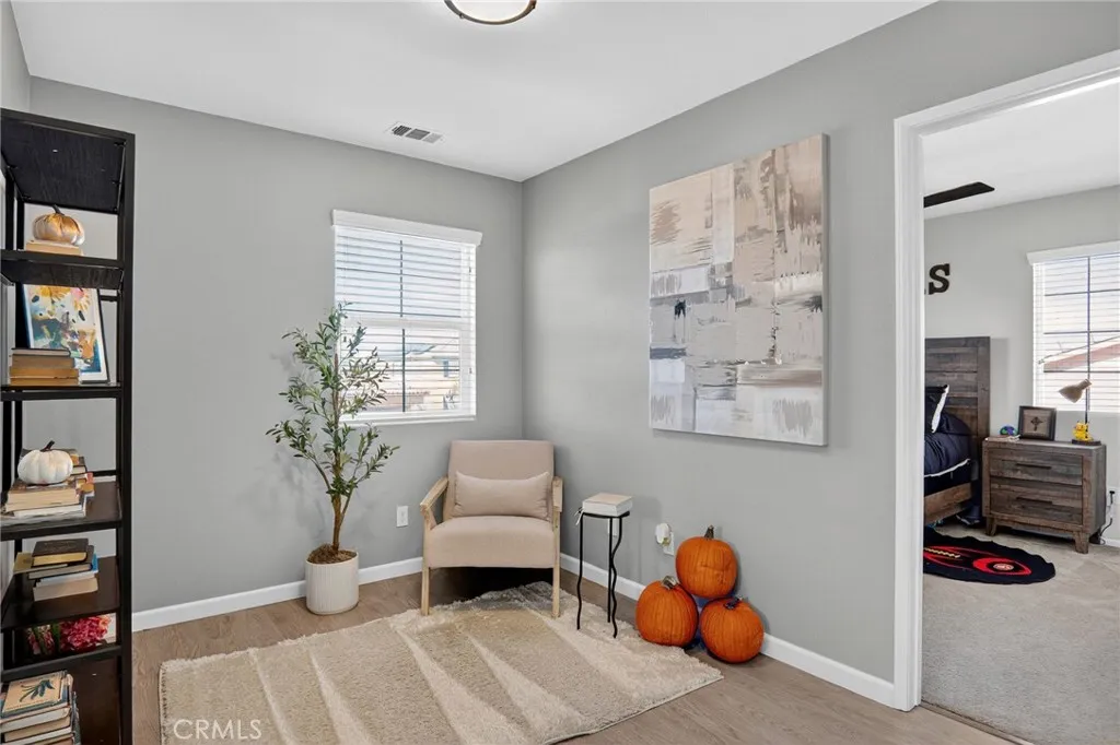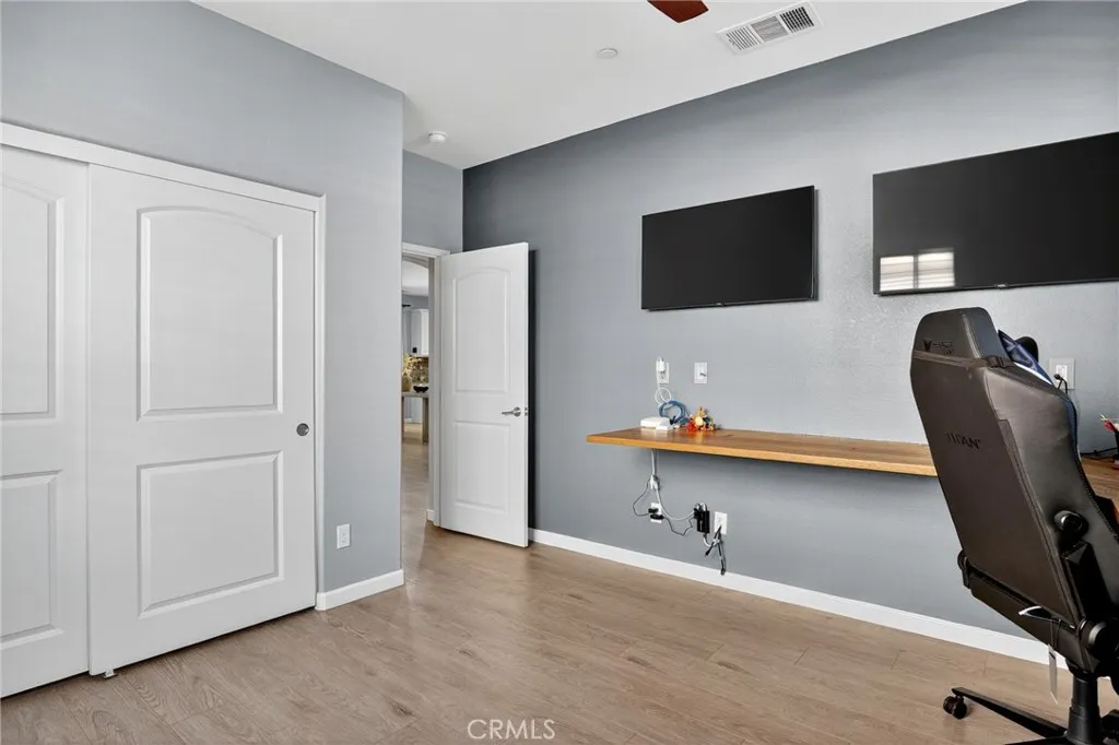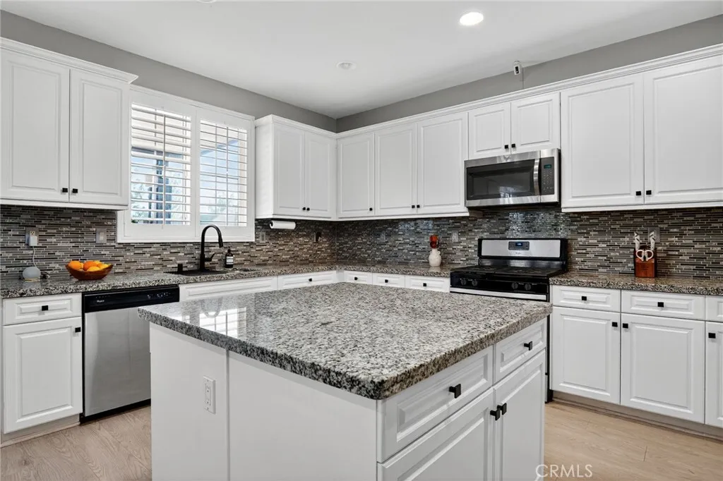 Highly upgraded like New home leaves little to be desired. Laminate Wood Flooring throughout all common areas, staircase, & upstairs landing. Bathrooms & Laundry room ceramic tile flooring. Foyer & hall welcomes anyone heading into Large open floor plan to accommodate guest while entertaining. Living/Family style Kitchen with oversize Granite top Island & counter tops, lots of prep space & storage. Upgraded Window Shutters. Media Room or future Guest Bedroom downstairs with full bathroom. Upstairs loft area excellent for a quiet time with a small desk for any home-schooling need. Two more bedrooms & Master Suite with Bathtub & Private Shower stall. Large walk-in closet. Laundry room upstairs. Custom Stamped Concrete patio & professionally installed Patio Cover, Ceiling Fans, & prewired speaker cable & electrical outlets. Completely finished garage with upgrade Epoxy Flooring, it offers a three Car tandem for Cars, Bikes, Toys or your own personal Gym.
