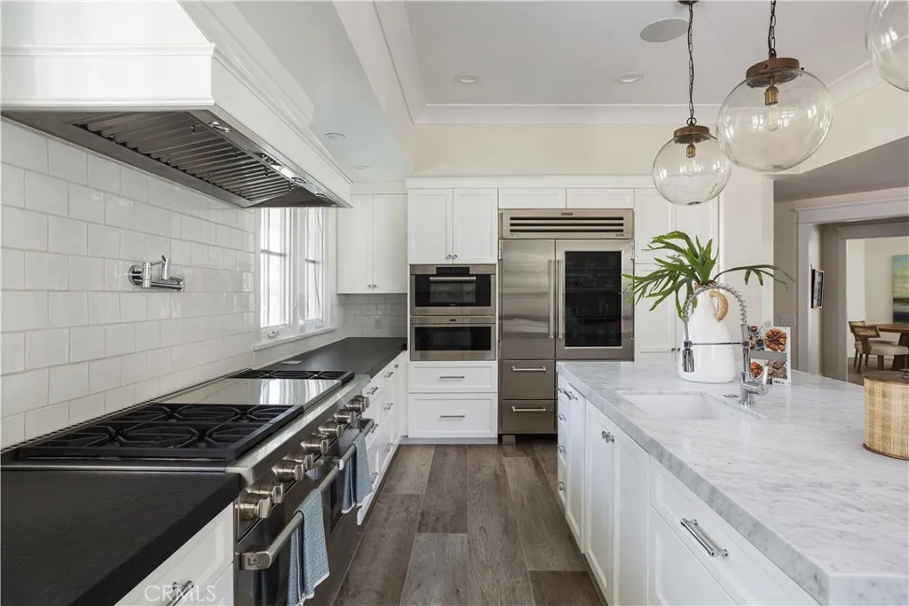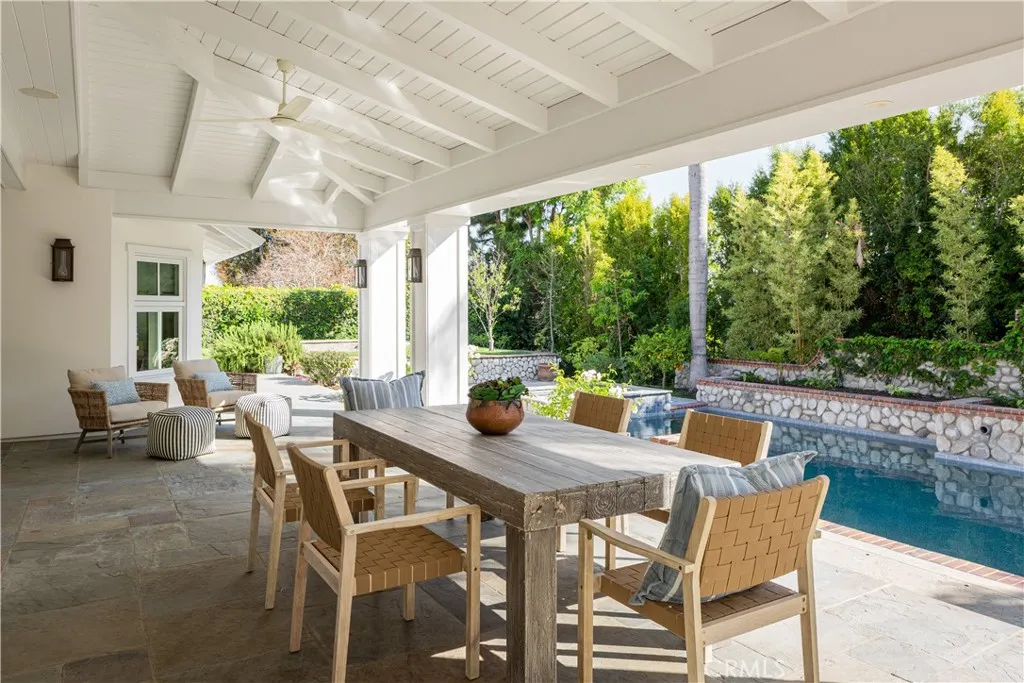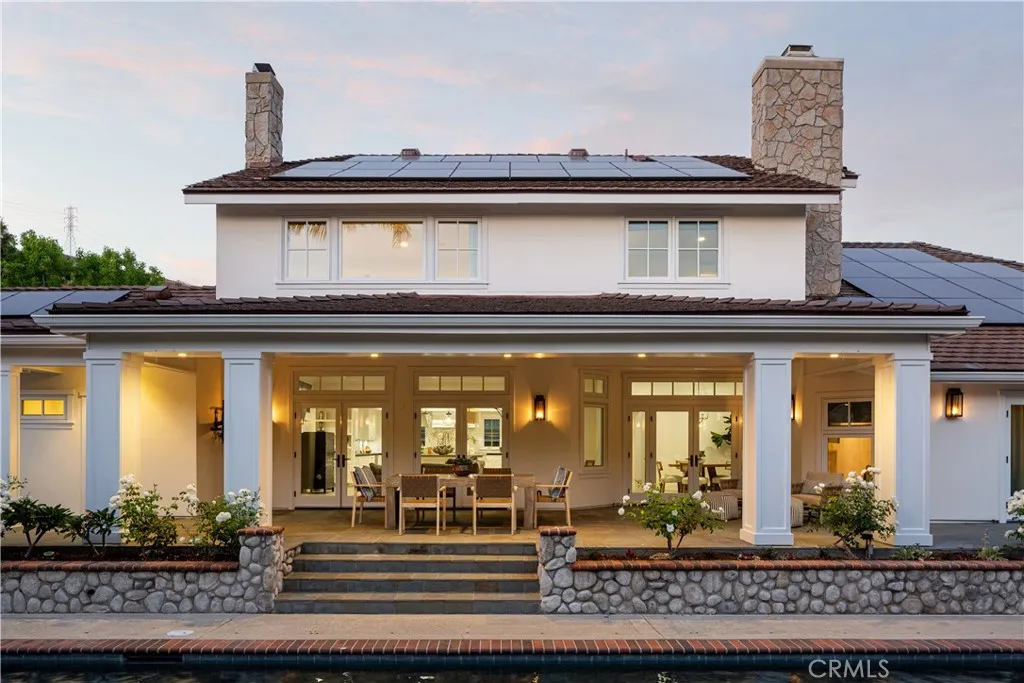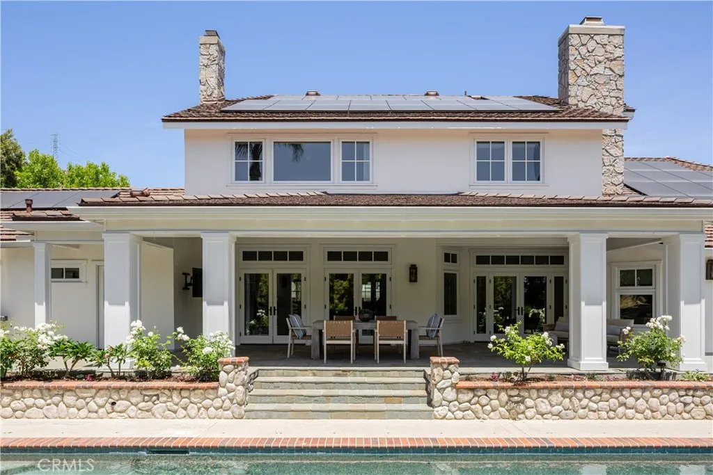 Welcome to 18732 Monte Vista Circle a refined haven nestled on a quiet cul-de-sac in the sought-after hills of Villa Park. This thoughtfully designed 4-bedroom, 3.5 bathroom estate blends modern elegance with timeless character, all wrapped in a serene, private setting. From the moment you arrive, youre greeted by a stately facade, manicured grounds, and curated details that hint at the sophistication within. Step inside to soaring ceilings, abundant natural light, and a spacious, open-concept layout that seamlessly connects living, dining, and entertaining spaces. At the heart of the home lies a stunning chefs kitchen outfitted with premium appliances, stone countertops, and 2 large islands ideal for serving, gathering and eating around. The kitchen flows effortlessly into a formal dining area and an expansive living room anchored by a statement fireplace. Tucked away on the main level, the luxurious primary suite feels like a five-star retreat complete with French doors that open to the verdant backyard, cozy fireplace, spa-inspired bathroom with Victoria & Albert soaking tub, walk-in shower wrapped in hand-cut Carrera tile, and a custom-designed walk-in closet. Upstairs, find 3 additional bedrooms, two well-appointed bathrooms, a dedicated office and a generous bonus room perfect for movie nights, gaming, or creative pursuits. But the real magic unfolds outdoors. Designed for year-round enjoyment, the backyard is a showpiece of California living featuring an oversized covered patio with outdoor dining and lounge areas, a sparkling heated pool and spa, built-in firepi