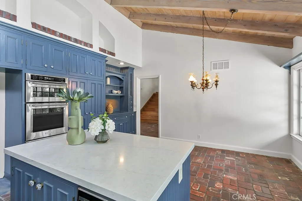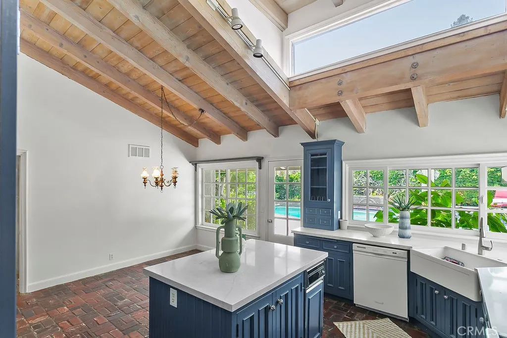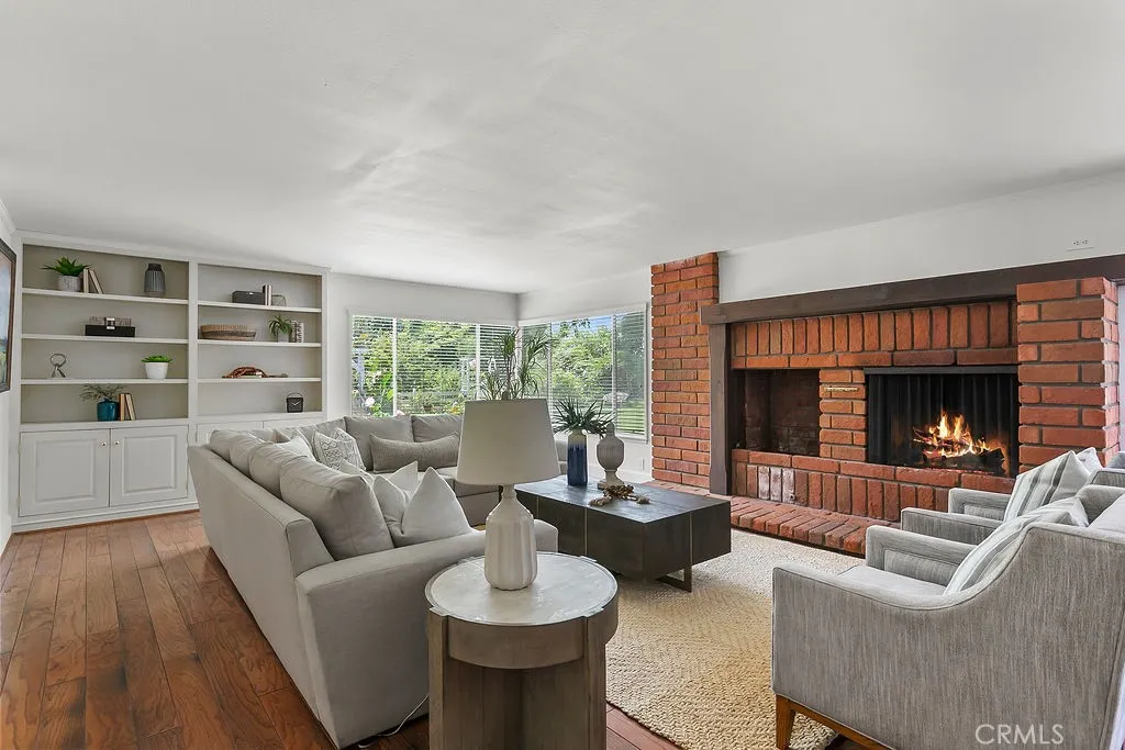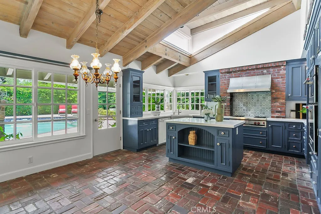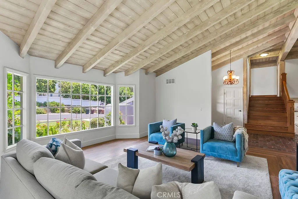 Nestled in the quiet and tranquil hills of Villa Park, this sprawling estate is full of the charm and character that defines the city in which it resides. This elegant example of the Americana dream has all the features youd expect of a home built in an era where family and tradition was the goal. Arrive to a home with huge frontage and commanding curb appeal with rolling lawns, mature trees, and crisp architectural lines. Enter through hand crafted side lit and glass inlaid front door into foyer with soaring ceilings, brick finished flooring, and exposed beams and posts creating a warm and inviting feel. The living room is light and bright with cathedral ceilings and exposed T and G wood beam ceiling details. French doors to the spacious side yard give this room a light and airy ambiance. The dining room is perfect for those special holidays and gatherings with plenty of room for 8 person dining set. The custom-built kitchen has a cozy country charm, with handcrafted cabinets, large center island, stainless steel appliances, generous dining nook, farmhouse sink, glass-inlaid upper, and elegant brick and tile inlaid hood and splash design. Skylights flood the space with natural light, while French windows offer lovely views of the sparkling pool and yard. The family room has all the characteristics for nostalgic cozy nights! An expansive brick fireplace with oversized bricks and custom firewood box gives this room a homey feeling. The family room is also appointed with w/ wood floors, built in cabinets, and oversized windows w/ views of the backyard. The spacious primary be