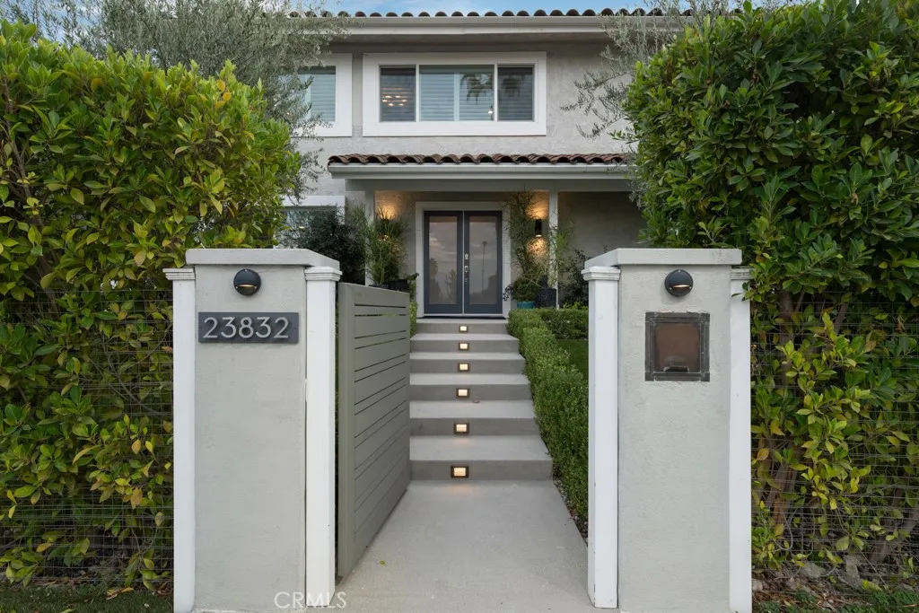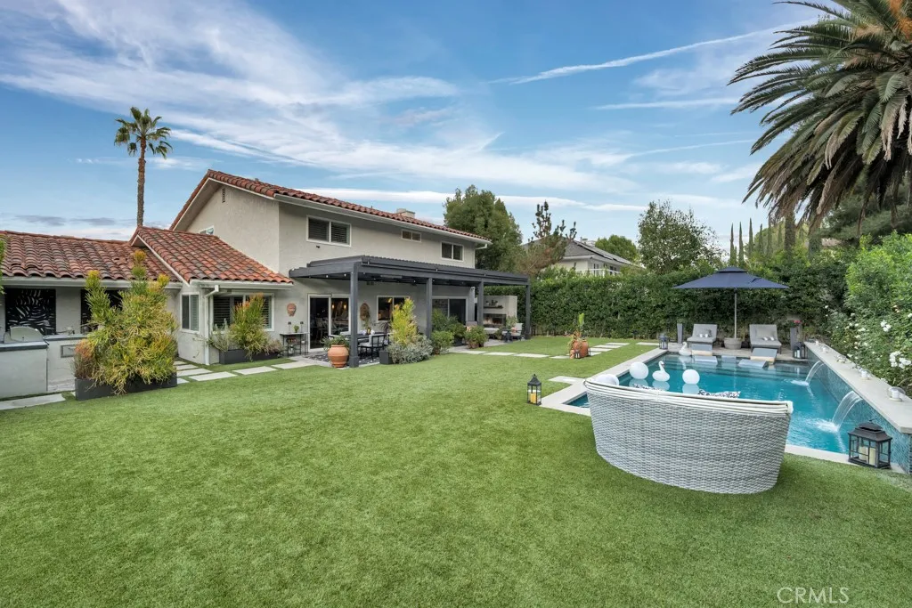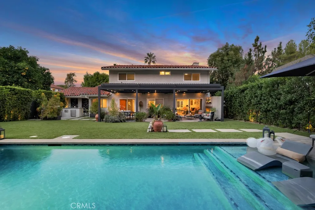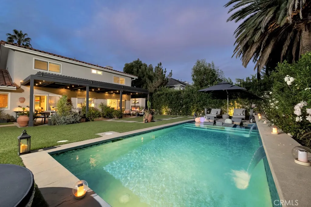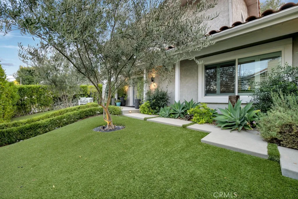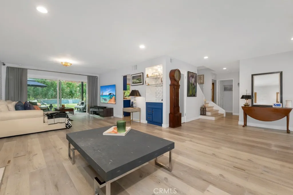 Private, Resort-Inspired Backyard Oasis - California living at its finest Highly sought-after school district. Exterior - Newly redesigned with gated entry, minimalist fencing, manicured Ficus privacy hedges, front porch with double doors, artificial lawn, landscape lighting, and lush plantings Interior -Open-concept floor plan with high ceilings, wide plank hardwood floors, energy-efficient dual-pane windows, white plantation shutters, LED recessed lighting, and central air & heat Entry & Living Areas - Expansive foyer with frameless glass staircase. Living room with abundant windows, dramatic white stone gas fireplace, and wide plank hardwood floors. Family room (or dining option) features a window wall with slider to the outdoor lounge and custom wet bar with quartz countertop Gourmet Chefs Kitchen - Custom cabinetry to the ceiling, gourmet pantry, white quartz countertops, mosaic backsplash, under-mount sink with pull-down faucet, and Viking stainless steel appliances. Quartz-crowned breakfast bar with pendant lighting Primary Suite & Spa-En Suite - Double-door entry, panoramic windows, white stone gas fireplace, custom closets. Renovated spa bathroom with dual vanities, quartz countertops, freestanding soaking tub, marble tiled shower with multiple shower heads, and additional walk-in closet Additional Bedrooms & Bathrooms - Two upstairs bedrooms with mirrored closets and hardwood floors; renovated upstairs bath with quartz vanity and custom tiled floors; downstairs guest suite with remodeled bathroom Backyard Oasis - Resort-inspired retreat with heated saltwater pool
