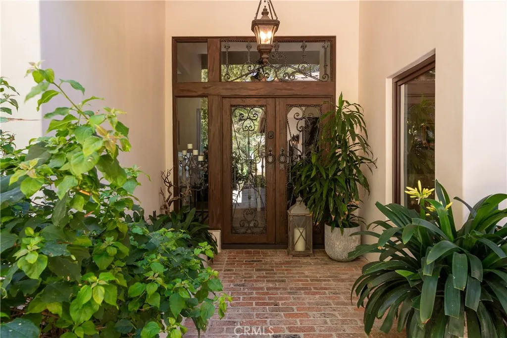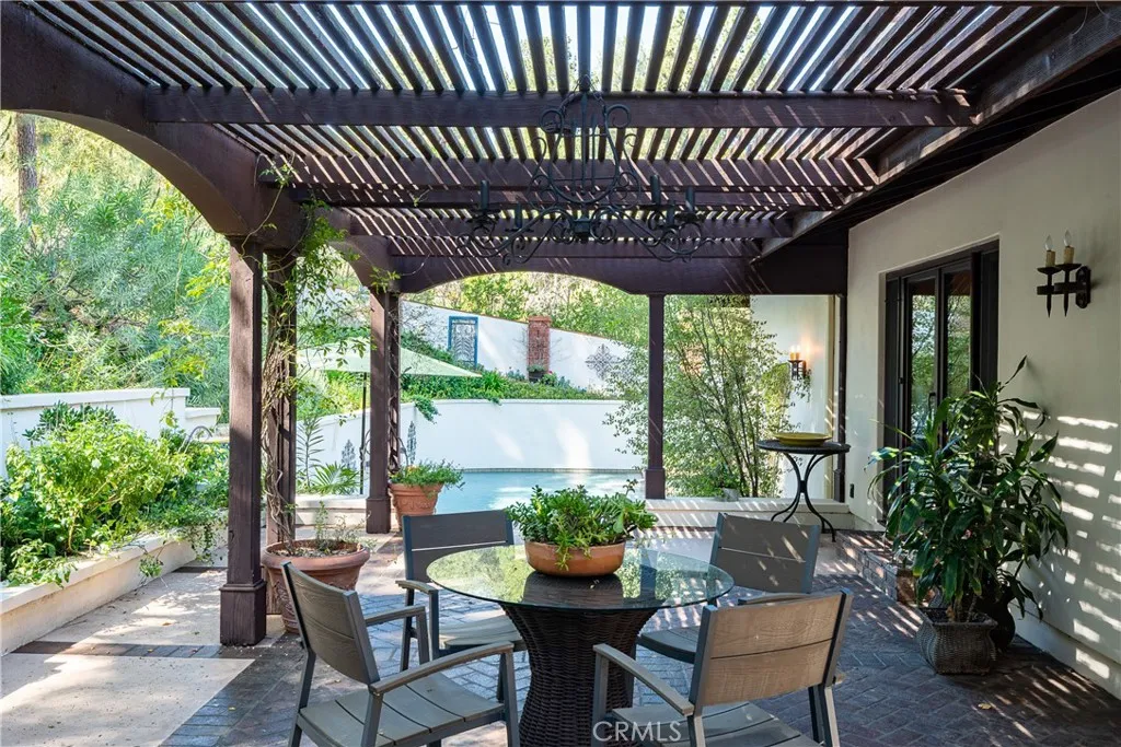 Located in the prestigious Westlake Trails community, this gated single-story estate offers exceptional privacy and timeless character in one of Westlake Villages most coveted enclaves. Set against the scenic Santa Monica Mountains and just moments from Westlake Lake and The Landing, top-rated restaurants, shopping, and hiking trails, the property blends convenience with the tranquility of a secluded natural setting. Designed with Spanish-inspired architecture and high-end finishes, the residence features travertine flooring, rich hardwood floors, and custom wood doors throughout. The chefs kitchen is equipped with premium Viking appliances, generous counter space, and a functional layout ideal for entertaining. Large windows frame beautiful views of the lush, mature landscaping and PebbleTec pool, creating a seamless indoor-outdoor connection and filling the space with natural light. The homes thoughtfully designed layout includes a private bedroom wing with guest suites and a luxurious primary suite retreat. The spacious primary suite features its own secluded patio and a spa-like bathroom complete with a fireplace, dual vanities, soaking tub, walk-in shower, and large his-and-hers closets. The resort backyard offers multiple patios and entertaining spaces surrounded by mature oak trees and natural greenery, providing a peaceful and private outdoor setting. The PebbleTec pool is perfectly positioned within the landscape to create a tranquil retreat. Perched above the property is a detached guest house with a kitchenette and full bath, ideal for guests, a home office, gym,
