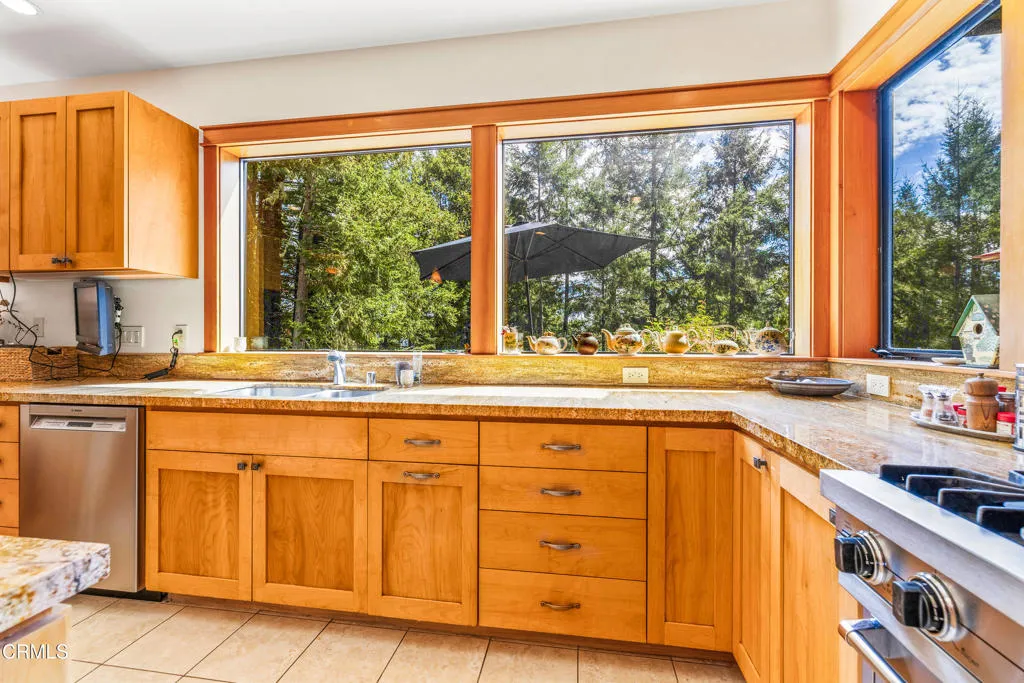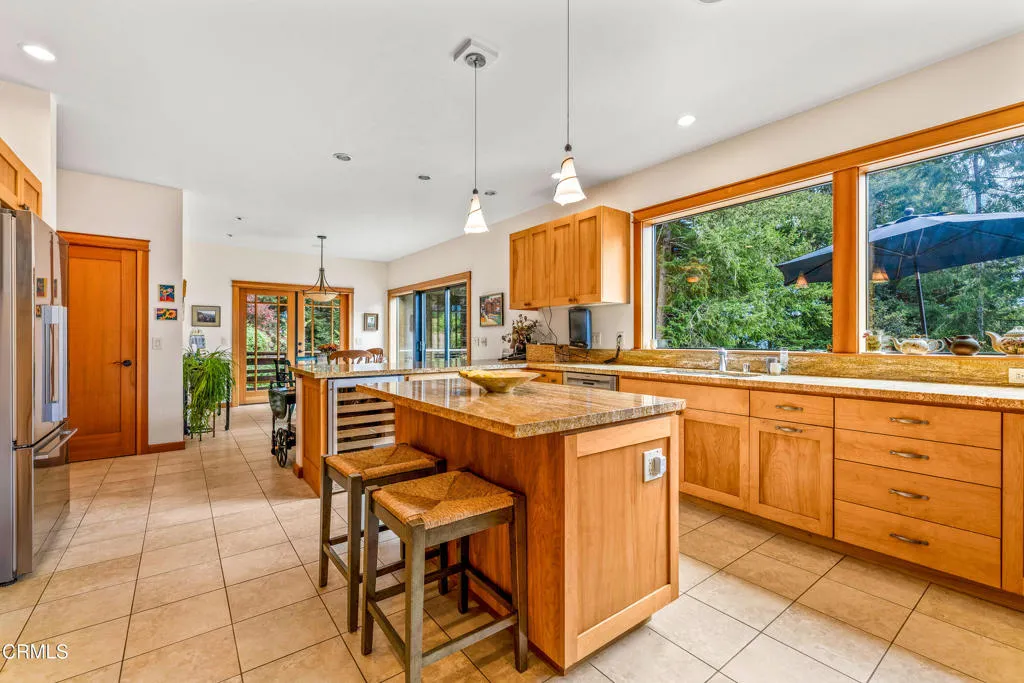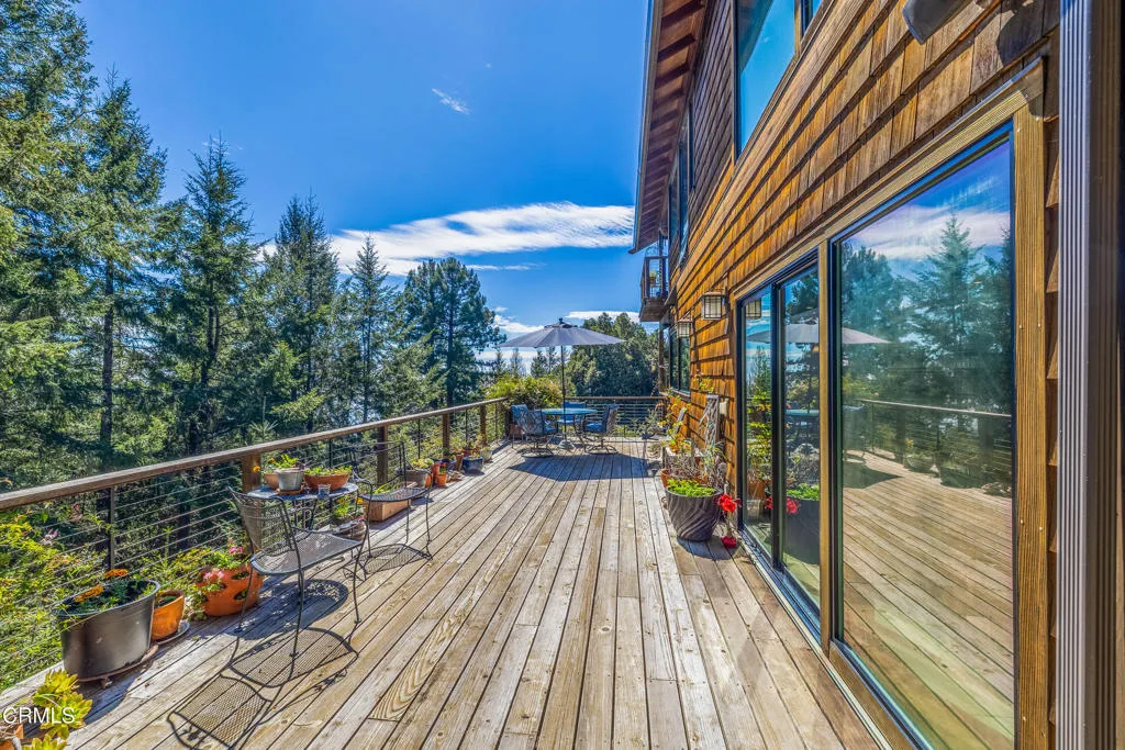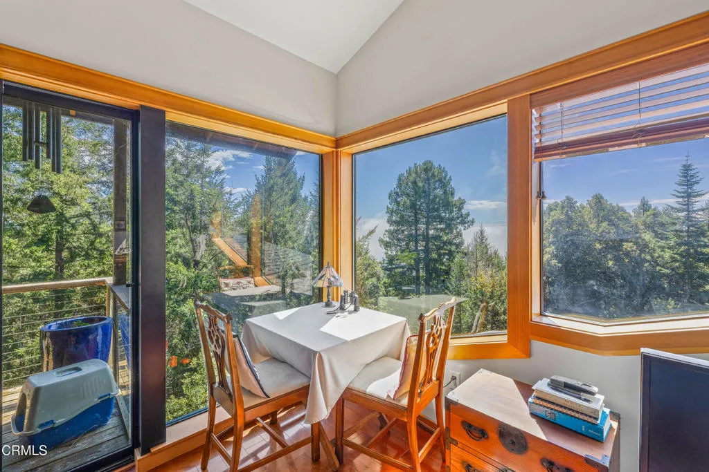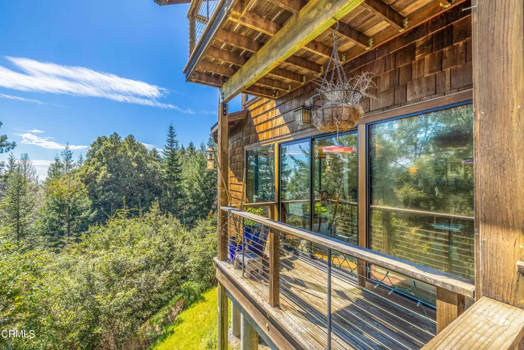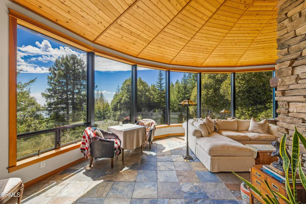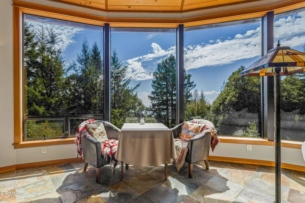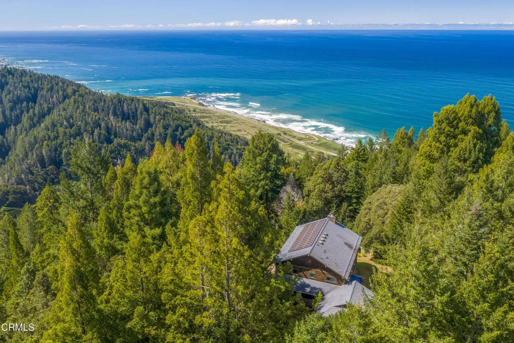 Perched along the coveted Alviso Ridge, where redwood forest meets the Pacific horizon, this exceptional 20-acre coastal retreat offers a rare blend of privacy, scale, and true self-sustaining living. Designed and built in 2009, the 4,220 sq. ft. residence is a sanctuary for those seeking independence without sacrificing refinement. From the moment you arrive, the artisan front door, adorned with etched gold leaf, sets the tone for a home defined by craftsmanship and intention. Inside, the architecture opens into a dramatic Great Room, where a 13-foot chimney anchors the wood-burning fireplace and a sweeping semicircular wall of windows invites the natural landscape in. Originally designed to capture expansive ocean views, the setting offers a unique opportunity to selectively clear or top trees on the property to reintroduce striking blue water vistas. The heart of the home is both inviting and functional--a warm, expansive kitchen outfitted with Viking appliances, granite countertops, oiled birchwood cabinetry, and a walk-in pantry, seamlessly connecting to a sunlit breakfast alcove and south-facing patio. Here, mornings begin in stillness and evenings unfold beneath vivid sunsets and an endless canopy of stars. A library and sitting room with propane fireplace offer additional spaces to unwind. The primary suite is a private haven, complete with ocean views, dual walk-in closets, and a spa-inspired bath featuring a deep soaking tub and walk-in shower. Radiant floor heating throughout ensures year-round comfort. Engineered for autonomy, the property delivers a truly self-