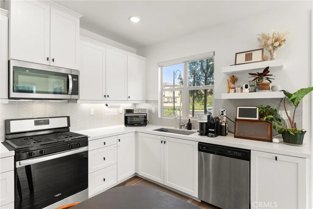 This is probably the best location at the Groves in this layout. This is a two level townhome with 1br/1.5ba situated in a corner that brings in a lot of natural light. The first level with beautiful laminate flooring features an open kitchen with stylish white shaker cabinets, quartz countertops, tile backsplash and stainless steel appliances. In addition there is a spacious living room and a convenient powder room for your guests. The direct access garage has a ready connection for level 2 charging for your electric vehicle. The second floor has a spacious laundry room with built in shelves, a bedroom with sliding door closet and a bathroom with enclosed shower. The Grove is a newer community that has all the amenities that you may need. It has 2 swimming pools, playgrounds, a dog park, fitness/gym room, lounge, recreation room and a putting green. A shopping center is within walking distance and it is anchored by a Stater Brothers Market and there are popular eateries like In-N-Out burger, Chipotle, CAVA, Raising Cane Chicken, Philz coffee, Rodeo 72 market and more. Freeway is just two miles away. Do not miss this great location!