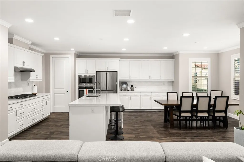 Welcome to 16366 Cameo Court in the highly sought after Cameo community of Whittier. Built in 2017, this beautifully maintained 5 bedroom, 4.5 bathroom home offers 3,579 square feet of thoughtfully designed living space. The open concept layout features a versatile flex room near the entry, an expansive great room filled with natural light, and a gourmet kitchen with quartz countertops, stainless steel appliances, generous cabinetry, and an oversized island ideal for entertaining. A desirable main level bedroom with ensuite bath provides flexibility for guests or multigenerational living. Upstairs includes four additional spacious bedrooms, a large loft perfect for a secondary living area or media space, and an oversized laundry room. A whole house fan enhances comfort and efficiency. Residents enjoy resort style amenities including pool, spa, BBQ areas, playground, and beautifully maintained green space, offering an exceptional lifestyle in one of Whittiers premier newer communities.