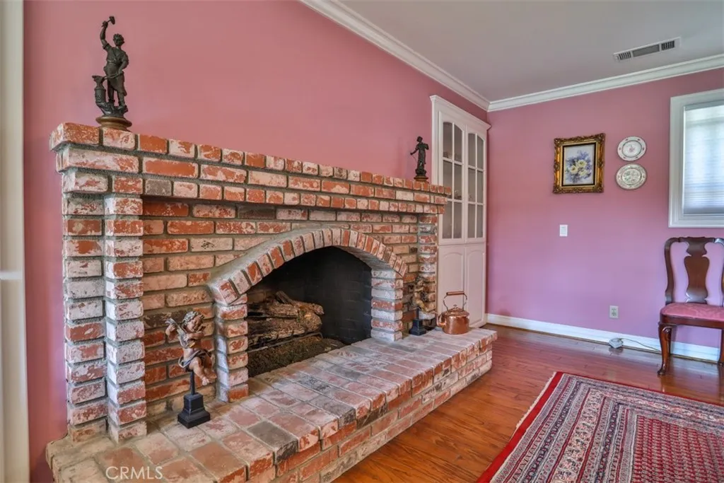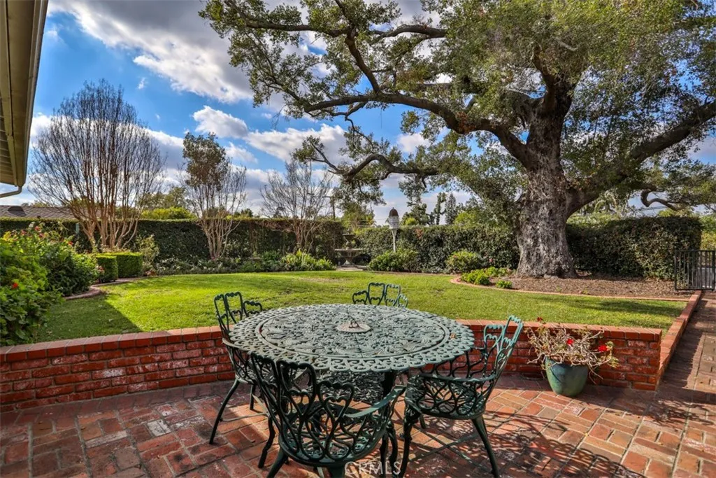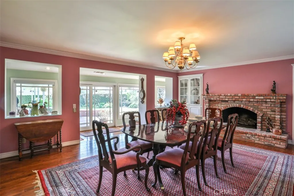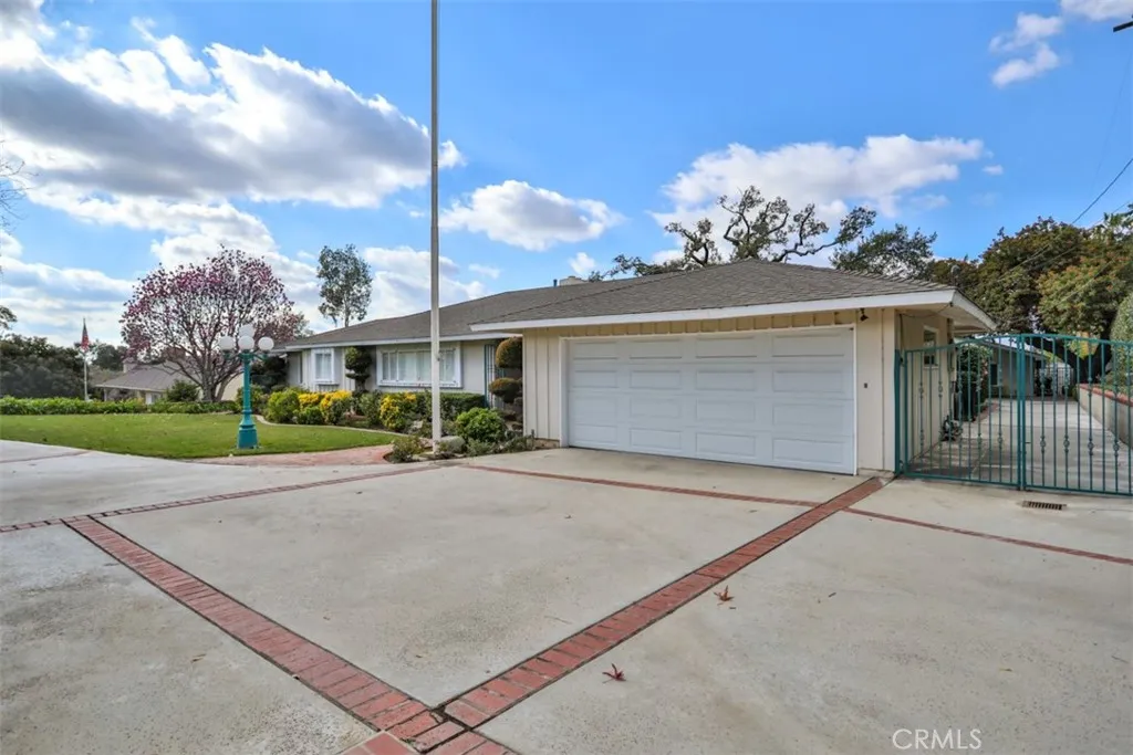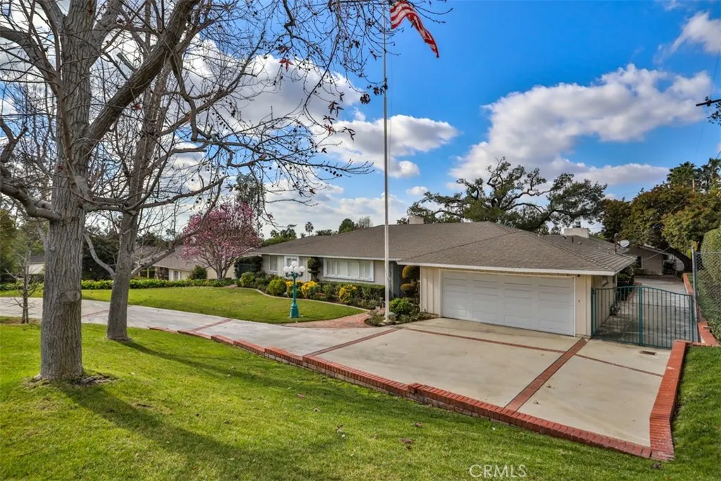This exceptional custom estate in Friendly Hills is situated on one of Whittier's most coveted streets. The single-level ranch home creates a warm and inviting atmosphere, highlighted by stunning hardwood floors throughout the main living area and three elegant fireplaces with custom built-inslocated in the formal living room, formal dining room, and family room with bar. The kitchen boasts beautiful white cabinetry with ample storage, Corian countertops, an island with seating, and a dedicated desk area. You'll love the primary suite, a luxurious retreat featuring extensive closet space, a private sitting area for applying your makeup and curling your hair, and direct access to the inviting backyard, perfect for enjoying your morning coffee while listening to the birds sing. The property includes a two-car front-facing garage, an extra-long side driveway leading to a four-car garage, and a dedicated craft/hobby room with its own entrance. The expansive yard is divided into two sections: the upper yard, located just off the main living area, features a covered patio and brick walkways, while the lower yard holds potential for development, such as a pickleball court, swimming pool, or accessory dwelling unit for the mother-in-law. This ranch-style home presents limitless possibilities and is one of the few homes with such extensive amenities in the area. Come and see for yourself, discover the endless possibilities this home offers, and be captivated by its unique charm.