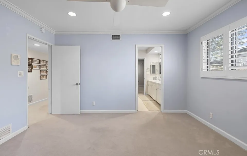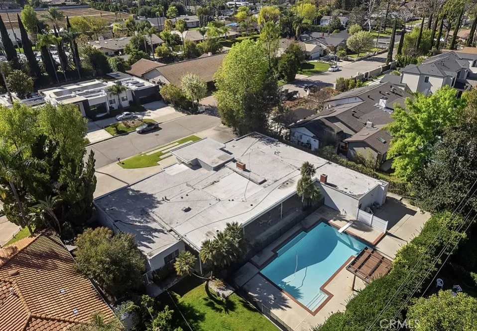 This single-story midcentury modern residence offers approximately 4,400 square feet of living space on an expansive .38-acre cul-de-sac lot, ideally located south of Ventura Boulevard in Woodland Hills. The functional floor plan includes five bedrooms and five bathrooms, spacious living and family rooms with fireplaces, and a formal dining room suitable for entertaining. The kitchen features custom cabinetry, built in refrigerator, a walk-in pantry, tile flooring, and a breakfast area with direct access to the family room. The backyard offers a pool, grassy area, basketball half court, and a large, covered patio, providing multiple options for outdoor use. Additional features include a primary suite with fireplace, sitting area, and dual walk-in closets, a laundry room with sink and cabinetry, recessed lighting, copper plumbing, and a three-car attached garage. Conveniently located near shopping, dining, and local amenities, this property provides the benefit of single-level living on a generous lot.