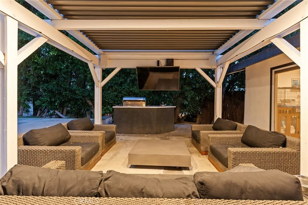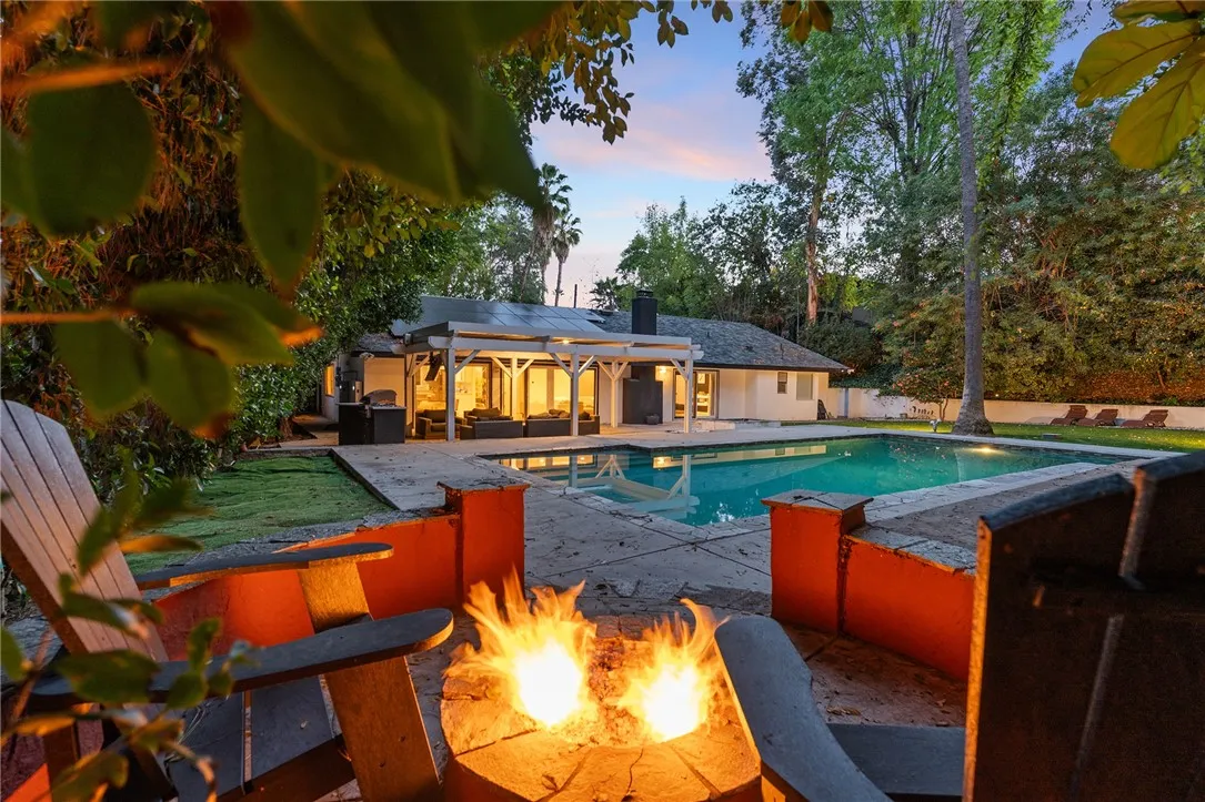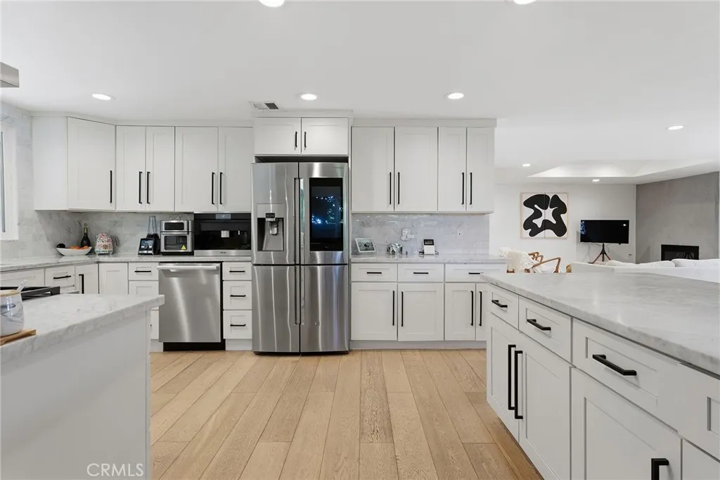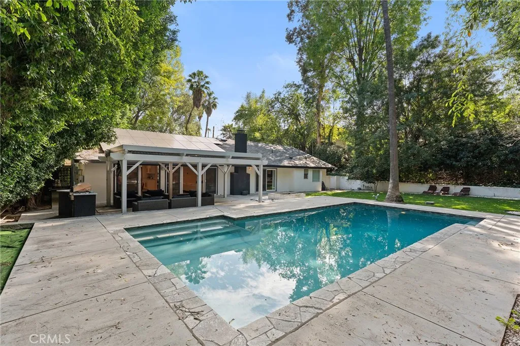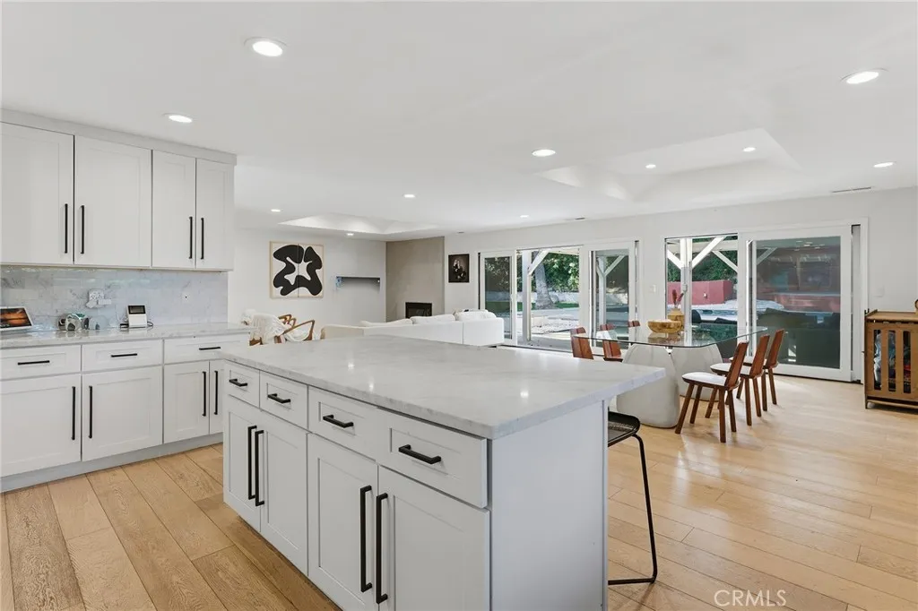 Extremely private single story gated estate located on a sprawling 20,000 SF lot South of the Blvd in the highly desirable neighborhood of Vista De Oro. The property sits far back from the street behind an automatic security gate and mature privacy hedging. An oversized driveway can accommodate parking for large gatherings and leads to the attached 2-car garage with 2 EV chargers. The grand double door entry foyer opens to a light and bright completely open floor plan with direct sight of the backyard setting an immediate tone for indoor/outdoor entertaining. The spacious family room has a plaster finished fireplace, tray ceiling, sliding glass doors that open to the yard, and wide plank hardwood floors found throughout. The equally large dining room also features a decorative tray ceiling and another glass slider that opens to the yard. The completely remodeled expansive kitchen opens directly to the living spaces and boasts center island with breakfast bar seating, Carrera marble counters & backsplash, custom soft close cabinetry, stainless appliances including a Miele range, and separate walk-in pantry. There are three well appointed bedrooms each with their own en-suite bathrooms. The primary bedroom features double door entry, glass slider that opens to the yard, large walk-in closet, and private luxurious remodeled bathroom with dual sinks, spa tub, and walk-in shower. The second bedroom suite has closet with custom built-ins and private remodeled bathroom with tub and shower. The third bedroom is located off the entry making it the ideal office or guest suite with ac