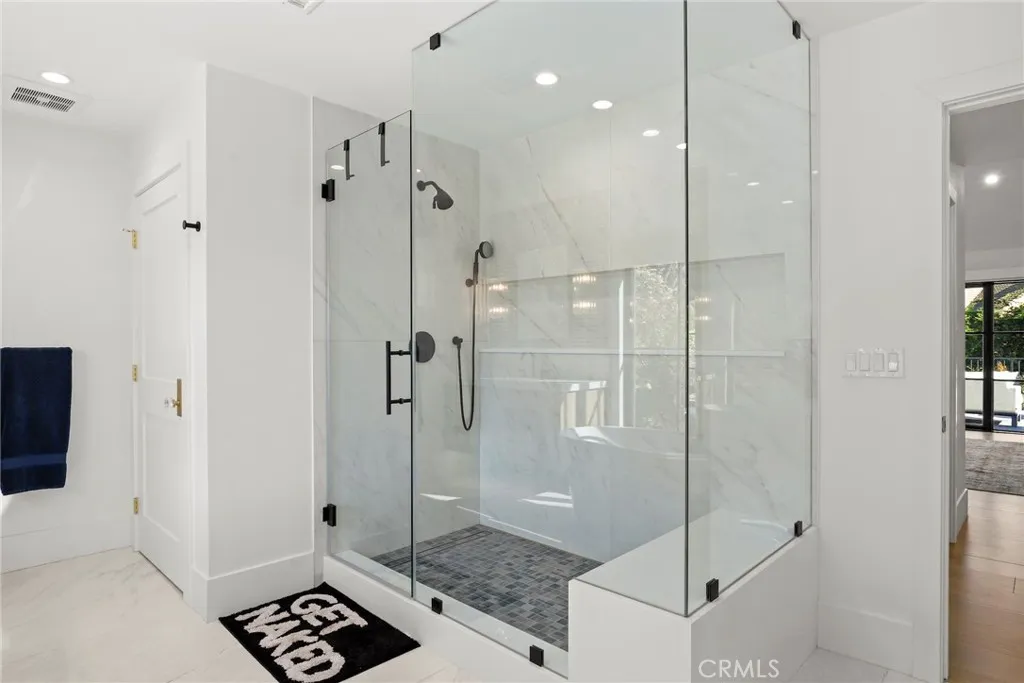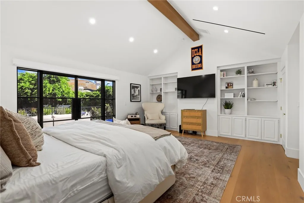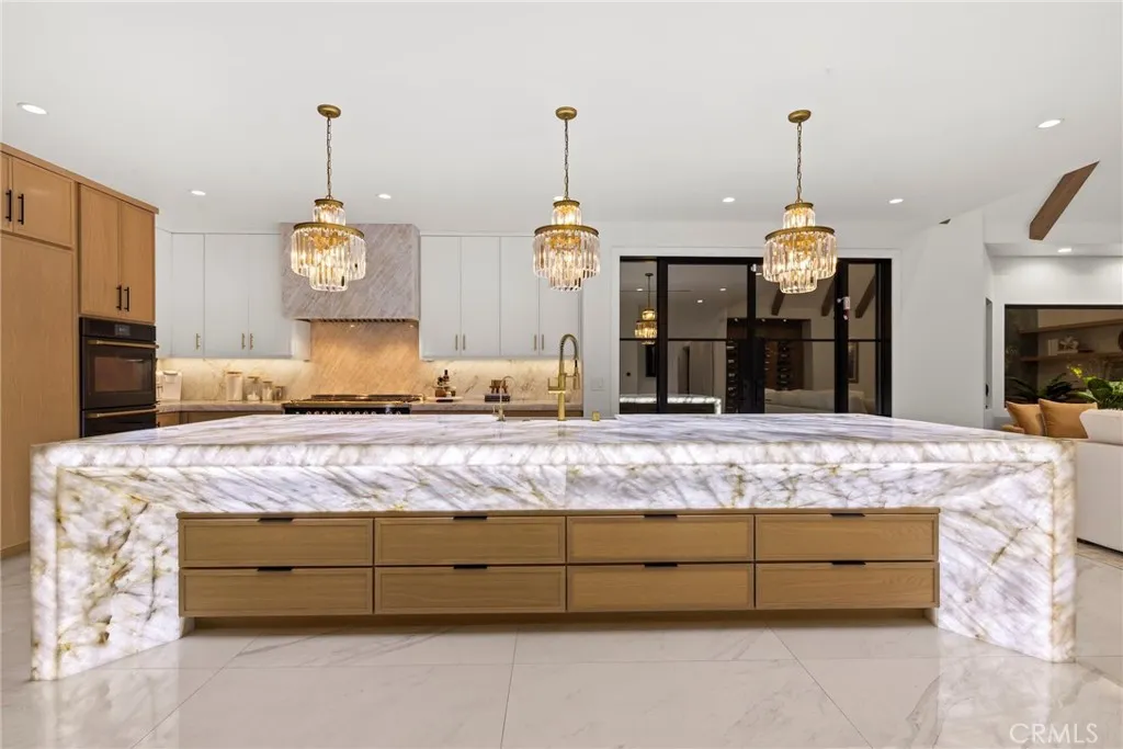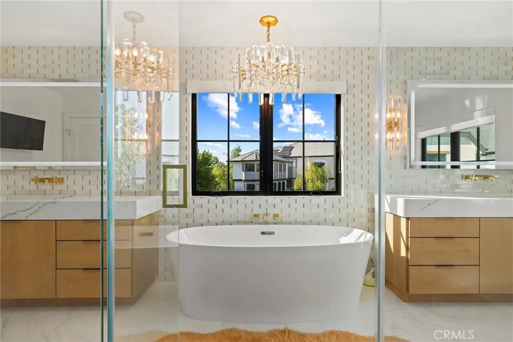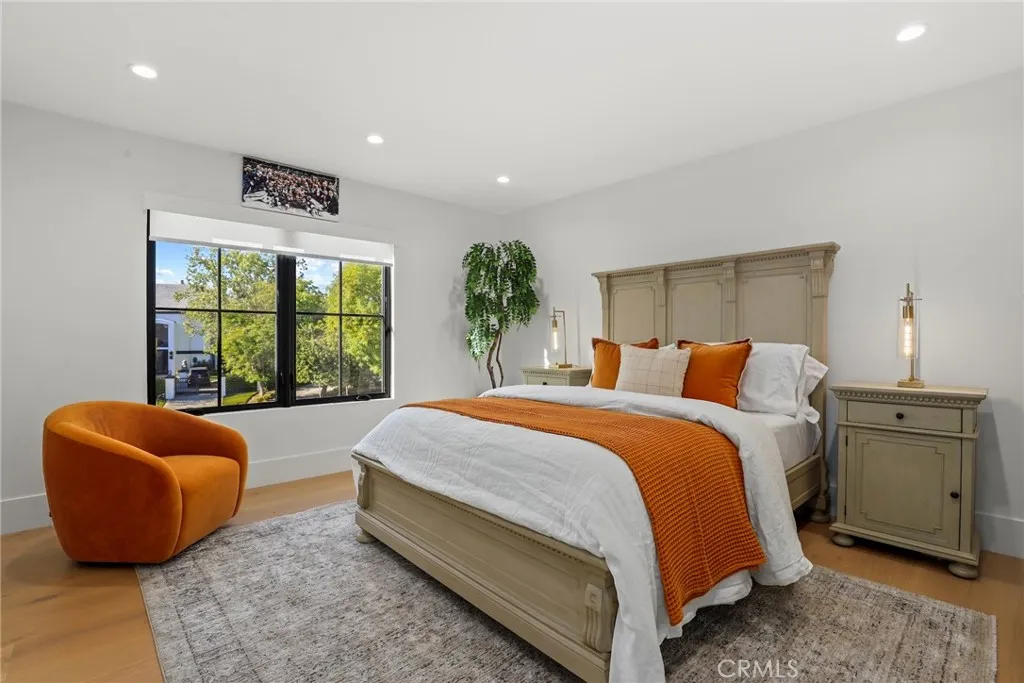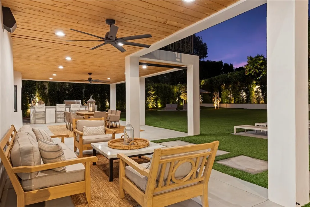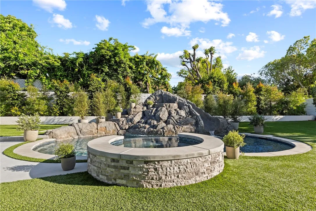 Behind the gates of Westchester County Estates, south of the Boulevard, at the end of a quiet cul-de-sac, sits one of the largest and most impressive properties in the community. Set on an expansive 17,000+ sq ft flat lot, this reimagined estate blends timeless Tudor-inspired architecture with a completely modernized design and lifestyle. Spanning over 5,000 sq ft, the home offers 5 bedrooms, all en-suite, including a main-level suite and 4 additional suites upstairs, each with custom walk-in closets. Two true primary suites are offered, with select bedrooms featuring balcony access overlooking the resort-style backyard. The main living spaces are both grand and intentional with a formal dining room and separate living room offering flexibility for entertaining or private use, while the expansive family room showcases dramatic floor-to-ceiling blue stone and opens to the heart of the home, the kitchen. Designed to impress, the kitchen features a 14-foot stone island with custom lighting, integrated appliances, custom cabinetry, and a hidden walk-in pantry. The backyard is a true entertainers retreat with a brand-new pool and adult water slide, covered patio with wood ceilings, built-in BBQ with Viking appliances, multiple areas for dining, lounging, and play, plus an infrared sauna. The grounds offer room for a future ADU, casita, sport court, or wellness space. Drought-tolerant landscaping and artificial turf provide beauty with ease. Originally built in 1985, the home underwent a true down-to-the-studs transformation beginning in 2023. Nearly every element was rebuilt, re