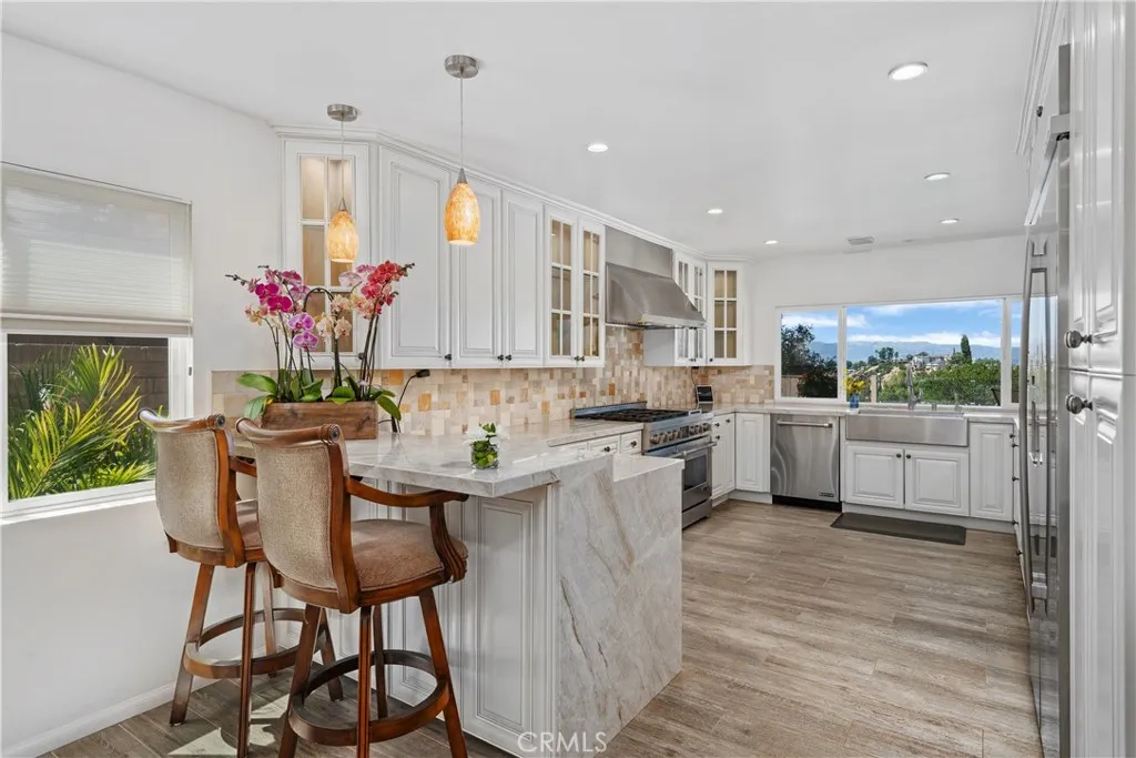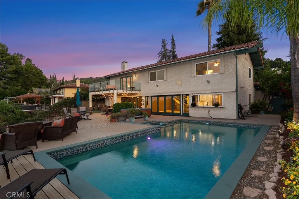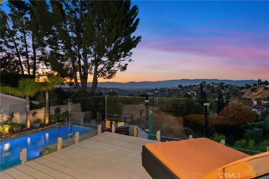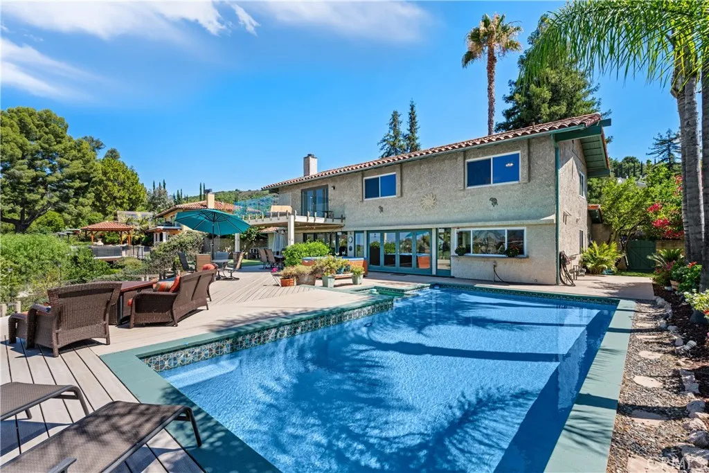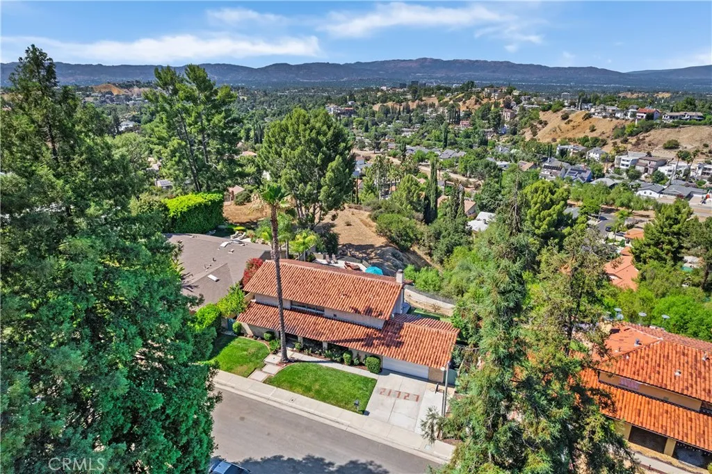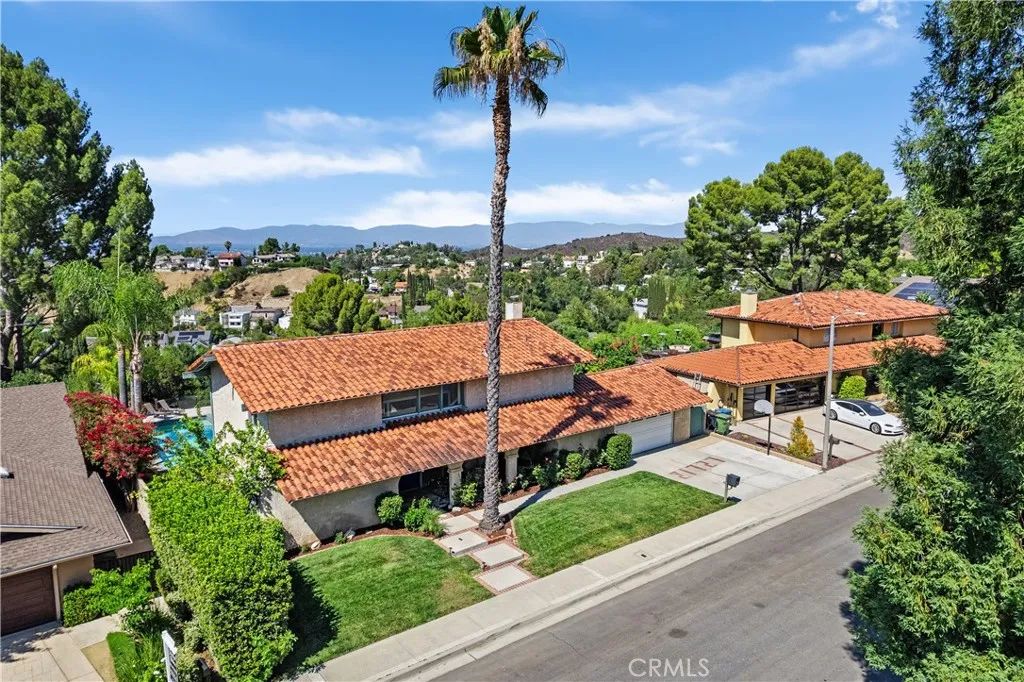 Huge reduction! Spanish Style, VIEW home with 4 bds & 3-baths situated in the sought-after Woodland Crest neighborhood of Woodland Hills. From the moment you arrive, the slate-covered front porch and beautifully landscaped dry creek bed create an inviting and picturesque curb appeal. Step through double doors into a dramatic two-story entryway, where walls of glass draw your eyes to sweeping, unobstructed forever views (backs Conservancy land). Indoor elegance meets the breathtaking beauty of nature in perfect harmony. Designed for both intimate living and grand entertaining, this home has been the backdrop for countless cherished memories. At the heart of the home is a fully renovated chefs kitchen that impresses with every detail. Outfitted with top-of-the-line Jenn-Air appliancesincluding a 6-burner range with griddle and a beverage refrigeratorit features custom cabinetry, Quartzite countertops, a tumbled tile backsplash, a breakfast bar, and a cozy dining nook. The expansive family room is a warm, welcoming retreat with built-ins and a striking stone fireplace with a raised hearth. Upstairs, the private primary suite offers soaring vaulted ceilings, generous closet space, and a beautifully updated en-suite bath with dual vanities. Step onto your private balcony to savor peaceful sunrises and sunsets over the city and mountain skyline. Each secondary bedroom is spacious and light-filled, complete with ceiling fans and mirrored wardrobes. Two-story windows bathe the home in natural light, creating a bright, airy ambiance throughout. Step outside into an entertainers para