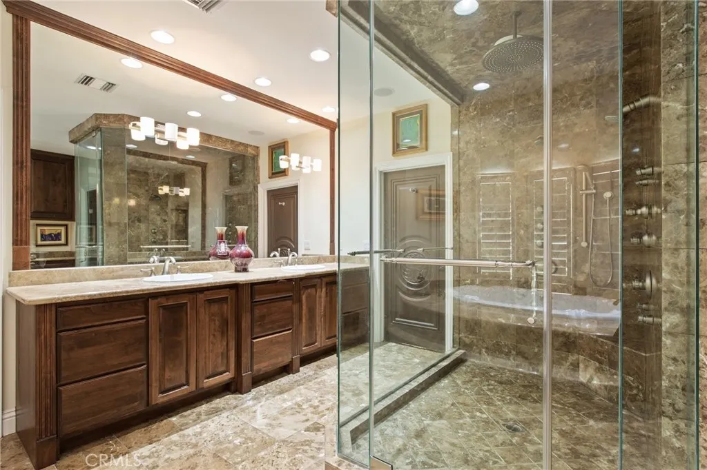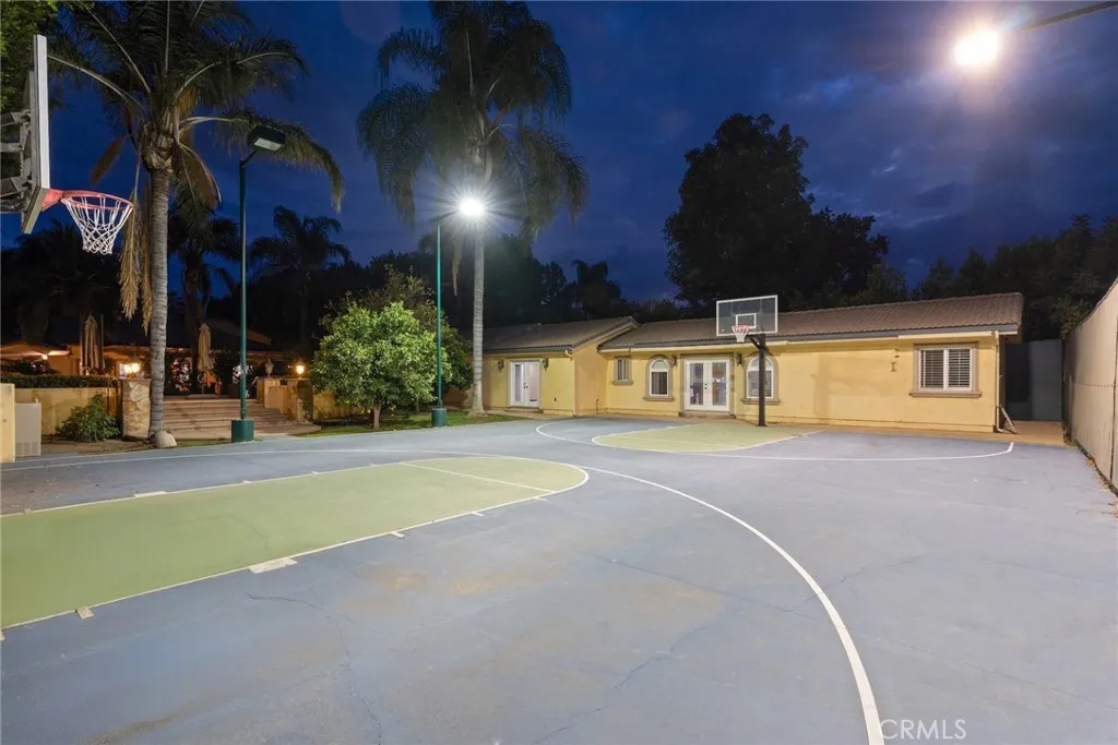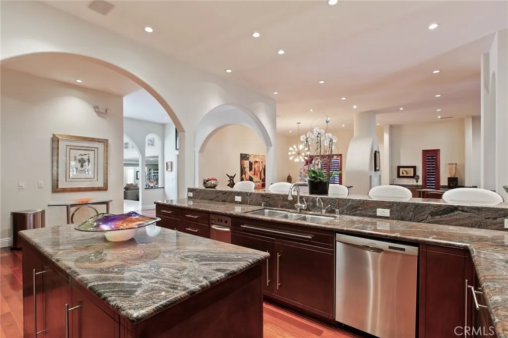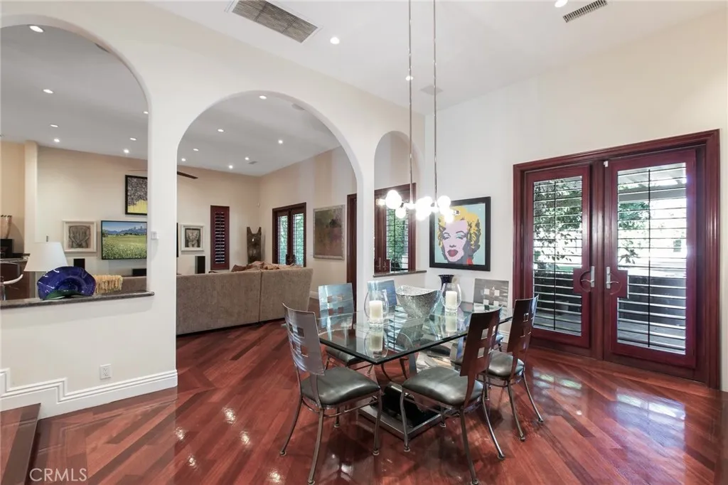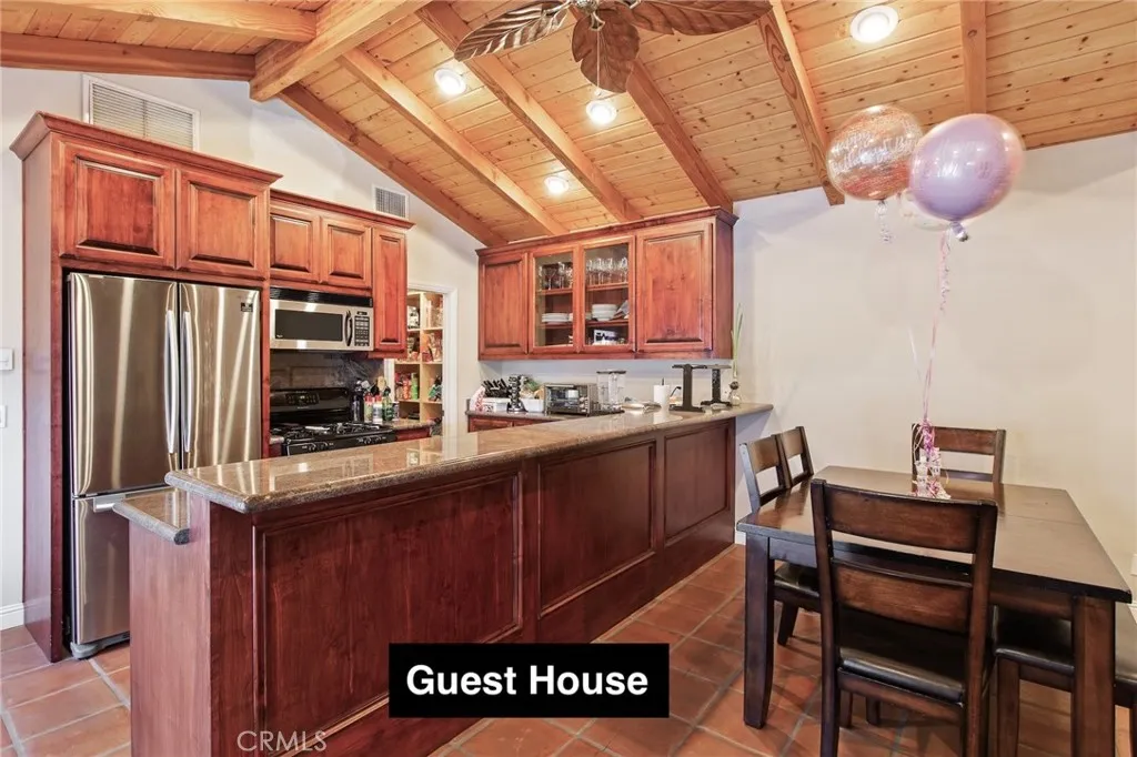 Custom gated Walnut Acres Italian Villa featuring a primarily one level main residence plus a detached oversized guest house situated on an expansive 26,000 SF flat lot. The private estate is secured behind an automatic security gate with separate pedestrian access and lush landscaping including full growth hedging and towering mature palms. The front yard features a sprawling driveway that can accommodate parking for large scale events and RVs/boats with a separate additional long gated driveway that leads to a covered carport and 2-car garage. Step inside to find a completely open concept floor plan with architectural design elements and designer finishes. A massive grand entry foyer with soaring ceiling and skylight basks the space with wonderful natural light. The foyer opens to a large great room with French doors that open to the backyard. Separate sitting and family rooms share a double-sided fireplace and wet bar. The vast chefs kitchen is highlighted by a sushi bar inspired wraparound countertop peninsula and boasts Sub Zero 36 column fridge & freezer and Viking range with double ovens & 6-burner grill + griddle. The formal dining room has built-in storage cabinetry and French doors that open to the yard. A separate living room off the entry features fireplace, built-ins, and a second wet bar. The entire second level is dedicated to a luxurious primary suite featuring an enormous bedroom with sitting room/office, wet bar, fireplace, front & back balconies, large walk-in closet, storage room with laundry hookups, and spa-like bathroom with dual sinks, steam shower,